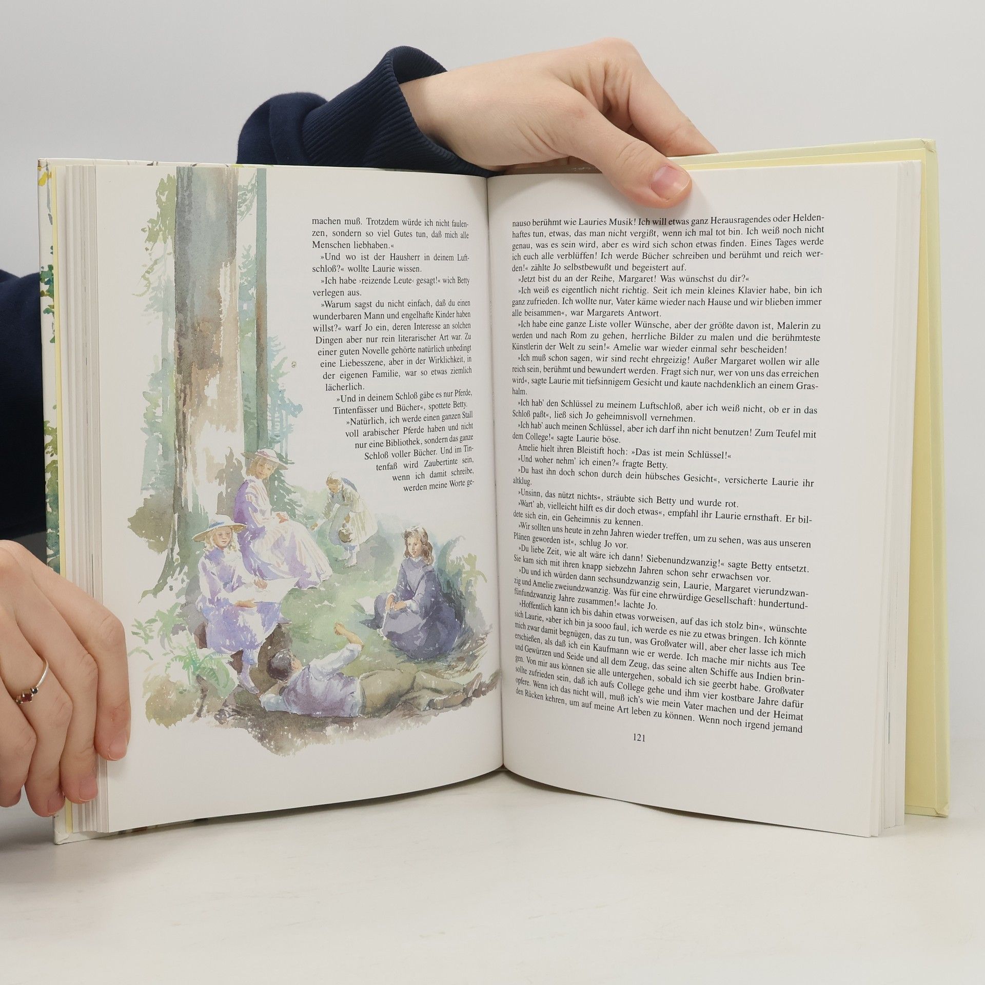 Spannend und einfühlsam erzählt Louisa May Alcott das Leben der Familie March in der Zeit des amerikanischen Bürgerkriegs. Der Alltag der vier Schwestern ist turbulent. Missverständnisse, Rivalitäten und Empfindlichkeiten sorgen für Aufregung. Jo ist außer sich, als Amelie ihr selbst geschriebenes Buch aus Wut verbrennt. Betty fällt auf einen Streich des Nachbarsjungen herein. Amelie muss ihre kandierten Zitronen aus dem Fenster des Klassenzimmers werfen, und Margret wird schwer krank, als die Mutter fort ist. Doch letztlich wird das Familienleben durch Vertrauen, Zuneigung und den Wunsch nach Versöhnung geprägt. Und alle erwarten sehnlichst die Rückkehr des Vaters aus dem Krieg. Das Leben der damaligen Zeit hat die Illustratorin Dinah Dryhurst in zarten Aquarellen und detaillierten Strichzeichnungen lebendig und eindrucksvoll nachempfunden.