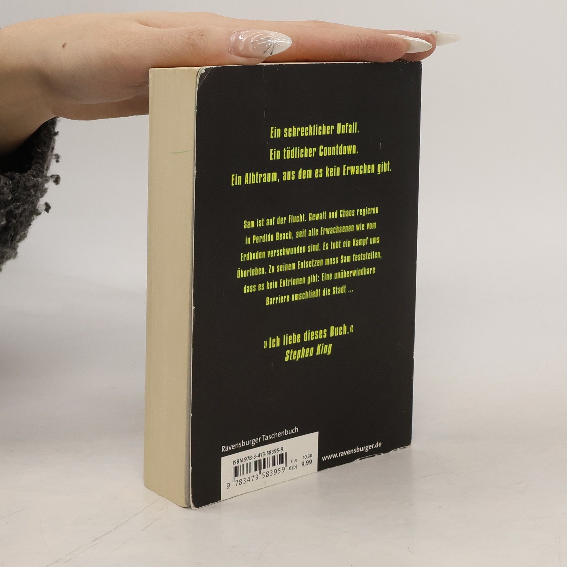 Das Leben in der beschaulichen Kleinstadt Perdido Beach wird für Sam und seine Freunde zum Albtraum: Plötzlich verschwinden alle Bewohner spurlos, die älter als fünfzehn Jahre sind. Eine gigantische Mauer umschließt die Stadt. Es gibt kein Entrinnen, nur die nackte Angst, denn schon bald ziehen marodierende Banden durch die Straßen. Ein erbitterter Kampf ums Überleben beginnt - und ein Kampf gegen die Zeit: Sam wird in 299 Stunden selbst fünfzehn ...