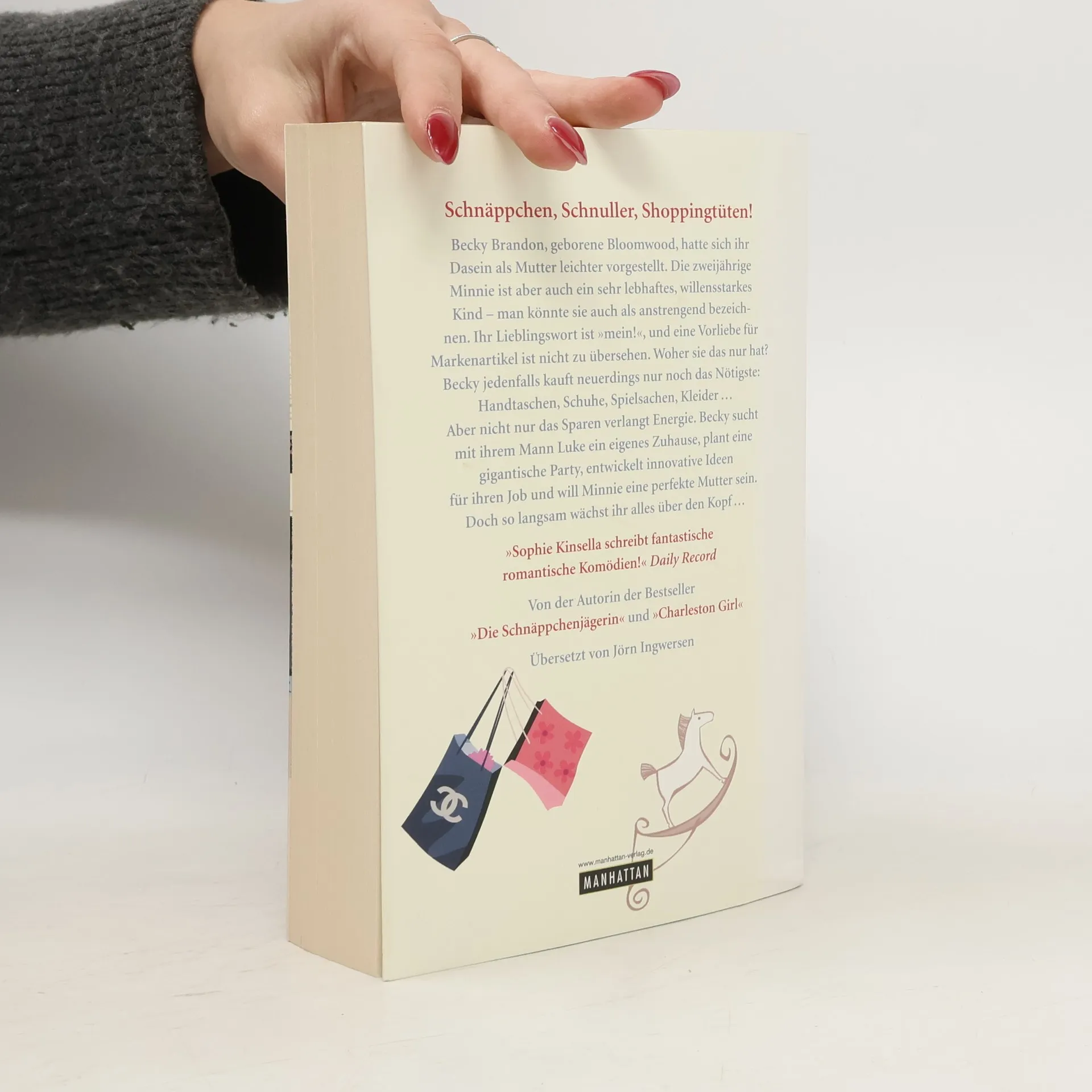 Schnäppchen - Schnuller - Shoppingtüten! Becky Brandon, geborene Bloomwood, hatte sich ihr Dasein als Mutter leichter vorgestellt. Die zweijährige Minnie ist tatsächlich ein sehr lebhaftes, willensstarkes Kind - man könnte sie auch als Teufelsbraten bezeichnen. Ihr Lieblingswort ist 'Meins!', und eine Vorliebe für Markenartikel ist nicht zu übersehen. Woher sie das nur hat? Becky jedenfalls kauft angesichts der Krise nur noch das Notwendigste - Handtaschen, Schuhe, Spielsachen für Minnie. auch die Firma ihres Mannes leidet unter der Wirtschaftslage, und um Luke aufzuheitern, plant Becky heimlich eine Party zu dessen Geburtstag. Inzwischen soll die aus dem Fernsehen bekannte 'Nanny Sue' aus Minnie einen Gemüse liebenden Wonneproppen machen. Kann das alles gutgehen?