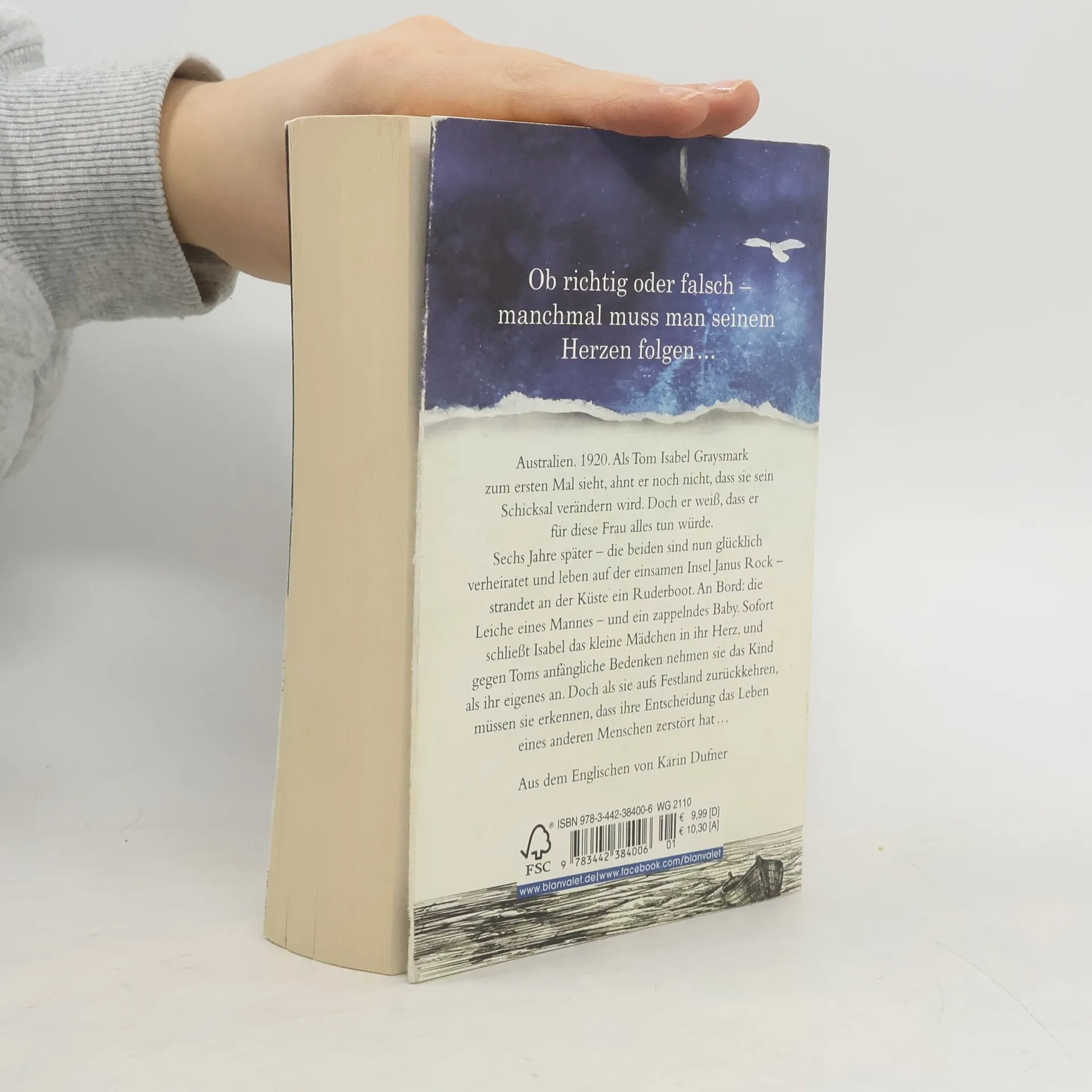 Eine Liebe so unendlich wie das Meer … Australien. 1920. Als Tom Isabel zum ersten Mal sieht, ahnt er noch nicht, dass sie sein Schicksal verändern wird. Doch er weiß, dass er für diese Frau alles tun würde. Sechs Jahre später – die beiden sind nun glücklich verheiratet und leben auf der einsamen Insel Janus Rock – strandet an der Küste ein Ruderboot. An Bord: die Leiche eines Mannes – und ein zappelndes Baby. Sofort schließt Isabel das kleine Mädchen in ihr Herz, und gegen Toms anfängliche Bedenken nehmen sie das Kind als ihr eigenes an. Doch als sie aufs Festland zurückkehren, müssen sie erkennen, dass ihre Entscheidung das Leben eines anderen Menschen zerstört hat …