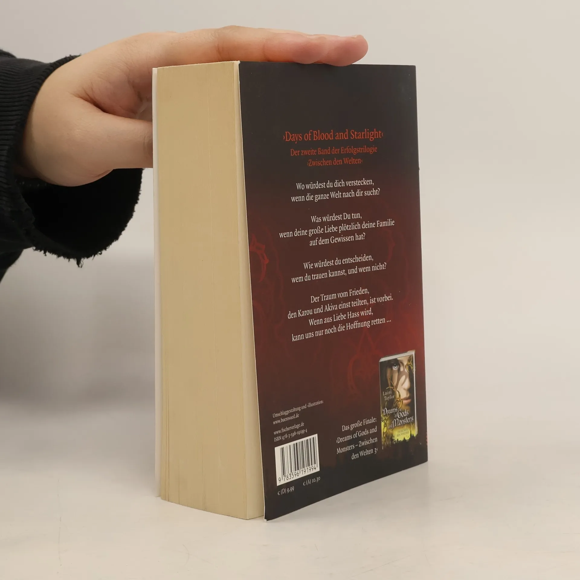 »Days of Blood and Starlight«, der zweite Band der »Zwischen den Welten«-Trilogie, jetzt im Taschenbuch! Wo würdest du dich verstecken, wenn die ganze Welt nach dir sucht? Was würdest Du tun, wenn deine große Liebe plötzlich deine Familie auf dem Gewissen hat? Wie würdest du entscheiden, wem du trauen kannst, und wem nicht? Der Traum vom Frieden, den Karou und Akiva einst teilten, ist vorbei. Wenn aus Liebe Hass wird, kann uns nur noch die Hoffnung retten… Karous Welt ist zusammengebrochen: Ihre große Liebe, der Seraph Akiva, ist für den Tod ihrer Familie verantwortlich. Jetzt hat sie nur noch ein Ziel: den jahrtausendealten Krieg zwischen den Chimären, zu denen sie selbst gehört, und den Seraphim zu beenden. Gemeinsam mit ihrem einstigen Feind Thiago -dem Weißen Wolf- zieht Karou sich in die Wüste Marokkos zurück, um dort eine neue Armee zu bilden. Eine Armee aus Monstern. Und wenn es nach Karou geht, wird zumindest die letzte Vertraute, die ihr geblieben ist, ihre beste Freundin Zuzana, aus alledem herausgehalten werden. Wer Zuzana kennt weiß allerdings, dass sie sich nicht gerne bremsen lässt… Akiva dagegen will sich unbedingt von seiner Schuld befreien. Er hatte nur im Irrtum gehandelt, dachte Karou wäre tot, und wollte sie rächen. Um seine Tat zu sühnen, plant er deshalb einen gefährlichen Verrat an seinen eigenen Leuten. Aber wird Akivas Plan aufgehen? Und kann Karou ihre Trauer überwinden, und Akiva jemals verzeihen? „Wow, ich wünschte, ich hätte dieses Buch geschrieben!“ Patrick Rothfuss