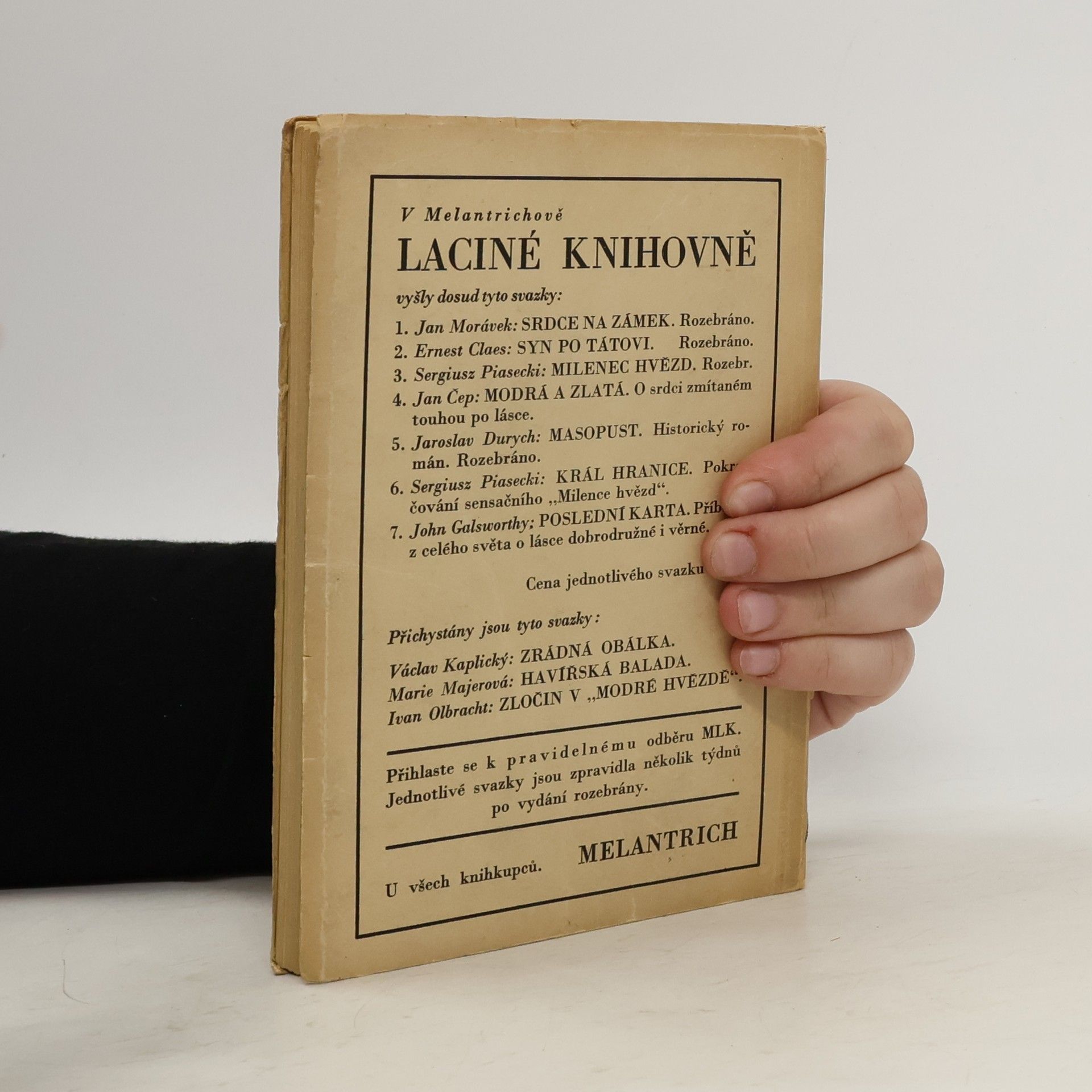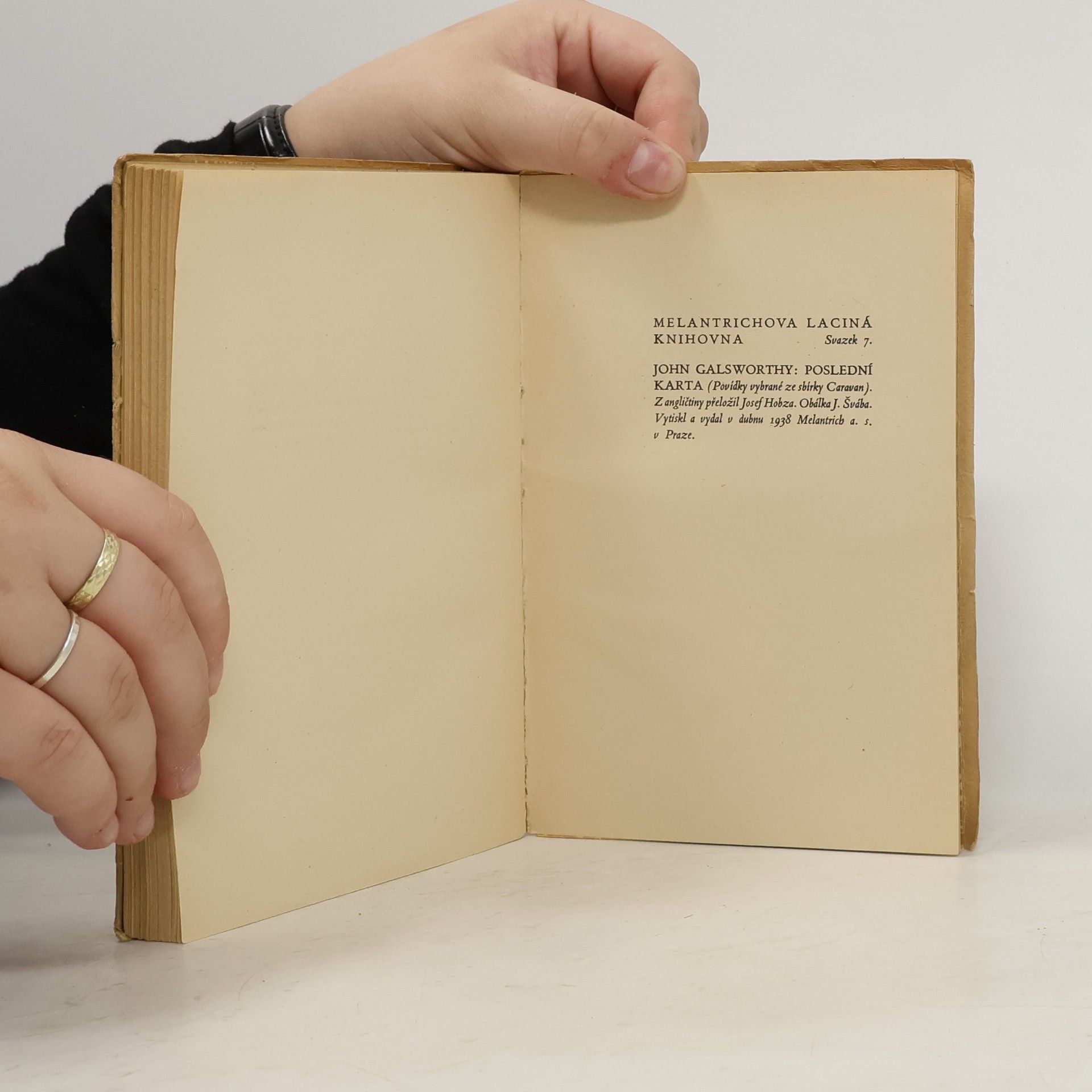 Příběhy z celého světa o lásce dobrodružné i věrné, Melantrichova laciná knihovna svazek č. 7. John Galsworthy: Poslední karta (1938) - povídky vybrané ze sbírky Caravan (1925).