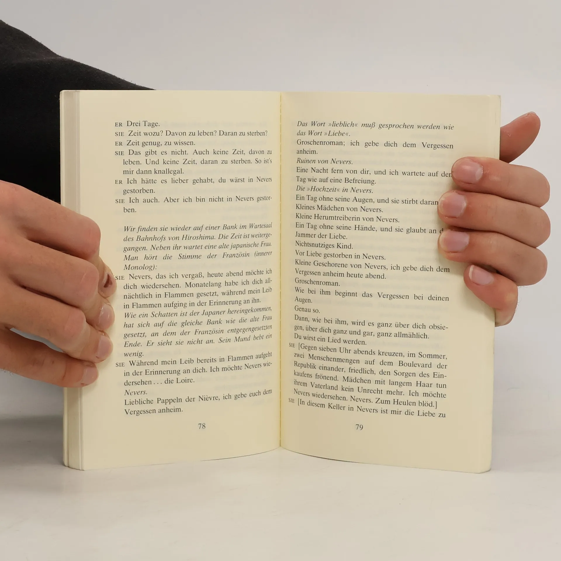 Der Film "Hiroshima mon amour" zeigt den hartnäckigen, aber immer wieder scheiternden Versuch eines Japaners und einer Französin, der Katastrophe von Hiroshima die Liebe zweier Menschen entgegenzusetzen, die der Hölle des Zweiten Weltkrieges entkommen sind, die Katastrophe zu verges­sen, die ständige Erinnerung an sie preiszugeben. Unsere Ausgabe umfaßt das Expose und die Filmnovelle. Sie wird ergänzt durch einige Aufnahmen aus dem Film. (Amazon.de)