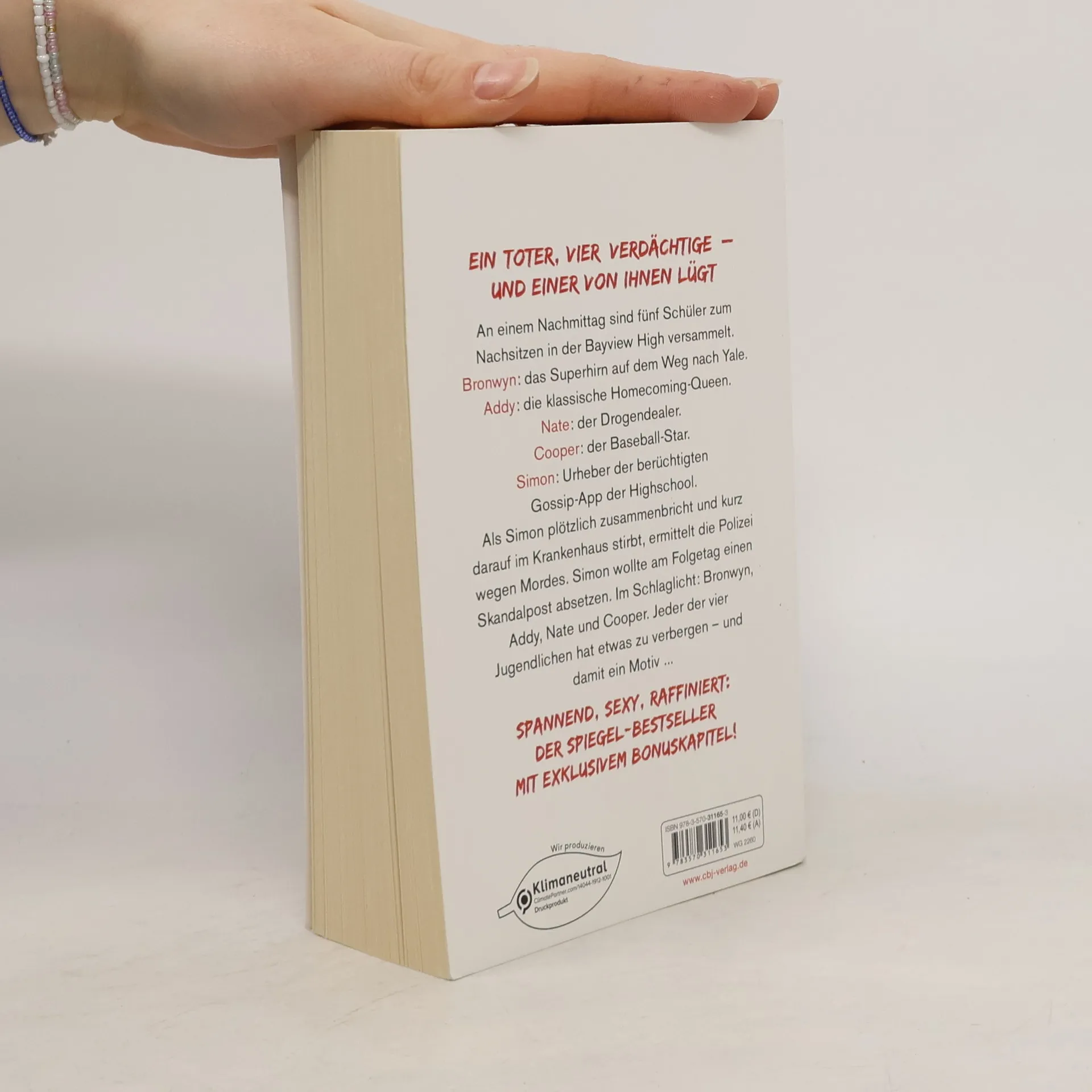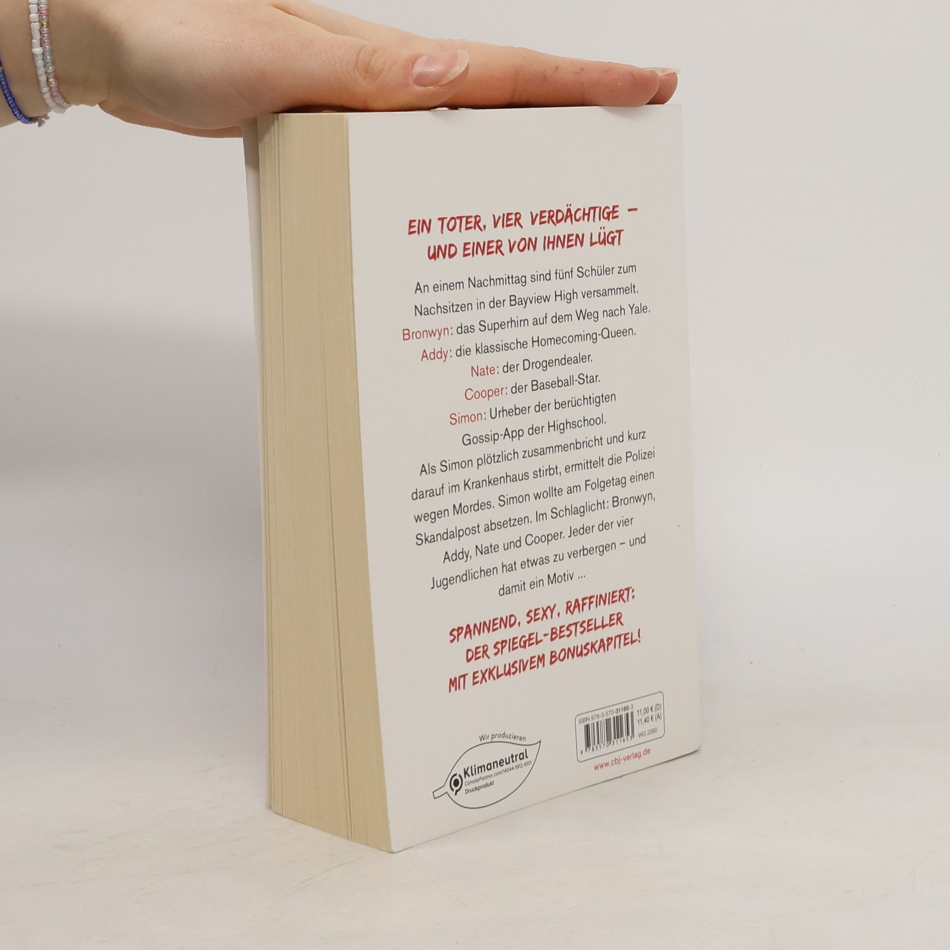Eine Highschool. Ein Toter. Vier Verdächtige. An einem Nachmittag sind fünf Schüler in der Bayview High zum Nachsitzen versammelt. Bronwyn, das Superhirn auf dem Weg nach Yale, bricht niemals die Regeln. Klassenschönheit Addy ist die perfekte Homecoming-Queen. Nate hat seinen Ruf als Drogendealer weg. Cooper glänzt als Baseball-Spieler. Und Simon hat die berüchtigte Gossip-App der Schule unter seiner Kontrolle. Als Simon plötzlich zusammenbricht und kurz darauf im Krankenhaus stirbt, ermittelt die Polizei wegen Mordes. Simon wollte am Folgetag einen Skandalpost absetzen. Im Schlaglicht: Bronwyn, Addy, Nate und Cooper. Jeder der vier hat etwas zu verbergen – und damit ein Motiv... Mit einem exklusiven Bonuskapitel! Karen M. McManus bei cbj & cbt: One Of Us Is Lying Two Can Keep A Secret One Of Us Is Next The Cousins You will be the death of me Nothing more to tell One of us is back Alle Bücher können unabhängig voneinander gelesen werden.