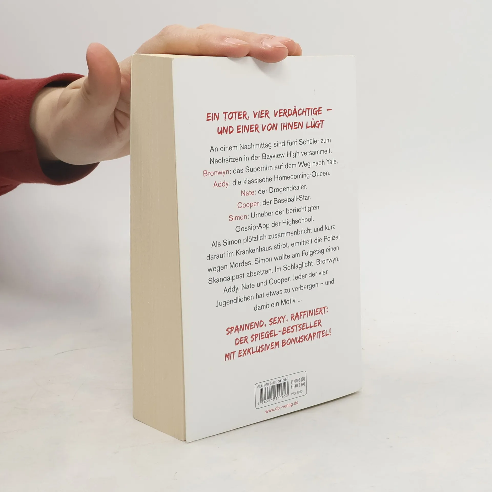 Eine Highschool. Ein Toter. Vier Verdächtige. An einem Nachmittag sind fünf Schüler in der Bayview High zum Nachsitzen versammelt. Bronwyn, das Superhirn auf dem Weg nach Yale, bricht niemals die Regeln. Klassenschönheit Addy ist die perfekte Homecoming-Queen. Nate hat seinen Ruf als Drogendealer weg. Cooper glänzt als Baseball-Spieler. Und Simon hat die berüchtigte Gossip-App der Schule unter seiner Kontrolle. Als Simon plötzlich zusammenbricht und kurz darauf im Krankenhaus stirbt, ermittelt die Polizei wegen Mordes. Simon wollte am Folgetag einen Skandalpost absetzen. Im Schlaglicht: Bronwyn, Addy, Nate und Cooper. Jeder der vier hat etwas zu verbergen – und damit ein Motiv... Mit einem exklusiven Bonuskapitel! Karen M. McManus bei cbj & cbt: One Of Us Is Lying Two Can Keep A Secret One Of Us Is Next The Cousins You will be the death of me Nothing more to tell One of us is back Alle Bücher können unabhängig voneinander gelesen werden.
