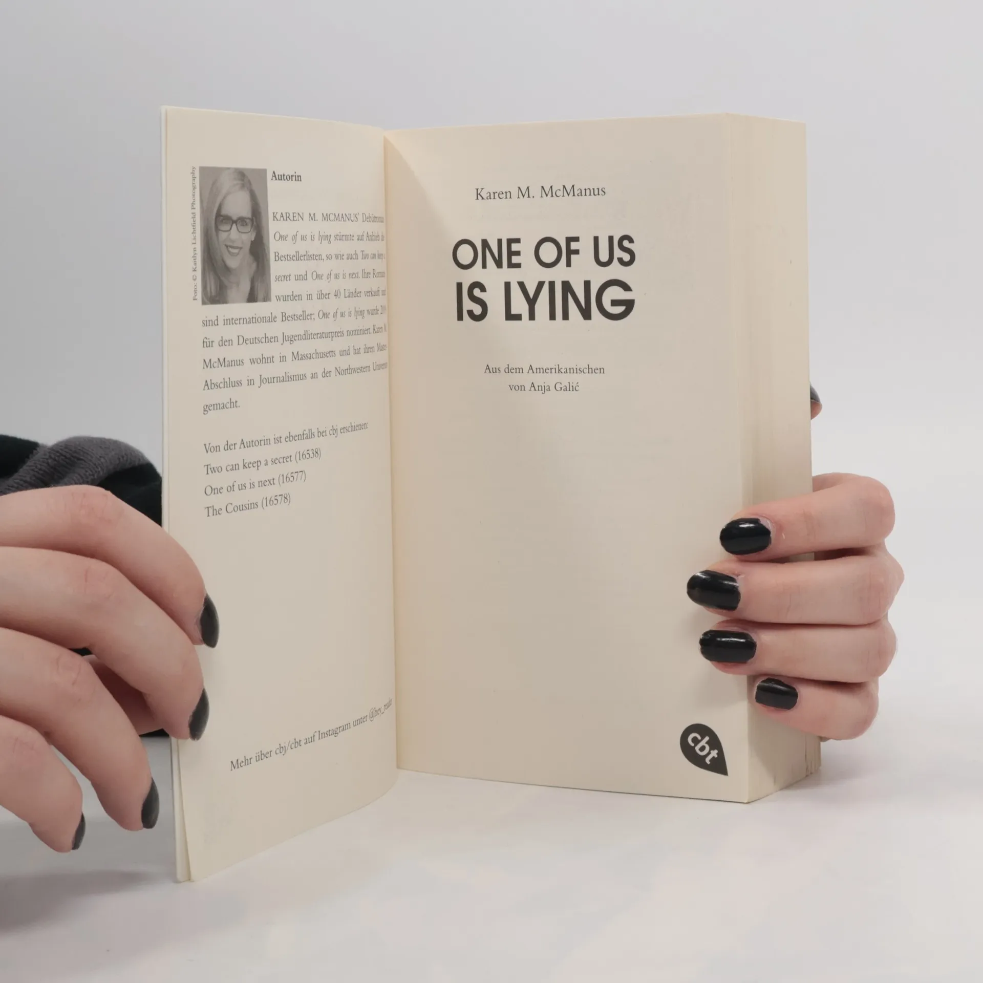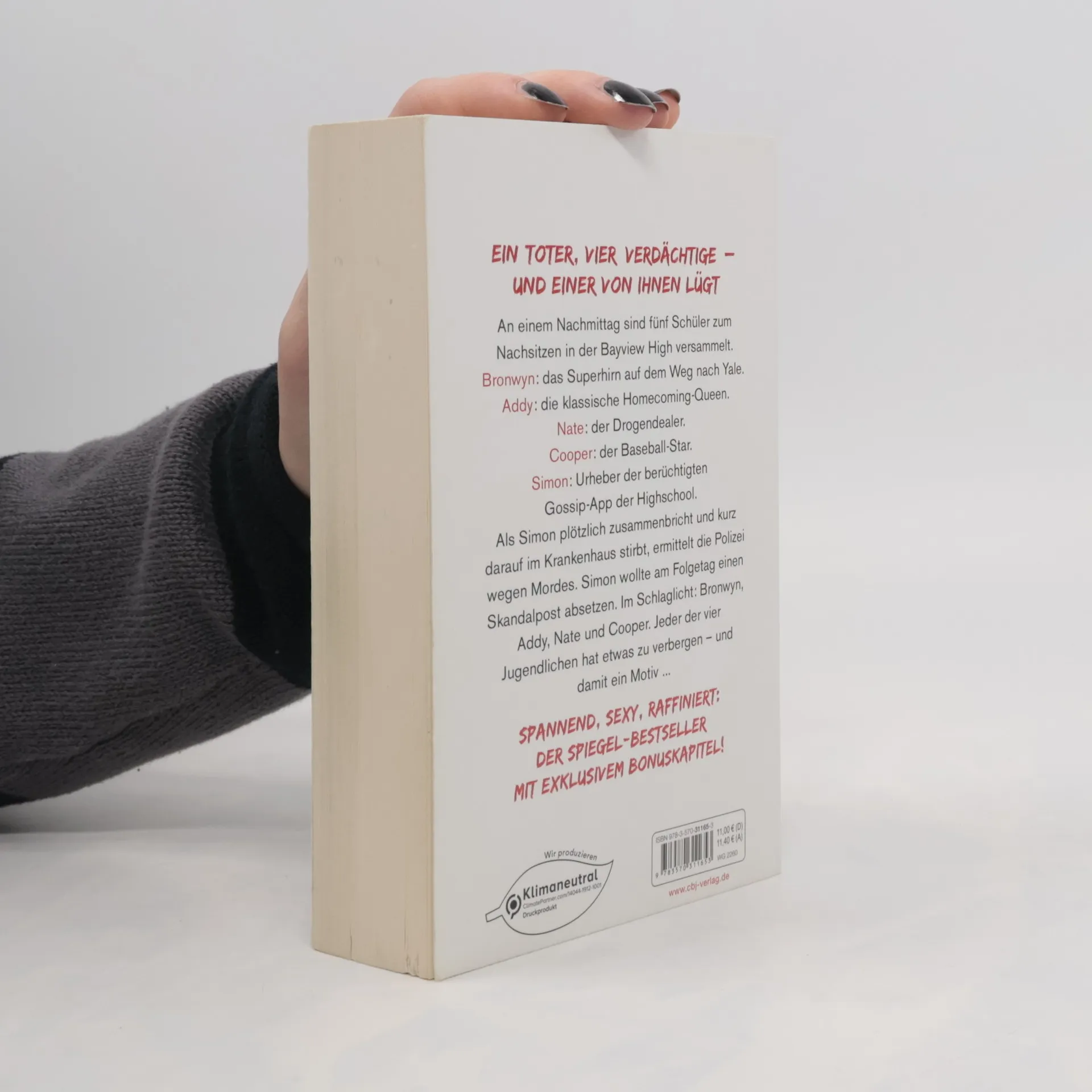 Eine Highschool. Ein Toter. Vier Verdächtige. An einem Nachmittag sind fünf Schüler in der Bayview High zum Nachsitzen versammelt. Bronwyn, das Superhirn auf dem Weg nach Yale, bricht niemals die Regeln. Klassenschönheit Addy ist die perfekte Homecoming-Queen. Nate hat seinen Ruf als Drogendealer weg. Cooper glänzt als Baseball-Spieler. Und Simon hat die berüchtigte Gossip-App der Schule unter seiner Kontrolle. Als Simon plötzlich zusammenbricht und kurz darauf im Krankenhaus stirbt, ermittelt die Polizei wegen Mordes. Simon wollte am Folgetag einen Skandalpost absetzen. Im Schlaglicht: Bronwyn, Addy, Nate und Cooper. Jeder der vier hat etwas zu verbergen – und damit ein Motiv... Mit einem exklusiven Bonuskapitel! Karen M. McManus bei cbj & cbt: One Of Us Is Lying Two Can Keep A Secret One Of Us Is Next The Cousins You will be the death of me Nothing more to tell One of us is back Alle Bücher können unabhängig voneinander gelesen werden.