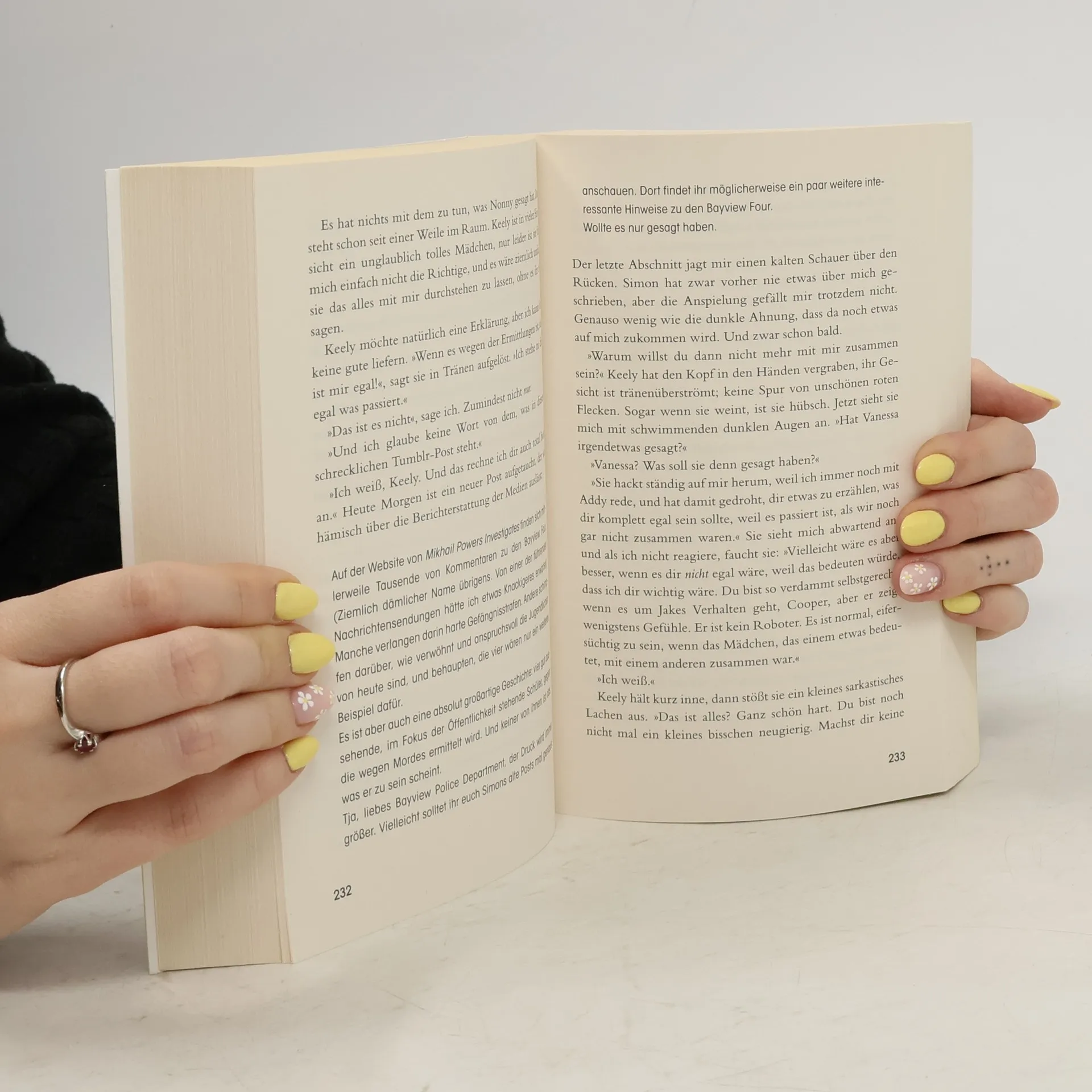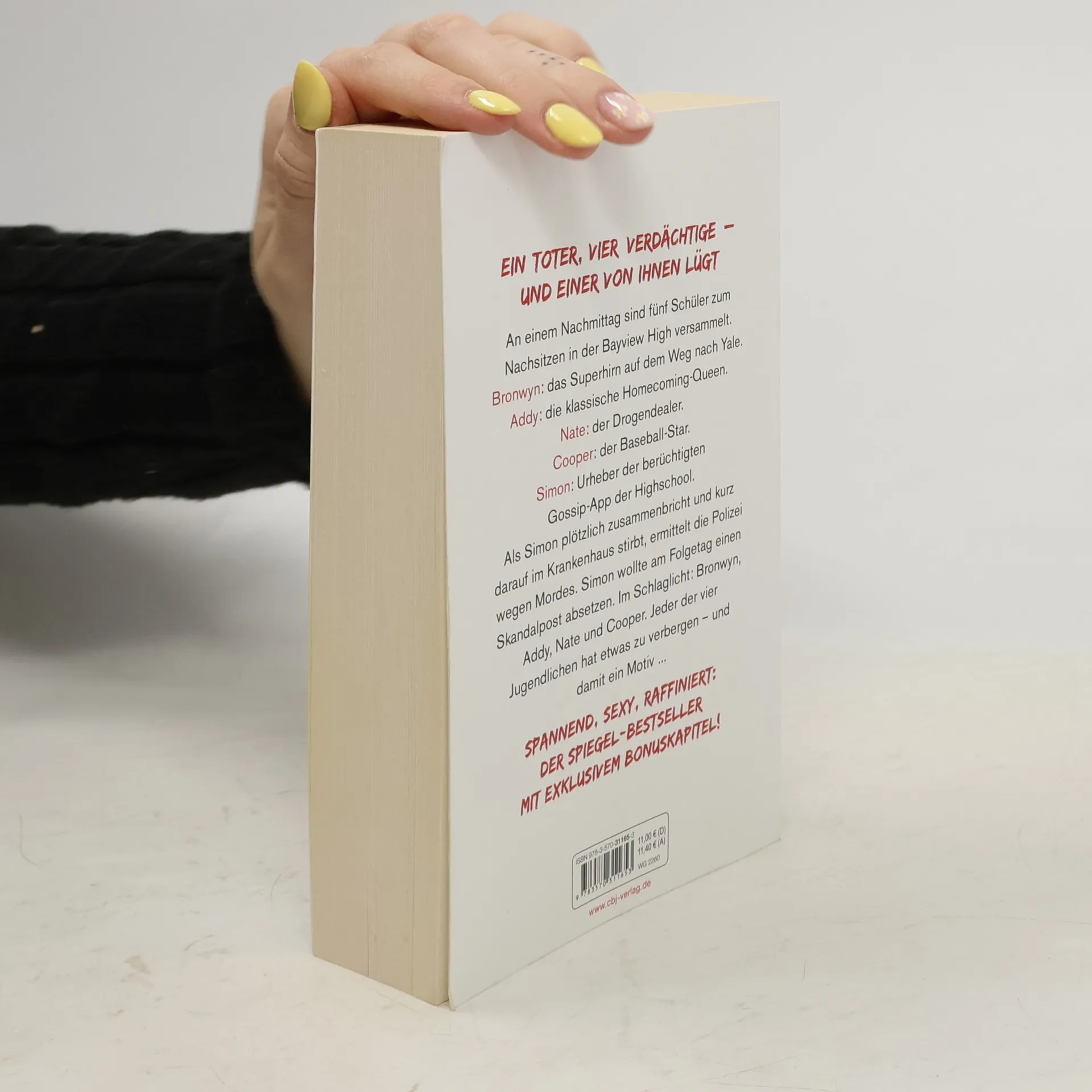 Eine Highschool. Ein Toter. Vier Verdächtige. An einem Nachmittag sind fünf Schüler in der Bayview High zum Nachsitzen versammelt. Bronwyn, das Superhirn auf dem Weg nach Yale, bricht niemals die Regeln. Klassenschönheit Addy ist die perfekte Homecoming-Queen. Nate hat seinen Ruf als Drogendealer weg. Cooper glänzt als Baseball-Spieler. Und Simon hat die berüchtigte Gossip-App der Schule unter seiner Kontrolle. Als Simon plötzlich zusammenbricht und kurz darauf im Krankenhaus stirbt, ermittelt die Polizei wegen Mordes. Simon wollte am Folgetag einen Skandalpost absetzen. Im Schlaglicht: Bronwyn, Addy, Nate und Cooper. Jeder der vier hat etwas zu verbergen – und damit ein Motiv... Mit einem exklusiven Bonuskapitel! Karen M. McManus bei cbj & cbt: One Of Us Is Lying Two Can Keep A Secret One Of Us Is Next The Cousins You will be the death of me Nothing more to tell One of us is back Alle Bücher können unabhängig voneinander gelesen werden.