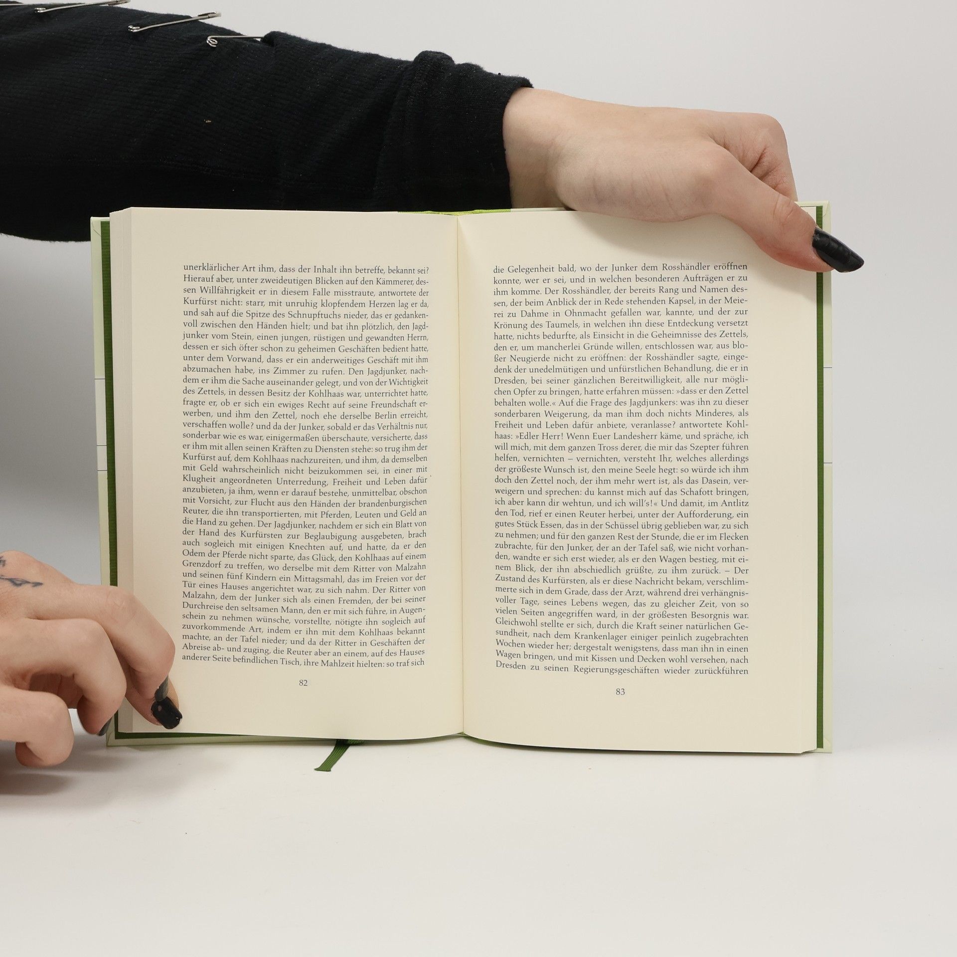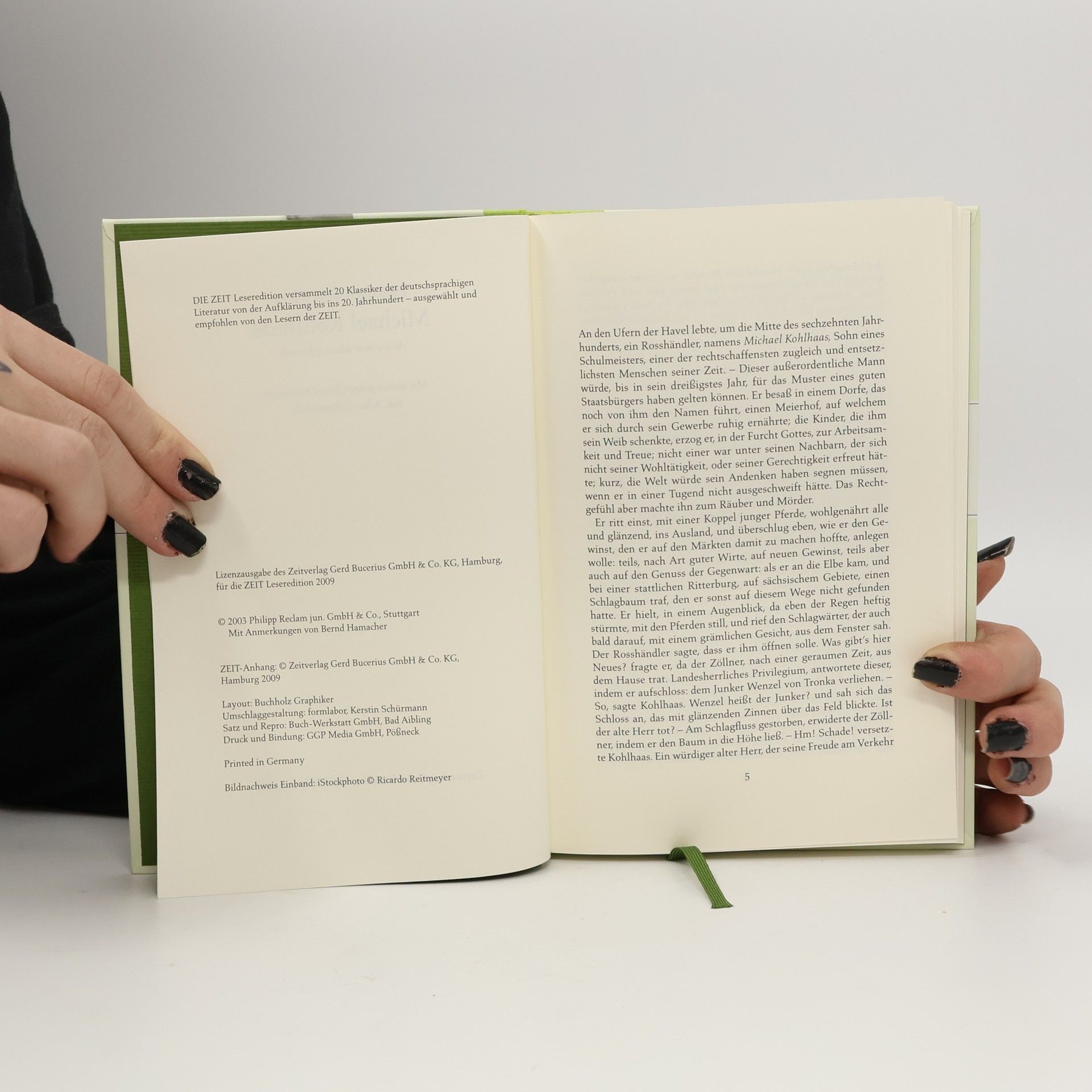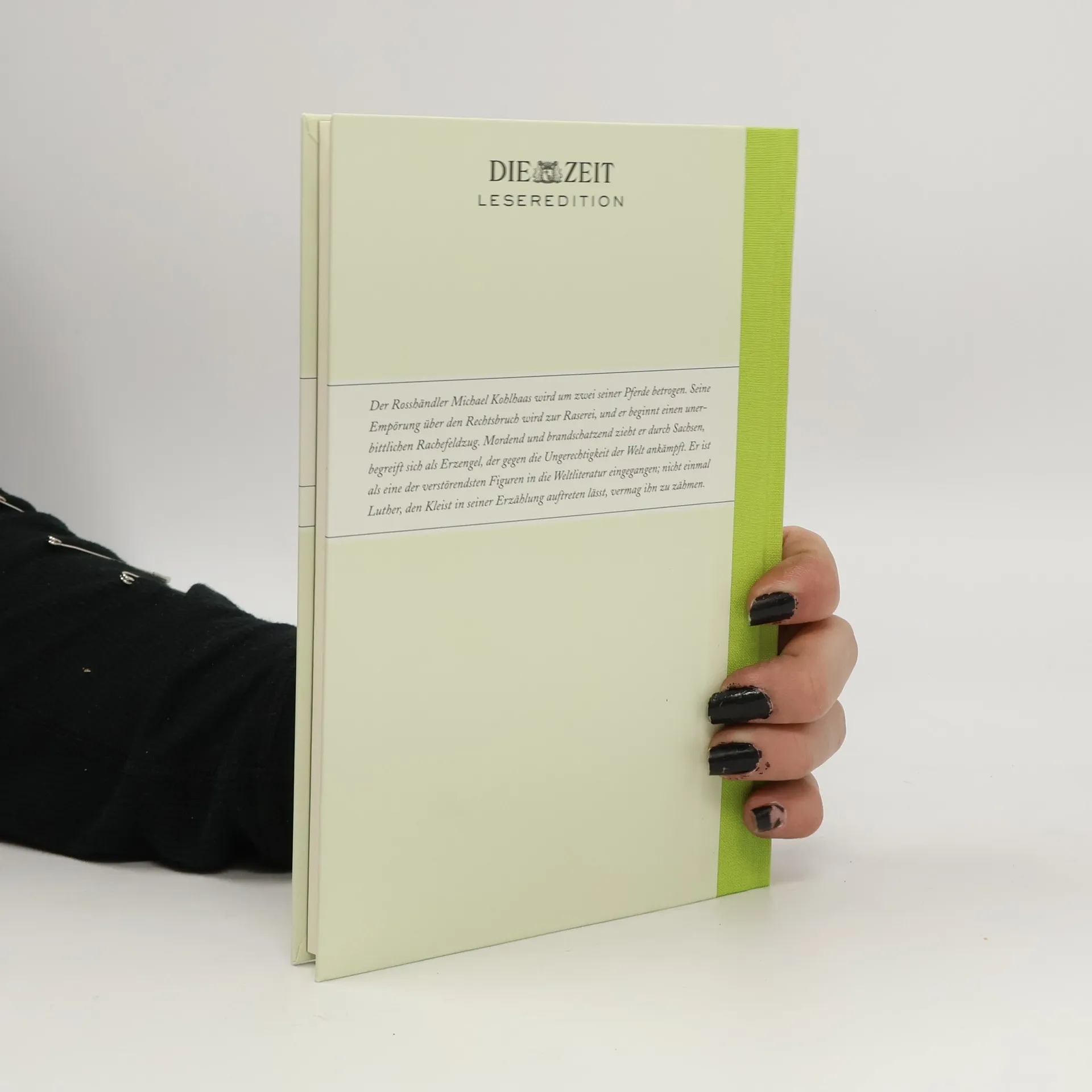 Der Rosshändler Michael Kohlhaas sucht sein Recht und wird darüber zum Räuber. Er muss erkennen, dass es das absolute Recht nicht geben kann, sondern dass die Rechtsprechung an die Gesellschaft gebunden ist. Schliesslich ereilt ihn selbst das Gericht, dem er sich beugt: Er stirbt auf dem Schaffot. Diese Novelle beruht, wie der Untertitel angibt, auf einer alten Chronik, aus der der Anhang Auszüge bringt. Über Leben und Werk des Dichters gibt das Nachwort Auskunft. Die Anmerkungen enthalten Erklärungen für den Schüler.