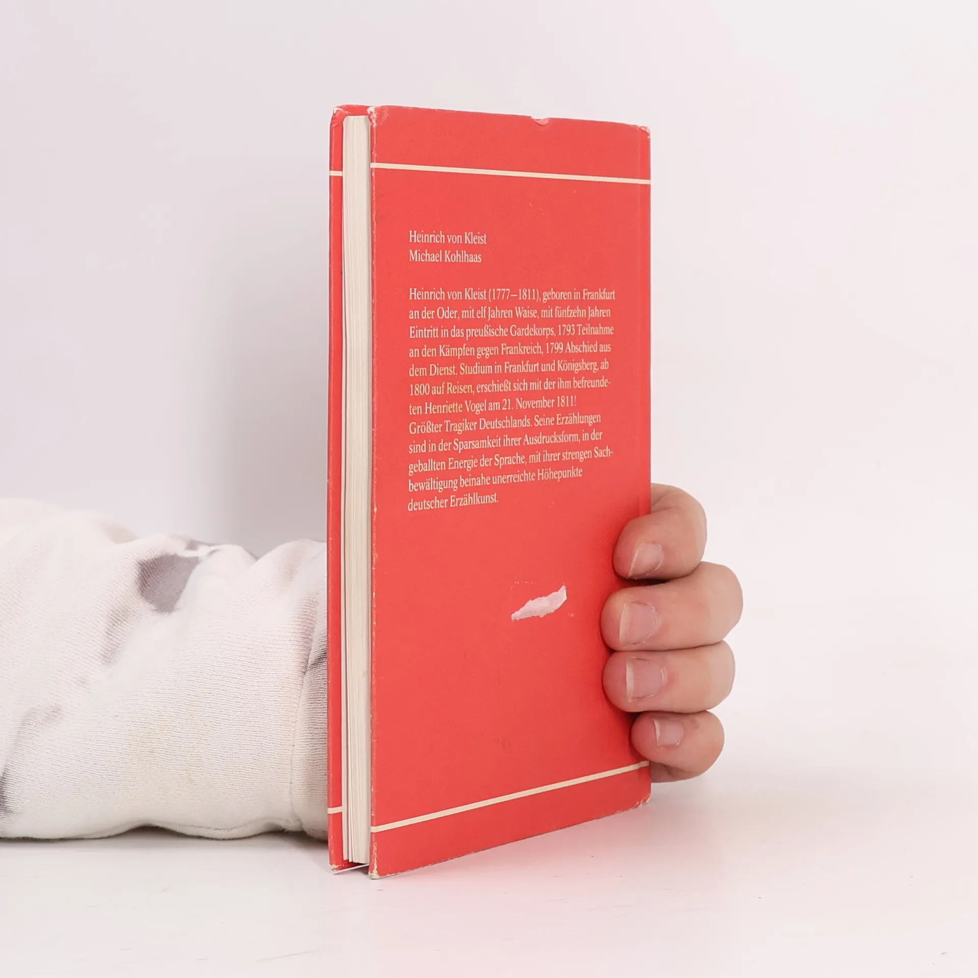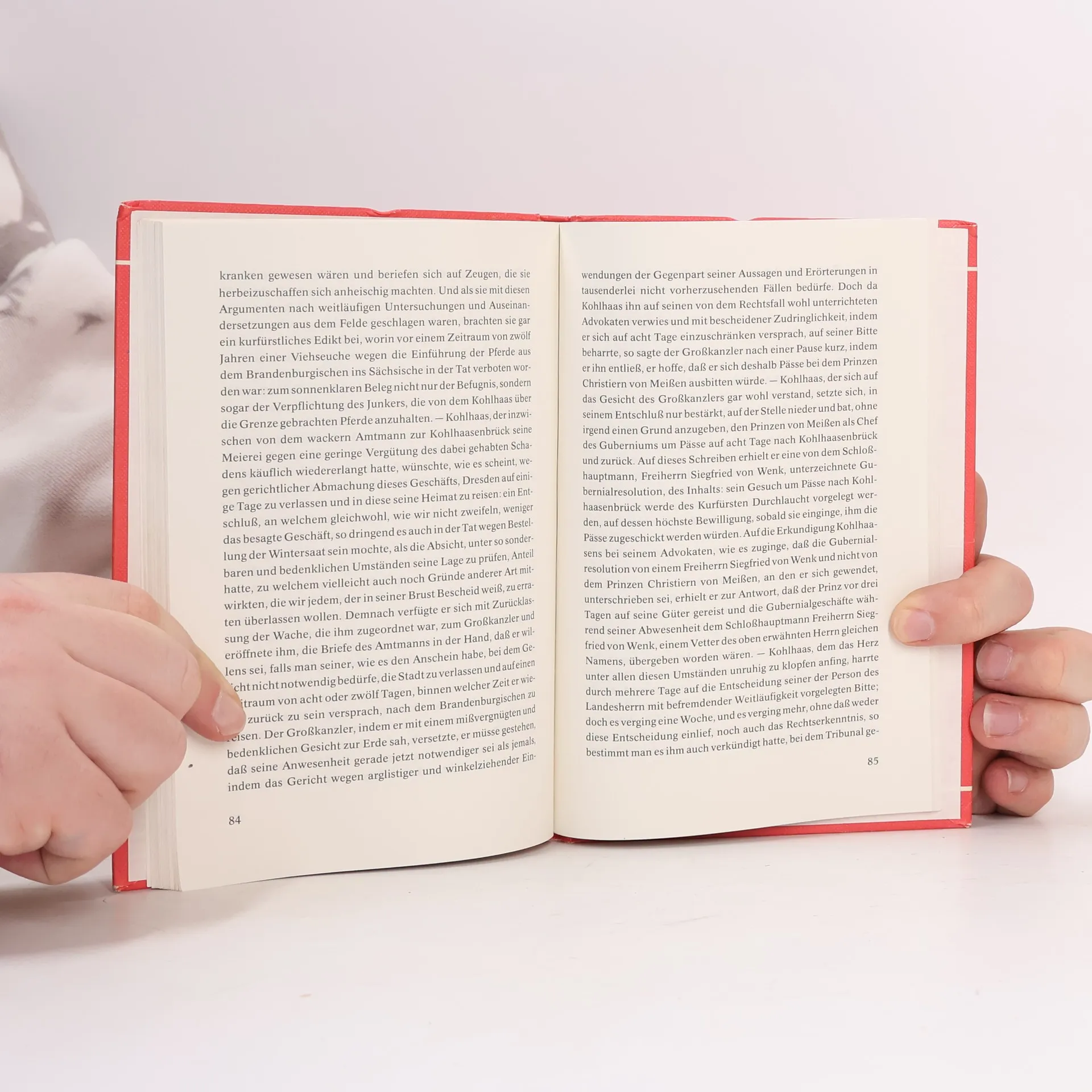 Der Rosshändler Michael Kohlhaas sucht sein Recht und wird darüber zum Räuber. Er muss erkennen, dass es das absolute Recht nicht geben kann, sondern dass die Rechtsprechung an die Gesellschaft gebunden ist. Schliesslich ereilt ihn selbst das Gericht, dem er sich beugt: Er stirbt auf dem Schaffot. Diese Novelle beruht, wie der Untertitel angibt, auf einer alten Chronik, aus der der Anhang Auszüge bringt. Über Leben und Werk des Dichters gibt das Nachwort Auskunft. Die Anmerkungen enthalten Erklärungen für den Schüler.