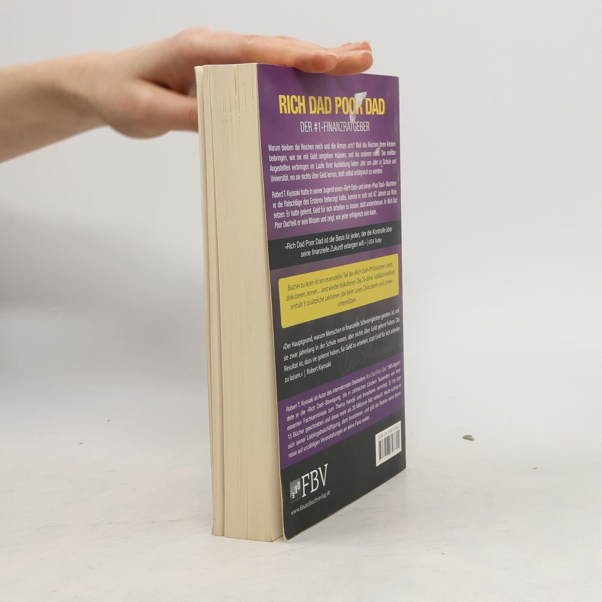 Warum bleiben die Reichen reich und die Armen arm? Weil die Reichen ihren Kindern beibringen, wie sie mit Geld umgehen müssen, und die anderen nicht! Die meisten Angestellten verbringen im Laufe ihrer Ausbildung lieber Jahr um Jahr in Schule und Universität, wo sie nichts über Geld lernen, statt selbst erfolgreich zu werden. Robert T. Kiyosaki hatte in seiner Jugend einen »Rich Dad« und einen »Poor Dad«. Nachdem er die Ratschläge des Ersteren beherzigt hatte, konnte er sich mit 47 Jahren zur Ruhe setzen. Er hatte gelernt, Geld für sich arbeiten zu lassen, statt andersherum. In Rich Dad Poor Dad teilt er sein Wissen und zeigt, wie jeder erfolgreich sein kann. © Autorenfoto: Rich Dad Company