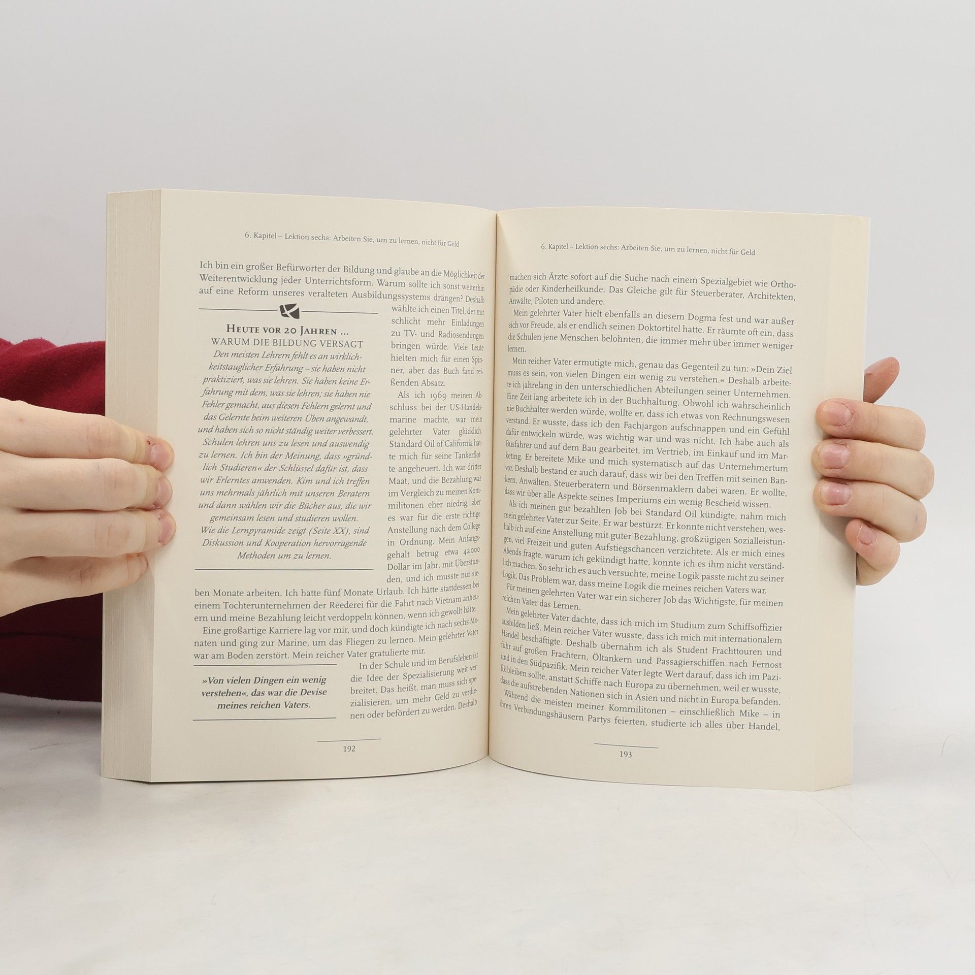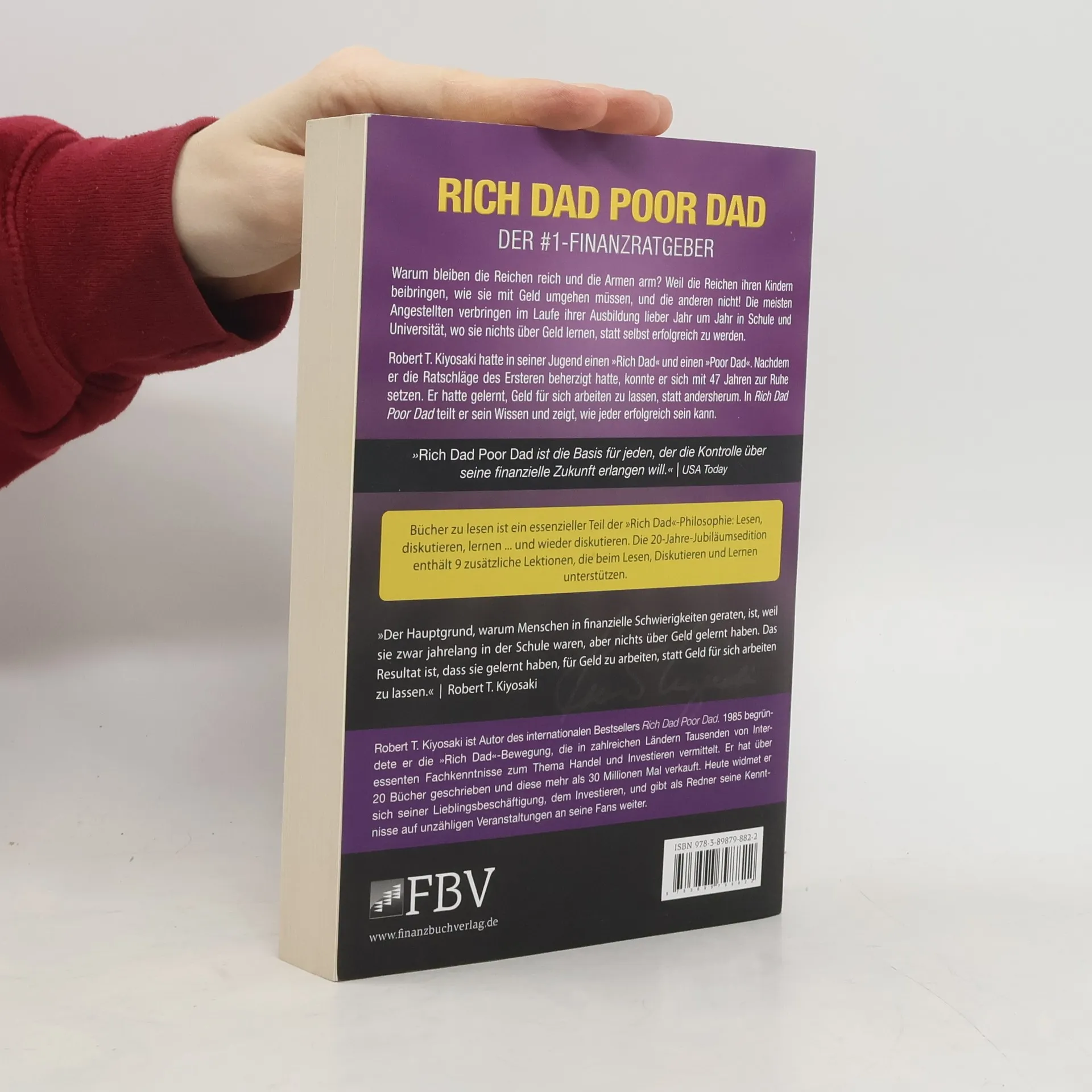 Warum bleiben die Reichen reich und die Armen arm? Weil die Reichen ihren Kindern beibringen, wie sie mit Geld umgehen müssen, und die anderen nicht! Die meisten Angestellten verbringen im Laufe ihrer Ausbildung lieber Jahr um Jahr in Schule und Universität, wo sie nichts über Geld lernen, statt selbst erfolgreich zu werden. Robert T. Kiyosaki hatte in seiner Jugend einen »Rich Dad« und einen »Poor Dad«. Nachdem er die Ratschläge des Ersteren beherzigt hatte, konnte er sich mit 47 Jahren zur Ruhe setzen. Er hatte gelernt, Geld für sich arbeiten zu lassen, statt andersherum. In Rich Dad Poor Dad teilt er sein Wissen und zeigt, wie jeder erfolgreich sein kann. © Autorenfoto: Rich Dad Company