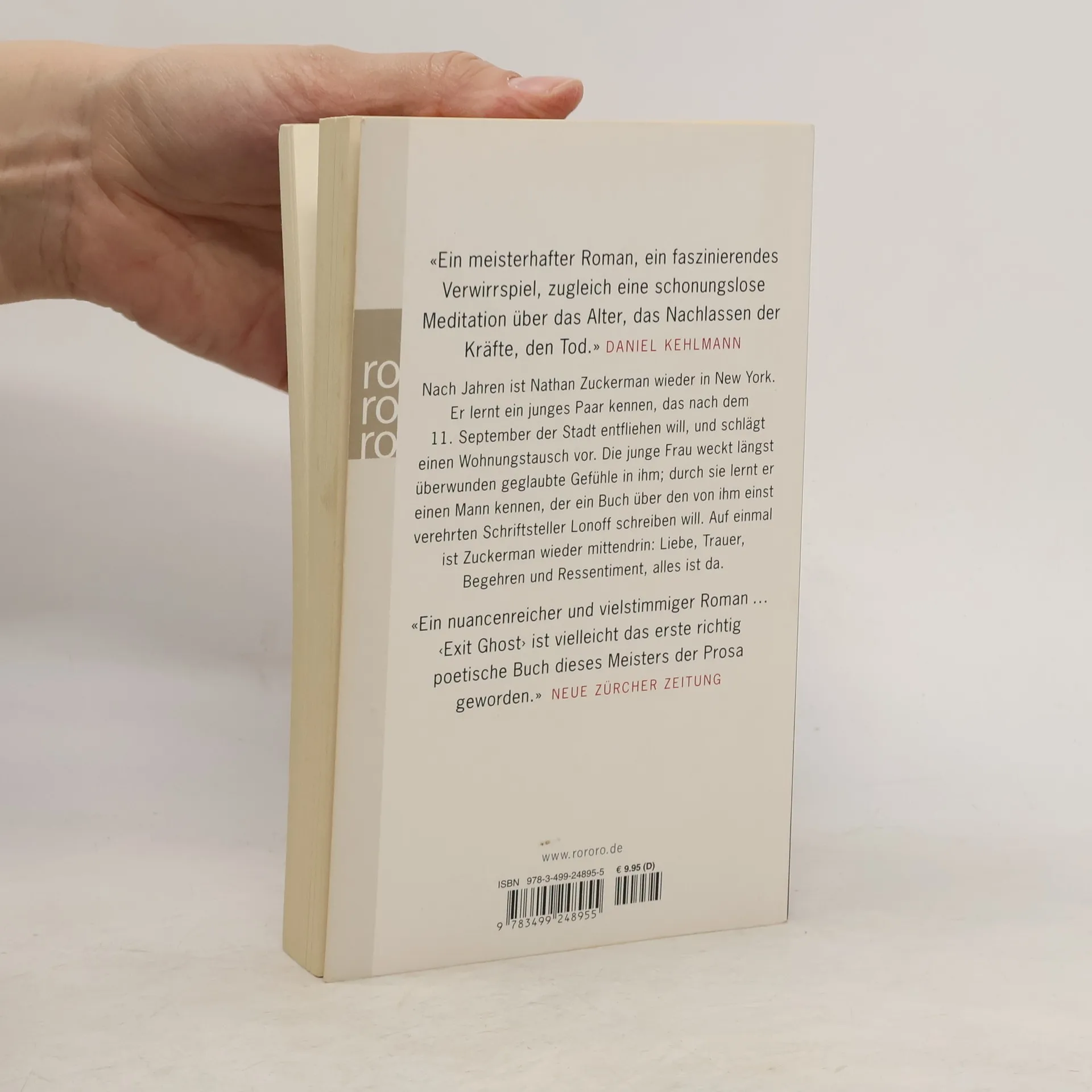 „Ein meisterhafter Roman, ein faszinierendes Verwirrspiel, zugleich eine schonungslose Meditation über das Alter, das Nachlassen der Kräfte, den Tod.“ (Daniel Kehlmann) Nach Jahren ist Nathan Zuckerman wieder in New York. Er lernt ein junges Paar kennen, das nach dem 11. September der Stadt entfliehen will, und schlägt einen Wohnungstausch vor. Die junge Frau weckt längst überwunden geglaubte Gefühle in ihm; durch sie lernt er einen Mann kennen, der ein Buch über den von ihm einst verehrten Schriftsteller Lonoff schreiben will. Auf einmal ist Zuckerman wieder mitten drin: Liebe, Trauer, Begehren und Ressentiment, alles ist da. „Ein nuancenreicher und vielstimmiger Roman. ... 'Exit Ghost' ist vielleicht das erste richtig poetische Buch dieses Meisters der Prosa geworden.“ (Neue Zürcher Zeitung)