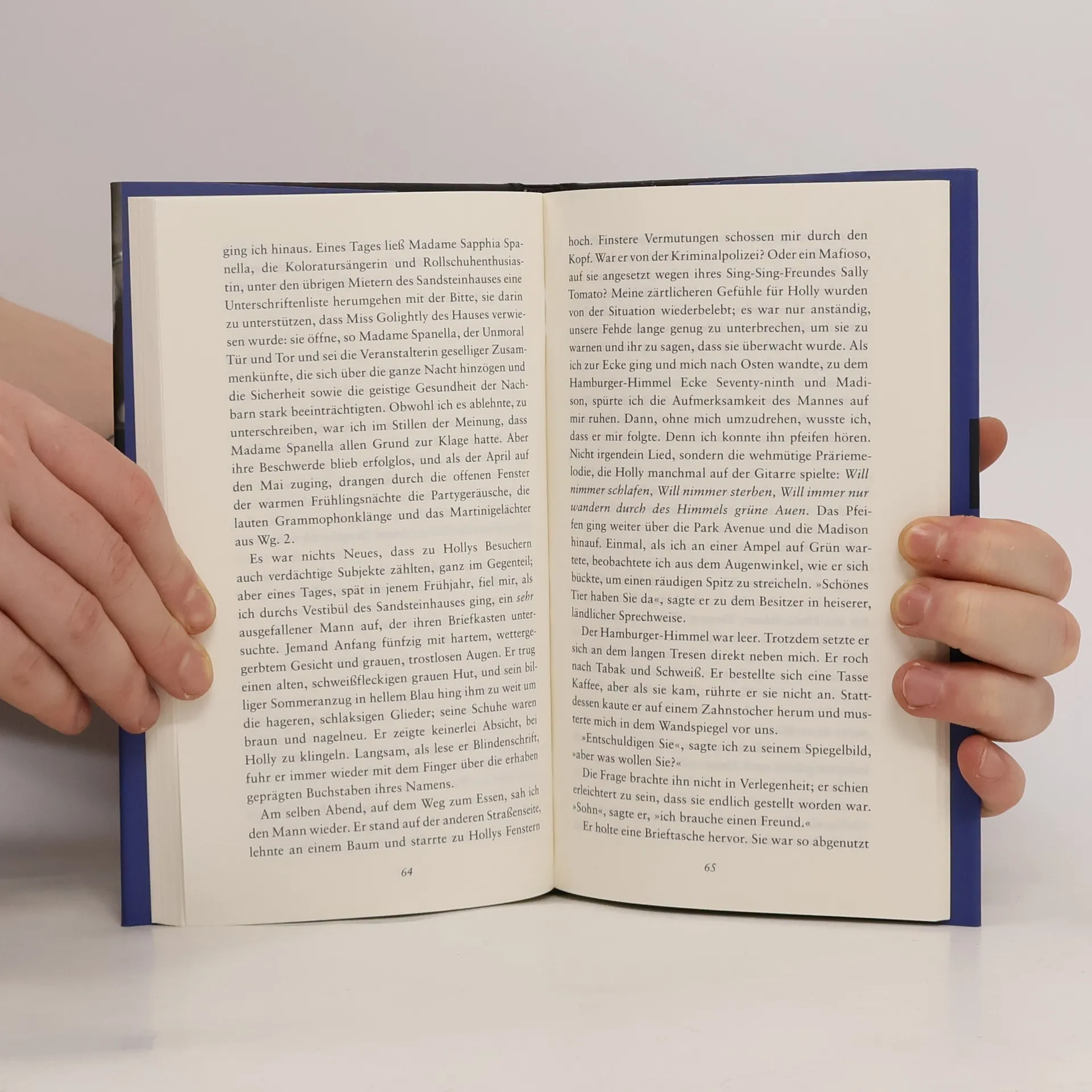 „Bei all ihrer schicken Magerkeit strahlte sie eine Haferflocken-Gesundheit aus, eine Seifen- und Zitronen-Reinlichkeit, und auf ihren Wangen lag eine raue Röte. Sie hatte einen großen Mund und eine Stupsnase. Eine Sonnenbrille verbarg ihre Augen. Es war ein Gesicht, das nicht mehr ganz in der Kindheit zuhause war und schon einer Frau gehörte.“ So beschreibt Truman Capote seine unsterbliche Heldin Holly Golightly. Die fast Neunzehnjährige, die voller Lebenshunger vom Land in die große Stadt ausgerissen ist, hat nichts außer ihrer Erscheinung und Ausstrahlung, die sie befähigt, mit Männern zu spielen und sich gewissermaßen aushalten zu lassen. Manchmal, im Partytrubel von New York, glänzt sie unschuldig, doch dann überkommt sie das „rote Elend“, das Gefühl von innerer Leere und Einsamkeit. In solchen Momenten flieht sie zur Fifth Avenue zu Tiffany, wo der Schimmer der Diamanten ihr Sicherheit gibt. Ihr Nachbar, ein junger Schriftsteller, beobachtet ihr aufregendes Leben und liebt ihre Schlagfertigkeit sowie ihre originelle Sprache. Gelegentlich spielt sie Lieder, die an Südstaaten-Nadelwälder oder die Prärie erinnern. Eines Tages ist sie plötzlich verschwunden, und zurück bleibt nur ihr namenloser Kater, auf dessen Suche sich der Erzähler begibt.