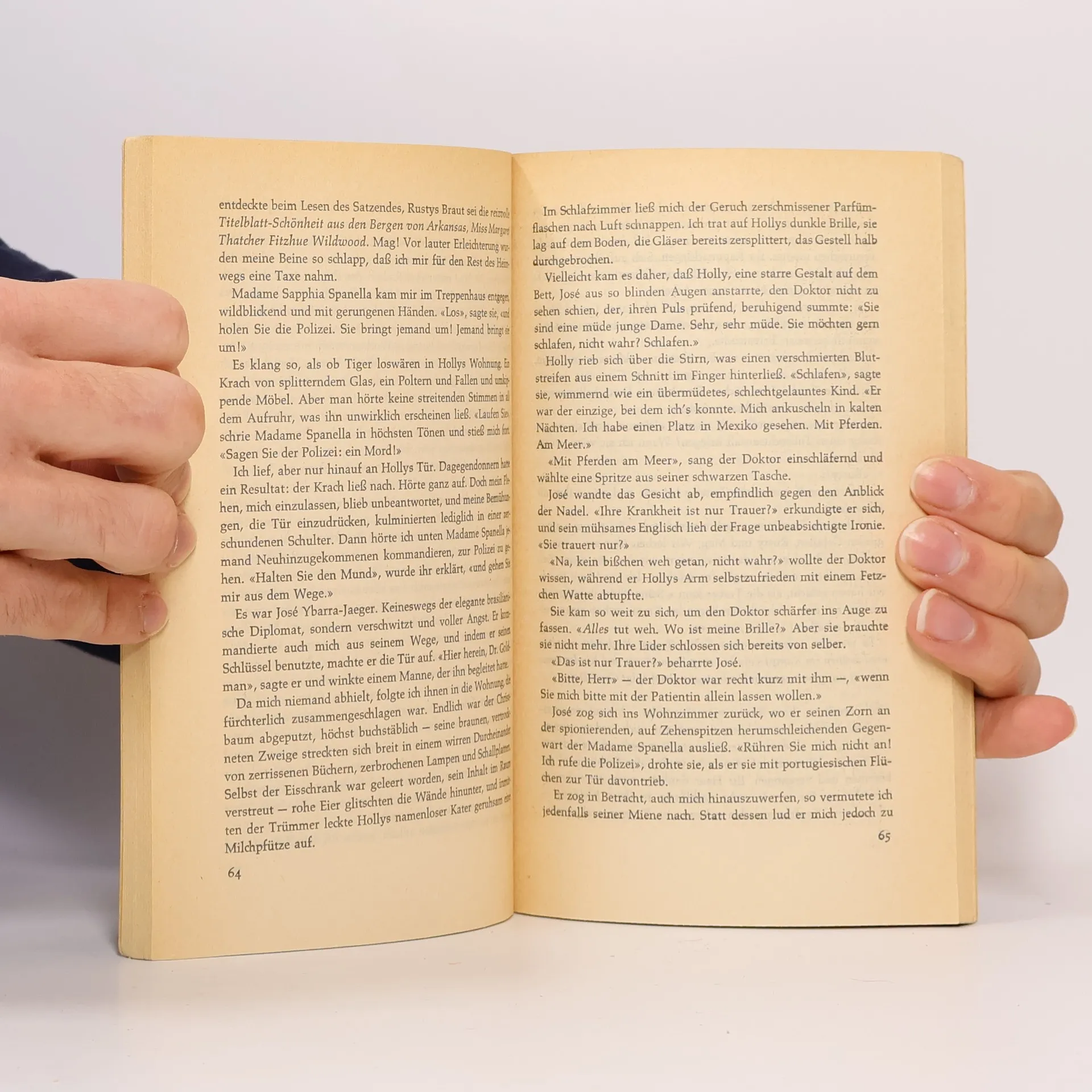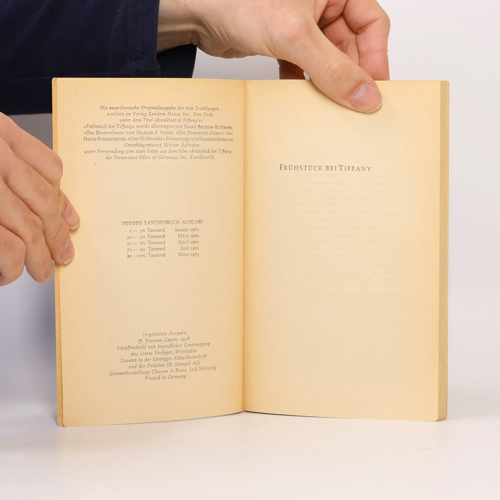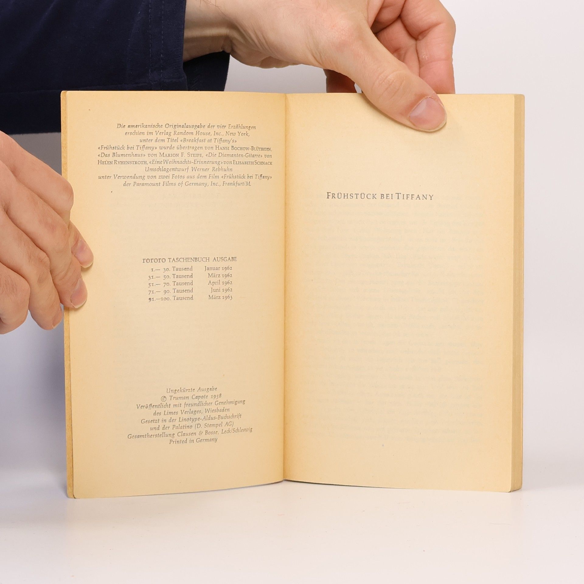 „Bei all ihrer schicken Magerkeit strahlte sie eine Haferflocken-Gesundheit aus, eine Seifen- und Zitronen-Reinlichkeit, und auf ihren Wangen lag eine raue Röte. Sie hatte einen großen Mund und eine Stupsnase. Eine Sonnenbrille verbarg ihre Augen. Es war ein Gesicht, das nicht mehr ganz in der Kindheit zuhause war und schon einer Frau gehörte.“ So beschreibt Truman Capote seine unsterbliche Heldin Holly Golightly. Die fast Neunzehnjährige, die voller Lebenshunger vom Land in die große Stadt ausgerissen ist, hat nichts außer ihrer Erscheinung und Ausstrahlung, die sie befähigt, mit Männern zu spielen und sich gewissermaßen aushalten zu lassen. Manchmal, im Partytrubel von New York, glänzt sie unschuldig, doch dann überkommt sie das „rote Elend“, das Gefühl von innerer Leere und Einsamkeit. In solchen Momenten flieht sie zur Fifth Avenue zu Tiffany, wo der Schimmer der Diamanten ihr Sicherheit gibt. Ihr Nachbar, ein junger Schriftsteller, beobachtet ihr aufregendes Leben und liebt ihre Schlagfertigkeit sowie ihre originelle Sprache. Gelegentlich spielt sie Lieder, die an Südstaaten-Nadelwälder oder die Prärie erinnern. Eines Tages ist sie plötzlich verschwunden, und zurück bleibt nur ihr namenloser Kater, auf dessen Suche sich der Erzähler begibt.