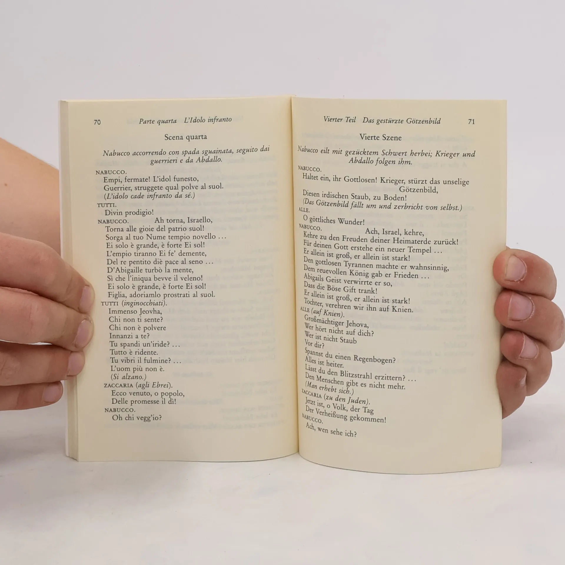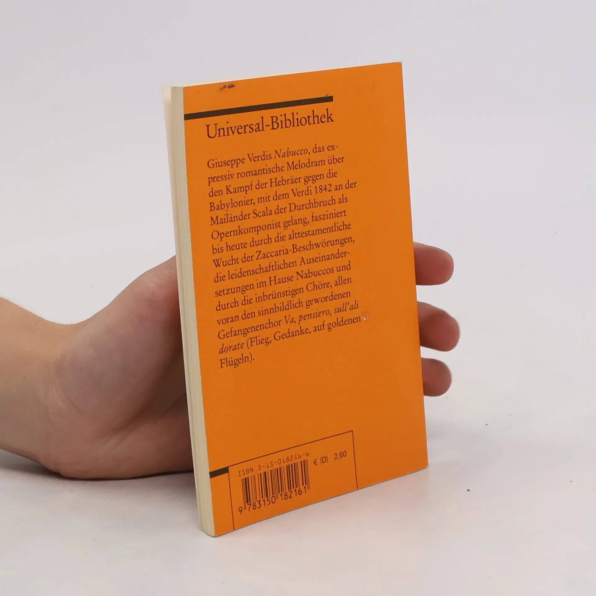 Am 9. März 1842 wurde 'Nabucco' an der Mailänder Scala uraufgeführt - ein überwältigender Erfolg, der Verdi den Durchbruch als Opernkomponist brachte. Auch heute gehört das „Drama lirico“ zum Repertoire großer und kleiner Bühnen; der Chor der gefangenen Hebräer kann wohl als der berühmteste aller Opernchöre gelten, die Verse "Va, pensiero, sull'ali dorate" (Zieht, Gedanken, auf goldenen Flügeln) wurden zum Topos der Befreiung. Sprachen: Deutsch, Italienisch
