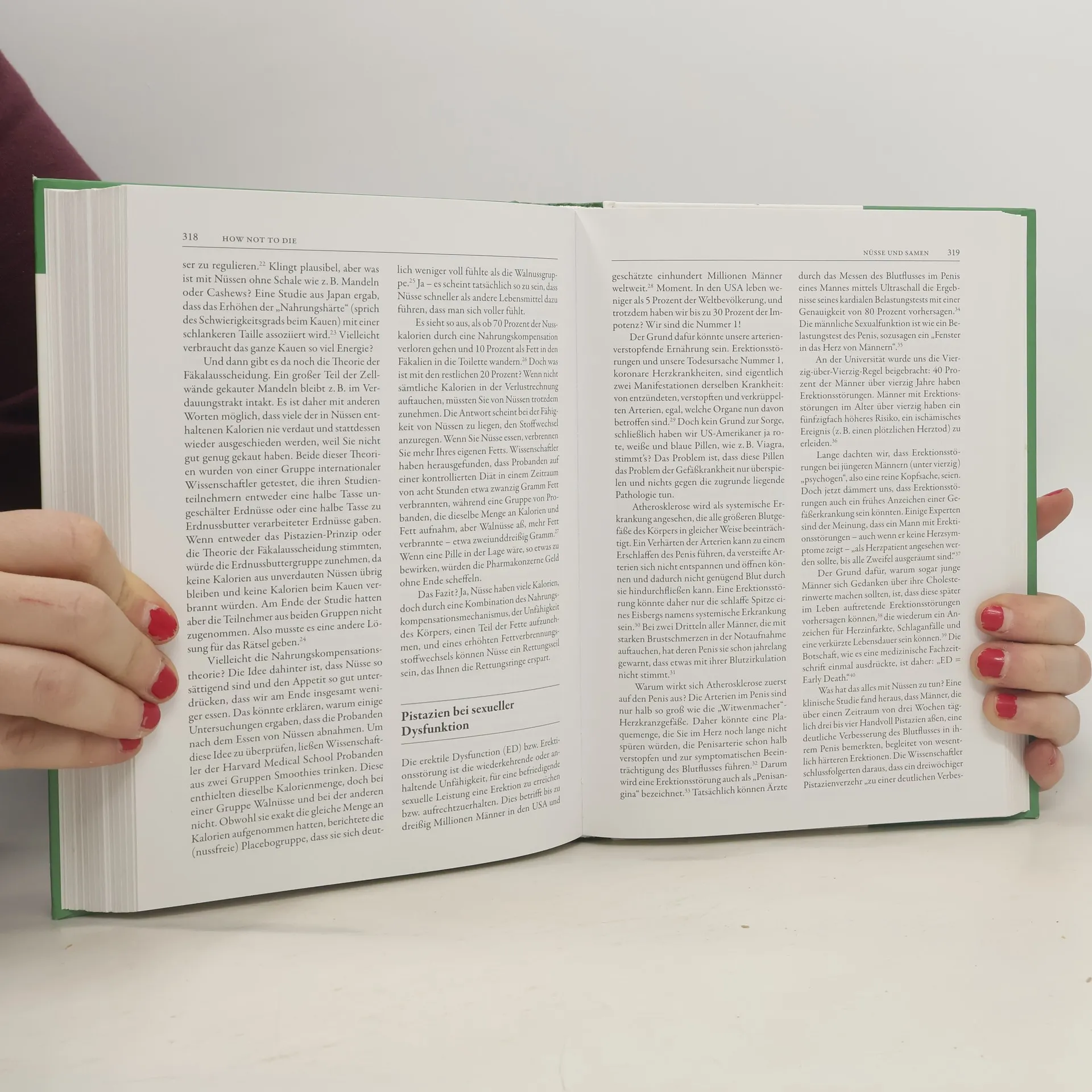 Über 166.000 Exemplare der deutschen Ausgabe wurden bereits verkauft. Die meisten frühzeitigen Todesfälle sind vermeidbar – durch einfache Änderungen in Lebens- und Ernährungsweise. Dr. Michael Greger, ein international renommierter Arzt und Ernährungswissenschaftler, enthüllt in seinem Bestseller das Geheimnis der Selbstheilung des menschlichen Körpers. Er analysiert die 15 häufigsten Todesursachen in der westlichen Welt, darunter Herzkrankheiten, Krebs und Diabetes, und erklärt, wie diese durch neueste wissenschaftliche Erkenntnisse verhindert oder sogar rückgängig gemacht werden können. Greger stellt zudem dar, welche Lebensmittel besonders gesund für die verschiedenen Organe sind und wie sie optimal kombiniert werden können. Sein „Tägliches Dutzend“ bietet eine praktische Checkliste für eine optimale Gesundheit. Das Buch wird als unverzichtbar für alle beschrieben, die ihre gesundheitliche Zukunft selbstbestimmt gestalten möchten. Leser berichten von einer neuen Sicht auf Ernährung und der Motivation, bewusster zu essen. Die wissenschaftlich fundierten Informationen ermöglichen es, das eigene Leben gesundheitlich in die richtigen Bahnen zu lenken. Im Vorwort erzählt Greger von seiner Großmutter, die nach zahlreichen Operationen als unheilbar galt, aber durch eine pflanzenbasierte Diät und Lebensstiländerungen eine erstaunliche Genesung erlebte. Dieses Erlebnis prägte seinen Werdegang und sein Engagement für die Aufklä