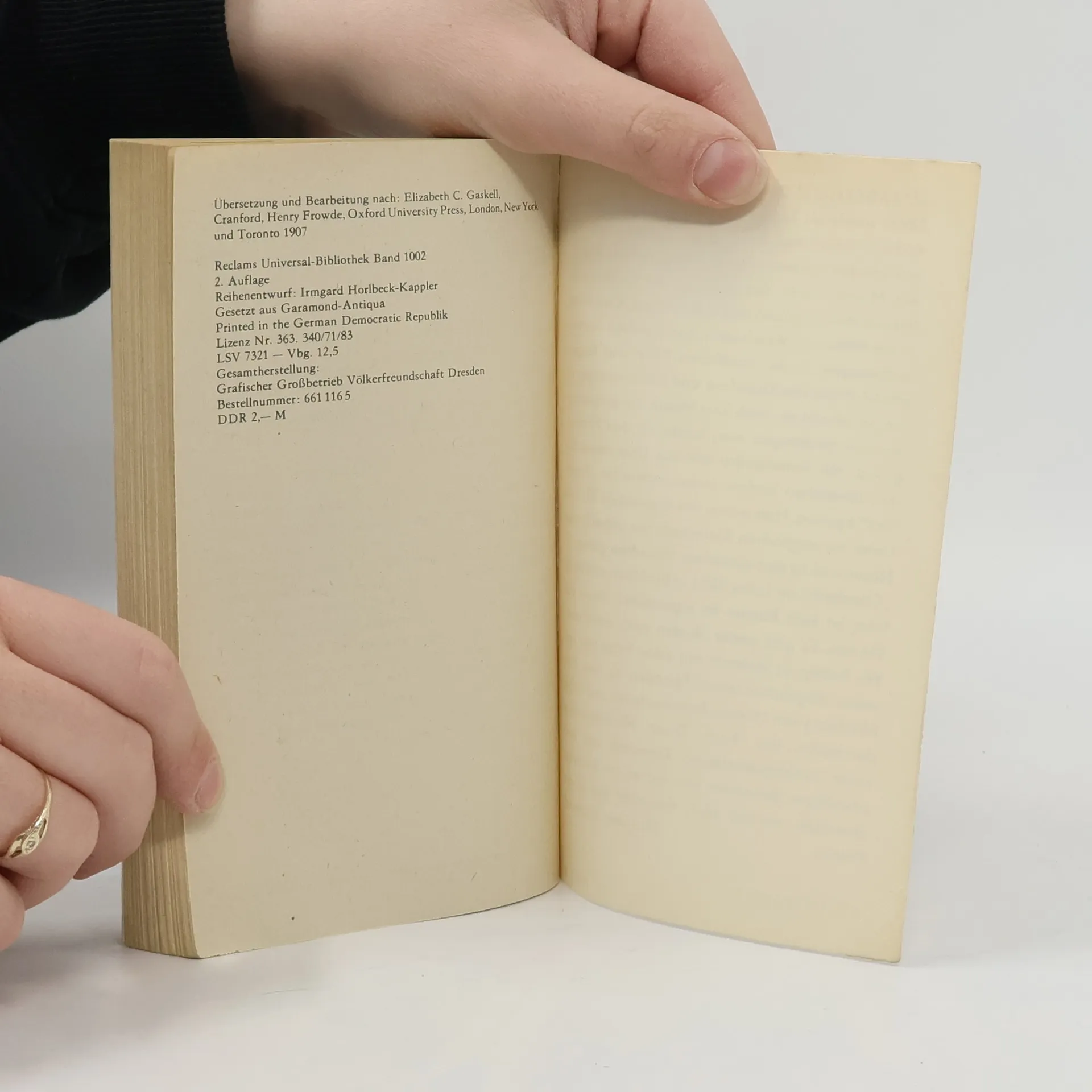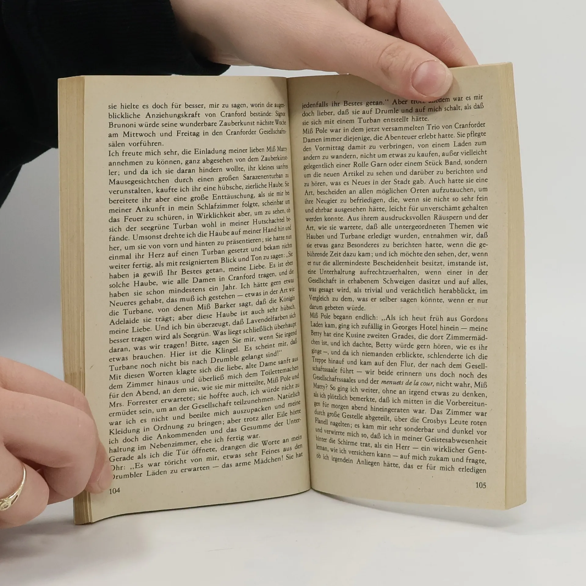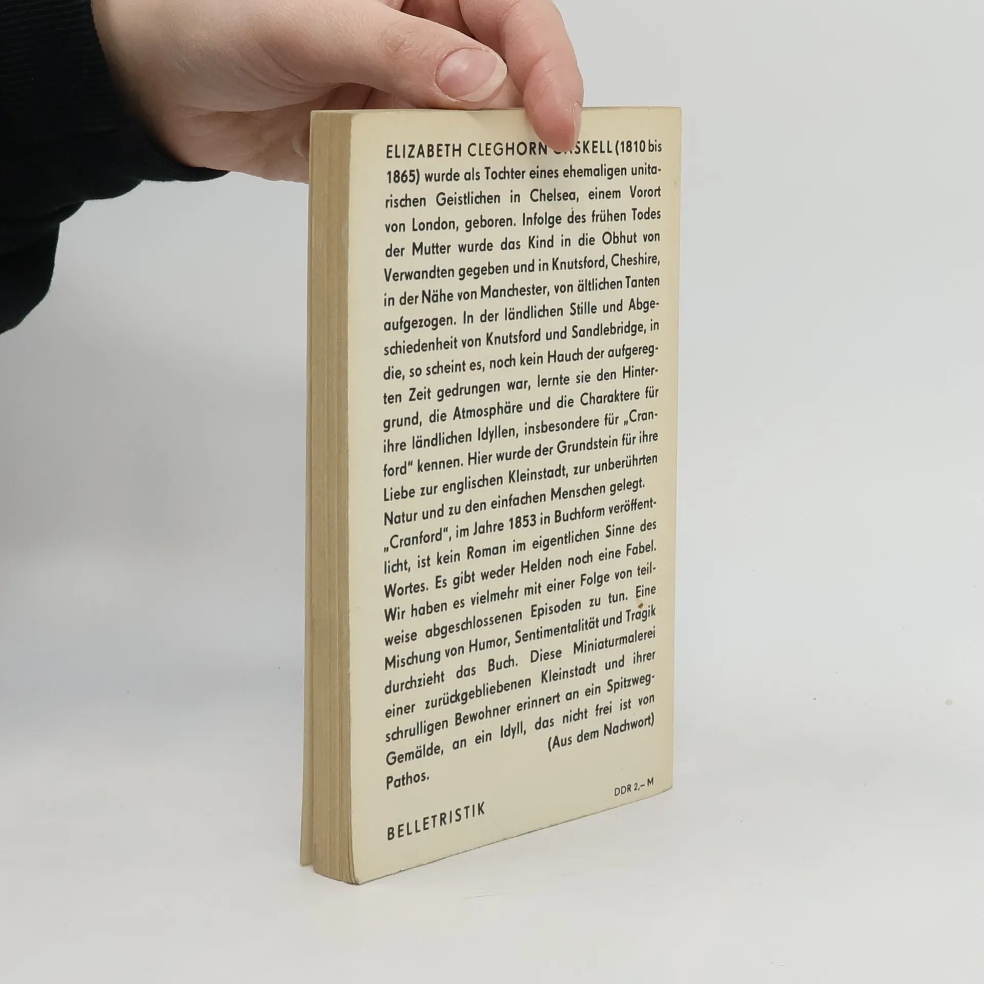 ELIZABETH CLEGHORN GASKELL (1810 bis 1865) wurde als Tochter eines ehemaligen unitarischen Geistlichen in Chelsea, einem Vorort von London, geboren. Infolge des frühen Todes der Mutter wurde das Kind in die Obhut von Verwandten gegeben und in Knutsford, Cheshire, in der Nähe von Manchester, von ältlichen Tanten aufgezogen. In der ländlichen Stille und Abgeschiedenheit von Knutsford und Sandlebridge, in die, so scheint es, noch kein Hauch der aufgeregten Zeit gedrungen war, lernte sie den Hintergrund, die Atmosphäre und die Charaktere für ihre ländlichen Idyllen, insbesondere für 'Cranford' kennen. Hier wurde der Grundstein für ihre Liebe zur englischen Kleinstadt, zur unberührten Natur und zu den einfachen Menschen gelegt. 'Cranford', im Jahre 1853 in Buchform veröffentlicht, ist kein Roman im eigentlichen Sinne des Wortes. Es gibt weder Helden noch eine Fabel. Wir haben es vielmehr mit einer Folge von teilweise abgeschlossenen Episoden zu tun. Eine Mischung von Humor, Sentimentalität und Tragik durchzieht das Buch. Diese Miniaturmalerei einer zurückgebliebenen Kleinstadt und ihrer schrulligen Bewohner erinnert an ein Spitzweg-Gemälde, an ein Idyll, das nicht frei ist von Pathos.