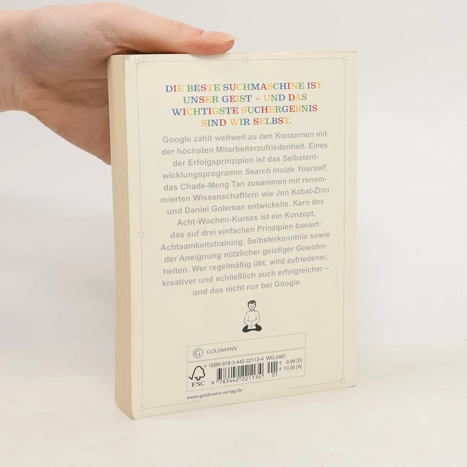 Google zählt weltweit zu den Konzernen mit der höchsten Mitarbeiterzufriedenheit. Eines der Erfolgsprinzipien ist das revolutionäre Selbstentwicklungsprogramm Search Inside Yourself, das Google-Veteran Chade-Meng Tan zusammen mit renommierten Wissenschaftlern wie Jon Kabat-Zinn und Daniel Goleman entwickelte. Kern des Acht-Wochen-Kurses ist ein leicht umsetzbares Achtsamkeitskonzept, das auf drei einfachen Prinzipien basiert: Aufmerksamkeitstraining, Selbsterkenntnis sowie der Aneignung nützlicher geistiger Gewohnheiten. Wer regelmäßig übt, wird im Beruf wie im Privatleben zufriedener, gelassener, kreativer und schließlich auch erfolgreicher – und das nicht nur bei Google.