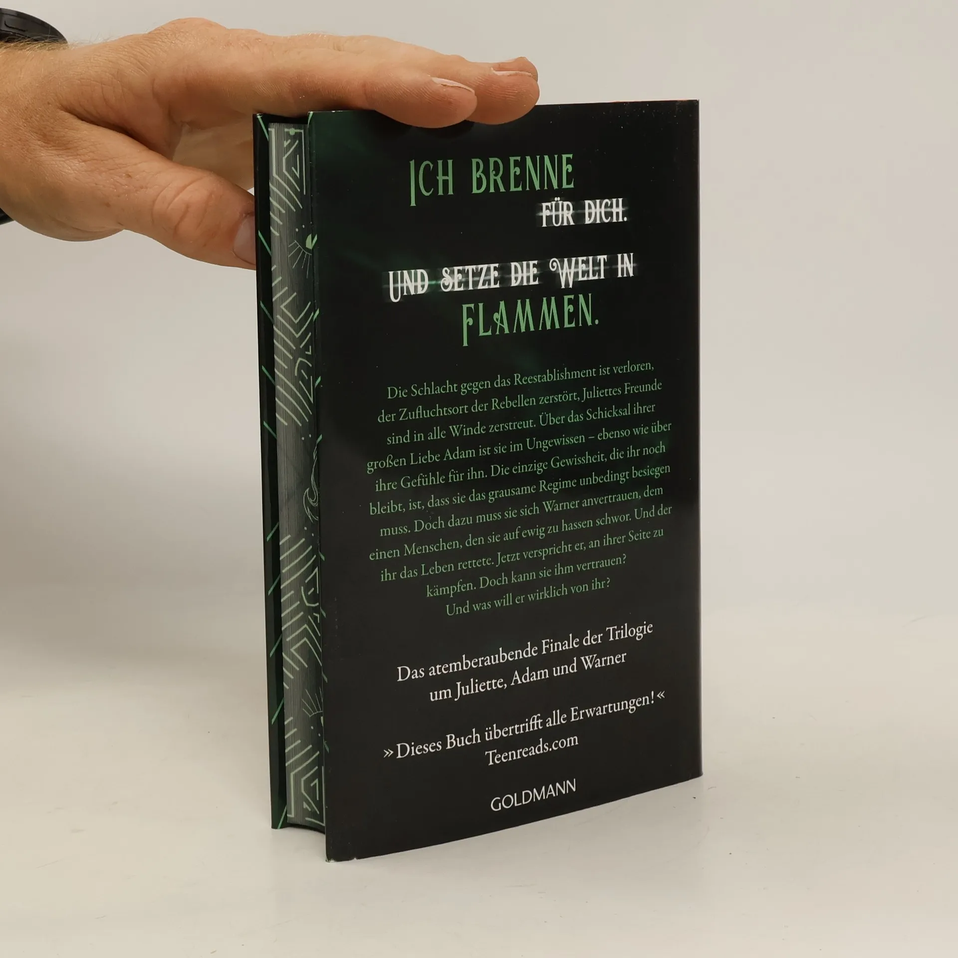 Die Schlacht gegen das Reestablishment ist verloren, der Zufluchtsort der Rebellen zerstört, Juliettes Freunde sind in alle Winde zerstreut. Über das Schicksal ihrer großen Liebe Adam ist Juliette im Ungewissen –– ebenso wie über ihre Gefühle für ihn. Die einzige Gewissheit, die sie noch hat: Sie muss das grausame Regime unbedingt besiegen! Doch dazu bleibt ihr nichts anderes übrig, als sich Warner anzuvertrauen, dem einen Menschen, den sie auf ewig zu hassen schwor. Und der ihr das Leben rettete. Jetzt verspricht er, an ihrer Seite zu kämpfen. Doch kann Juliette ihm vertrauen? Und was will er wirklich von ihr? Die TikTok Sensation – Mitreißende Young Adult Romantasy-Reihe mit Suchtfaktor für alle Fans von Leigh Bardugo, Sarah J. Maas und Victoria Aveyard. Dieses Buch ist bereits unter dem Titel „Ich brenne für dich“ erschienen.