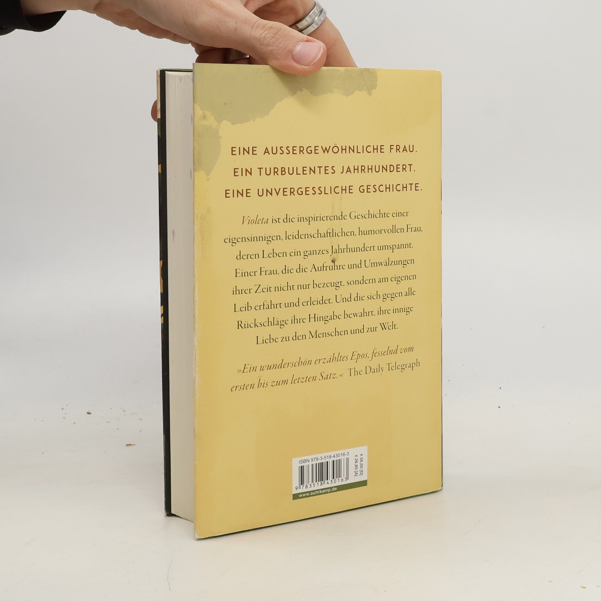 An einem stürmischen Tag des Jahres 1920 kommt sie zur Welt, jüngste Schwester von fünf übermütigen Brüdern, Violeta del Valle. Die Auswirkungen des Krieges sind noch immer spürbar, da verwüstet die Spanische Grippe bereits ihre südamerikanische Heimat. Zum Glück hat der Vater vorgesorgt, die Familie kommt durch, doch schon droht das nächste Unheil, die Weltwirtschaftskrise wird das vornehme Stadtleben, in dem Violeta aufwächst, für immer beenden, die del Valles ziehen sich ins wild-schöne Hinterland zurück. Dort wird Violeta volljährig, und schon steht der erste Verehrer vor der Tür …Violeta erzählt uns selbst ihr Leben, am Ende ihrer Tage schreibt sie ihrem geliebten Enkel einen langen Brief – sie schreibt von ihren halsbrecherischen Affären, den Jahren der Armut, von schrecklichen Verlusten und tiefempfundener Freude, von historischen Vorkommnissen, die ihr Leben geprägt haben: von dem Kampf für die Rechte der Frauen, dem Aufstieg und Fall von Tyrannen und von zwei schrecklichen Pandemien. Violeta ist die inspirierende Geschichte einer eigensinnigen, leidenschaftlichen, humorvollen Frau, deren Leben ein ganzes Jahrhundert umspannt. Einer Frau, die Aufruhr und Umwälzungen ihrer Zeit nicht nur bezeugt, sondern am eigenen Leib erfährt und erleidet. Und die sich gegen alle Rückschläge ihre Hingabe bewahrt, ihre innige Liebe zu den Menschen und zur Welt.