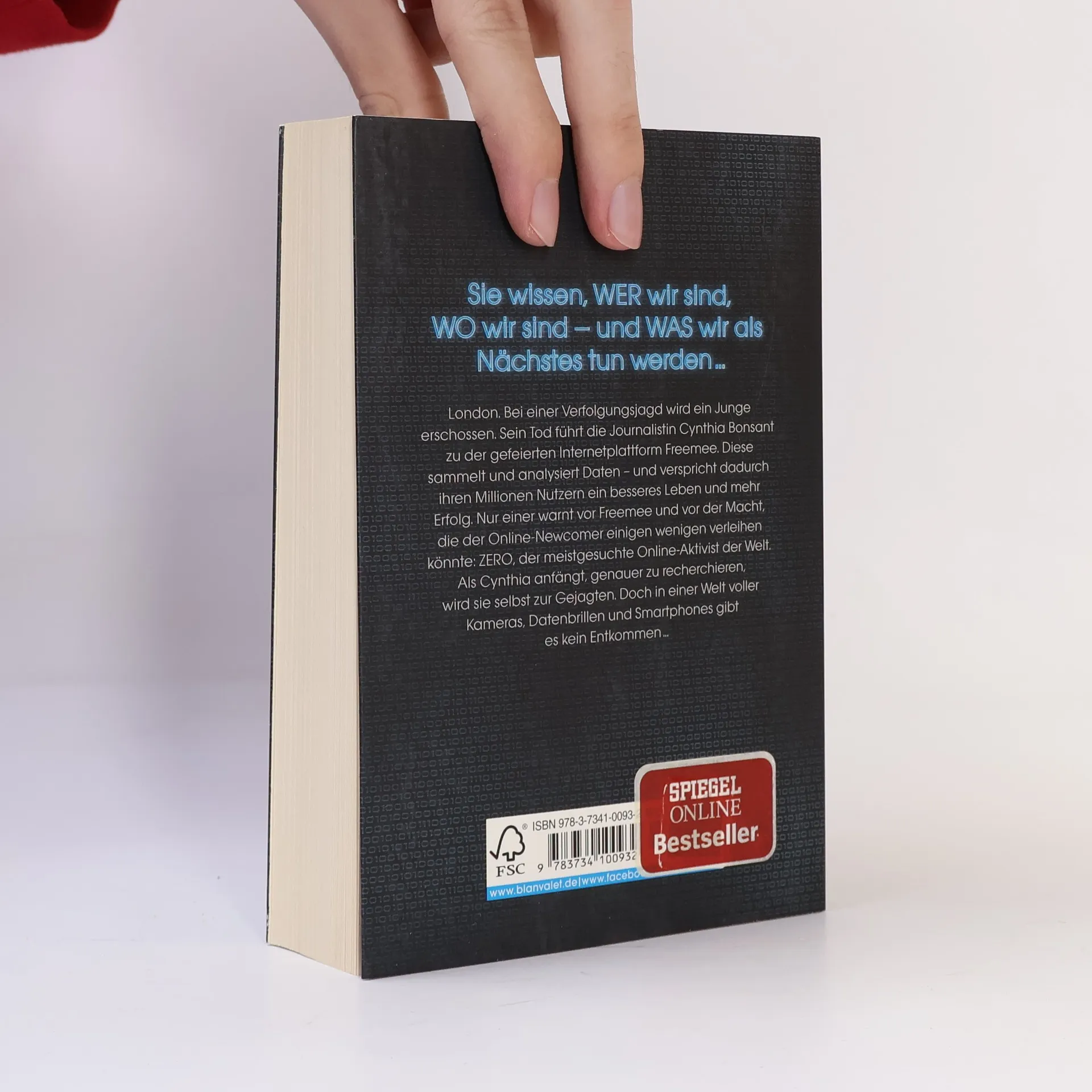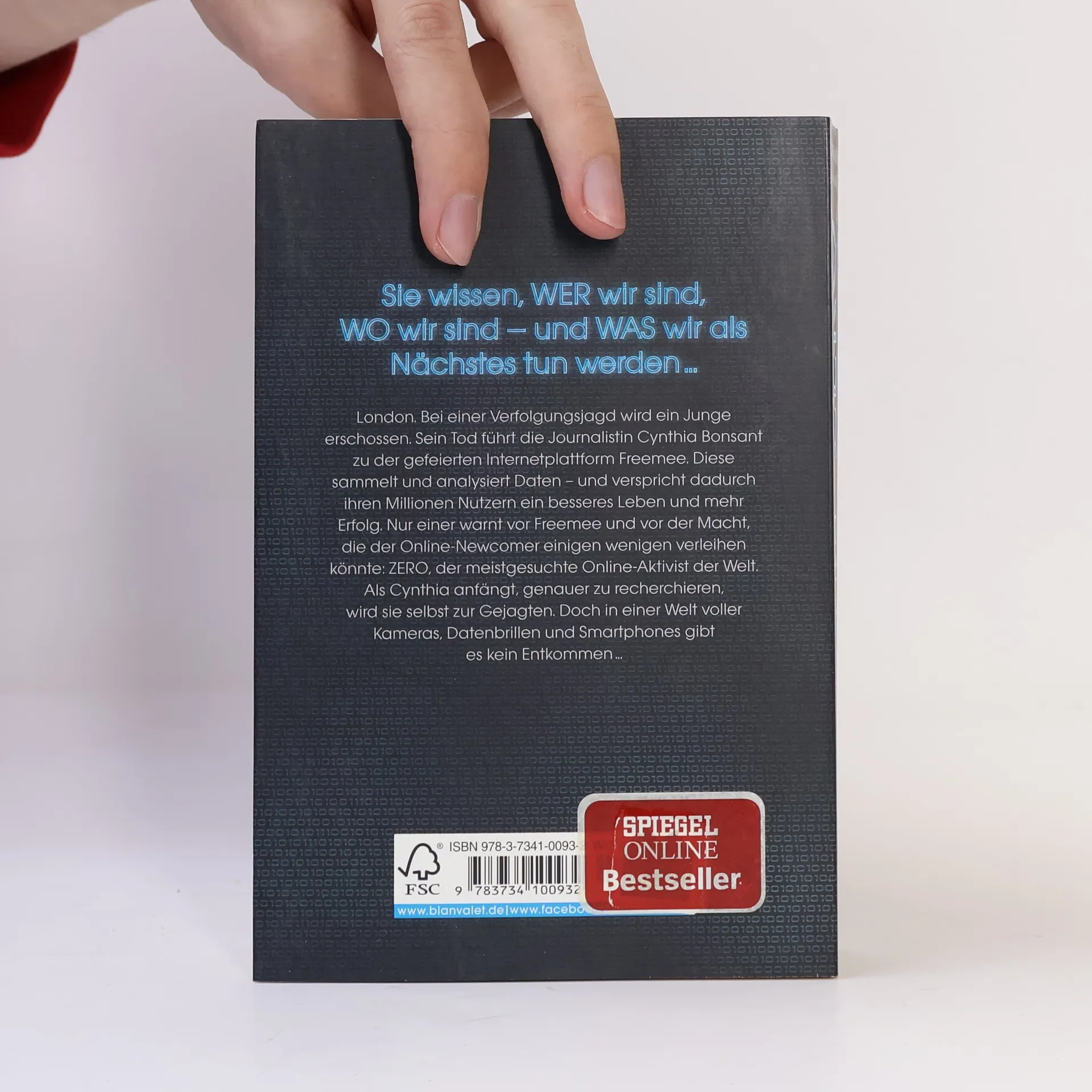 Wer sich im Netz bewegt, für den gibt es kein Entkommen. London. Bei einer Verfolgungsjagd wird ein Junge erschossen. Sein Tod führt die Journalistin Cynthia Bonsant zu der gefeierten Internetplattform Freemee. Diese sammelt und analysiert Daten – und verspricht dadurch ihren Millionen Nutzern ein besseres Leben und mehr Erfolg. Nur einer warnt vor Freemee und vor der Macht, die der Online-Newcomer einigen wenigen verleihen könnte: ZERO, der meistgesuchte Online-Aktivist der Welt. Als Cynthia anfängt, genauer zu recherchieren, wird sie selbst zur Gejagten. Doch in einer Welt voller Kameras, Datenbrillen und Smartphones kann man sich nicht verstecken …