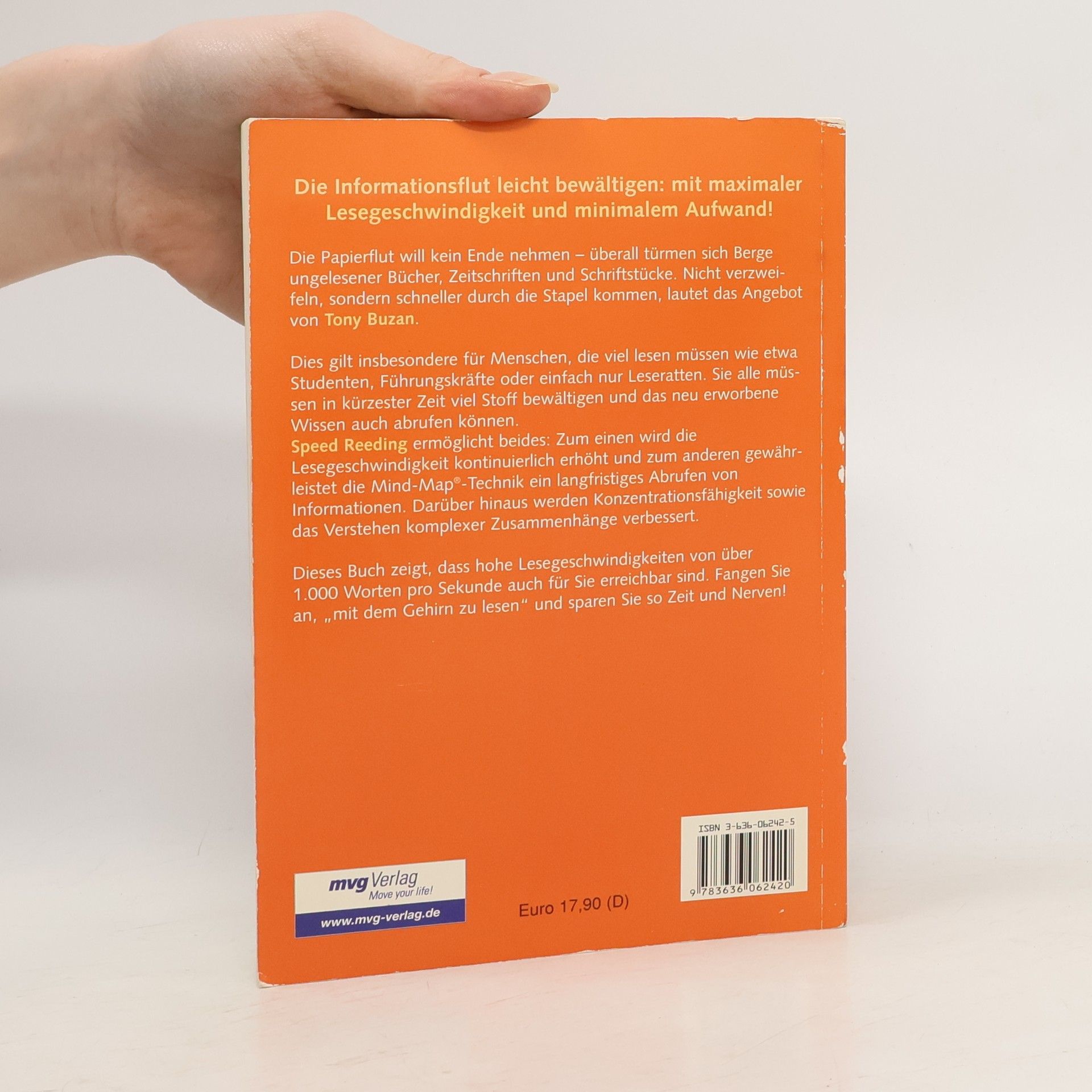 Die Papierflut will kein Ende nehmen. Überall türmen sich Berge ungelesener Schriftstücke. Nicht verzweifeln, sondern flotter durch die Stapel kommen, lautet das Angebot von Tony Buzan. Mit seiner Schnelllesetechnik lässt sich die Konzentration steigern und das Lesetempo vervielfachen. Der Kurs ist übersichtlich aufgebaut: Schrittweise trainiert man bis zur persönlichen Höchstgeschwindigkeit. Die Lösung für alle, die in kürzester Zeit viel Stoff bewältigen müssen: Manager, Wissenschaftler, Studenten, Fachkräfte, Juristen und viele andere mehr. Der Bestseller liegt jetzt in aktualisierter Neuauflage vor.
