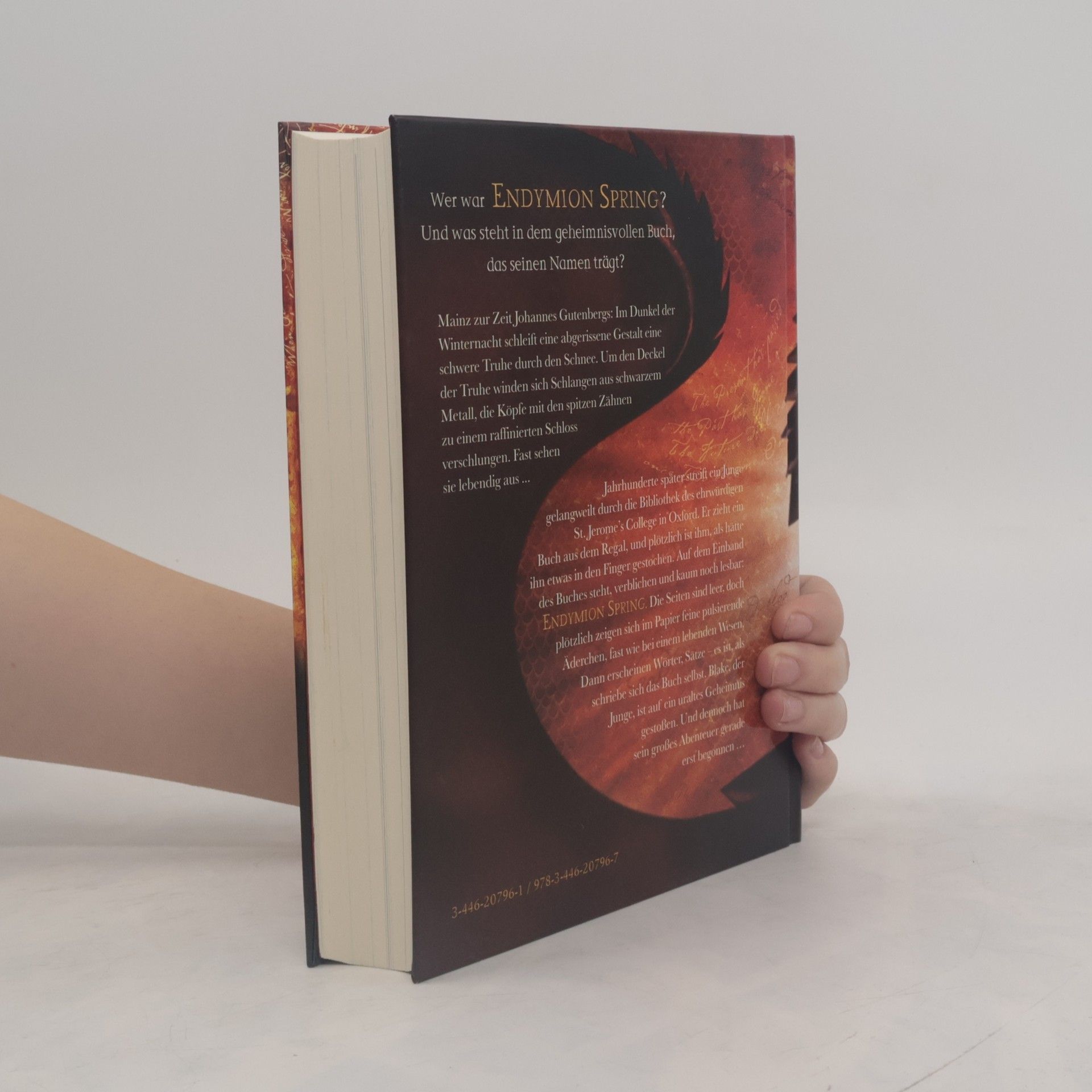 Mainz zur Zeit Johannes Gutenbergs: Im Dunkel der Winternacht schleift eine abgerissene Gestalt eine schwere Truhe durch den Schnee. Um den Deckel der Truhe winden sich Schlangen aus schwarzem Metall, die Köpfe mit spitzen Zähnen zu einem raffinierten Schloss verschlungen. Fast sehen sie lebendig aus ... Jahrhunderte später streift ein Junge gelangweilt durch die Bibliothek des ehrwürdigen St. Jerome's College in Oxford. Er zeiht ein Buch aus dem Regal, und plötzlich ist ihm, als hätte ihn etwas in den Finger gestochen. Auf dem Einband des Buches steht, verblichen und kaum noch lesbar: Endymion Spring. Die Seiten sind leer, doch plötzlich zeigen sich im Papier feine pulsierende Äderchen, fast wie bei einem lebenden Wesen. Dann erscheinen Wörter, Sätze - es ist, als schriebe sich das Buch selbst. Blake, der Junge, ist auf ein uraltes Geheimnis gestoßen. Und dennoch hat sein großes Abenteuer gerade erst begonnen ...