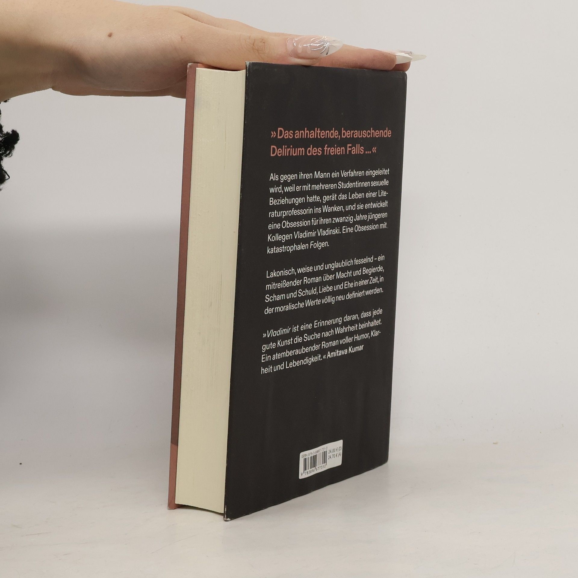 Sie ist Ende fünfzig, Literaturprofessorin an einem kleinen College an der amerikanischen Ostküste und beliebt bei ihren Studentinnen. Seit dreißig Jahren ist sie mit John verheiratet, der am selben College unterrichtet. Sie war immer stolz darauf, mit John eine offene Beziehung zu führen, intellektuell, finanziell und emotional unabhängig zu sein. Als John jedoch seine Suspendierung fürchten muss, weil eine der vielen Studentinnen, mit denen er im Laufe der Jahre eine Affäre hatte, ein Verfahren gegen ihn angestrengt hat, gerät das Wertesystem der Ich-Erzählerin ins Wanken: Ihre Studentinnen und ihre Tochter fordern sie auf, sich zu trennen, die Fakultät möchte sie beurlauben. In dieser Situation trifft sie Vladimir Vladinski - ein 20 Jahre jüngerer Kollege und gefeierter Romanautor - und entwickelt für ihn eine folgenschwere Obsession.