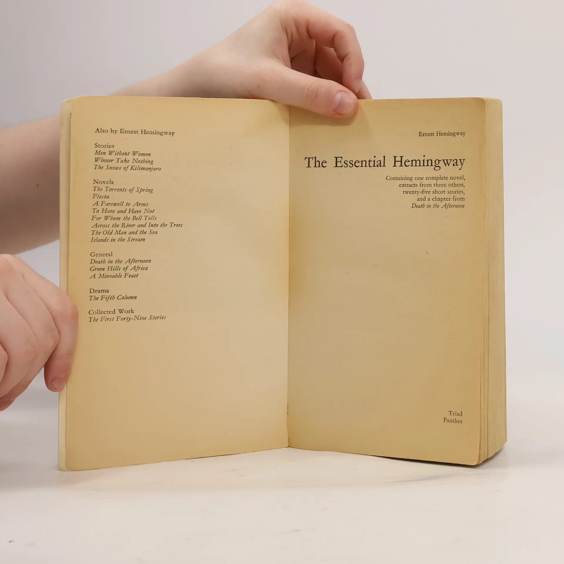 This collection comprises: Fiesta, Hemingway's first major novel; long extracts from A Farewell to Arms, To Have and Have Not and For Whom the Bell Tolls; 25 complete short stories; and the Epilogue to Death in the Afternoon.