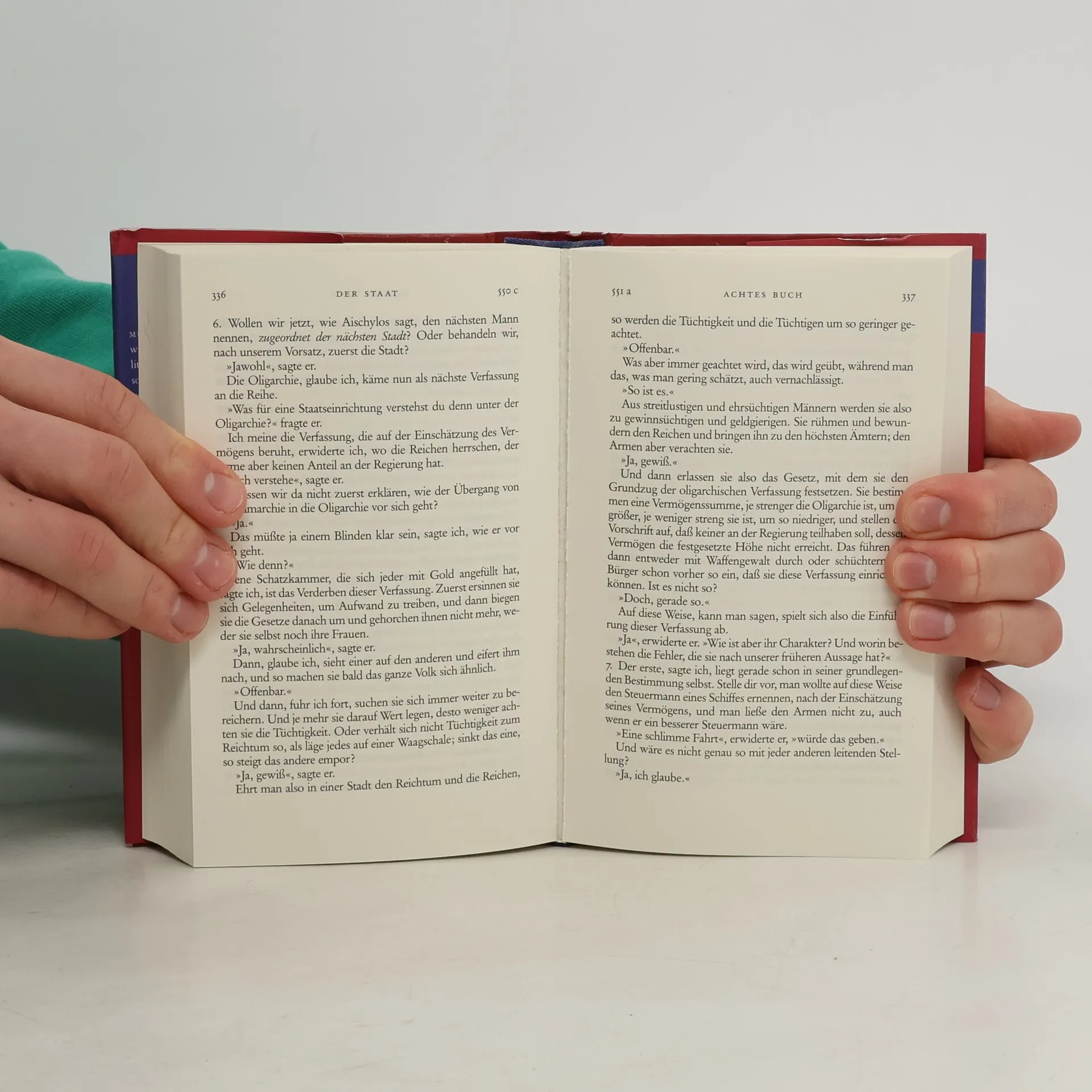 Mit der 'Politeia' wurde Platon zum Begründer einer neuen literarischen Gattung: der politisch-philosophischen Utopie. Platons Staatslehre und seine Ausführungen zu so unterschiedlichen Gebieten wie der Theorie der Erziehung, der Dichtkunst, der Ethik und Tugendlehre sowie der Seelenlehre beeinflussen die pilosophischen, politischen und ethischen Diskussionen bis in unsere Tage. Übersetzt von Rudolf Rufener. Einführung, Erläuterungen, Inhaltsübersicht, Literaturhinweise und herausgegeben von Thomas Alexander Szlezák. Format 10,7 x 17,3 cm. Gebunden mit Schutzumschlag.