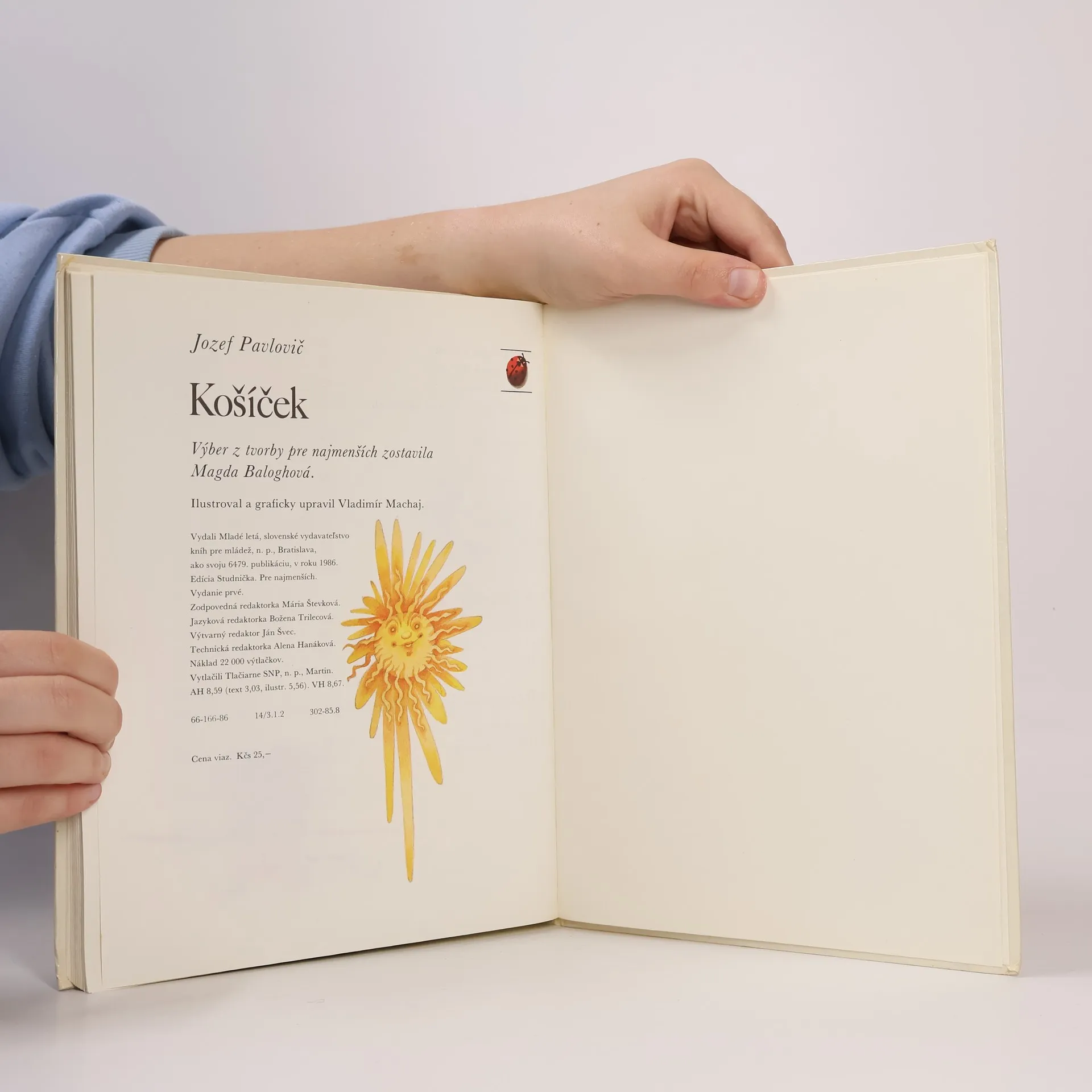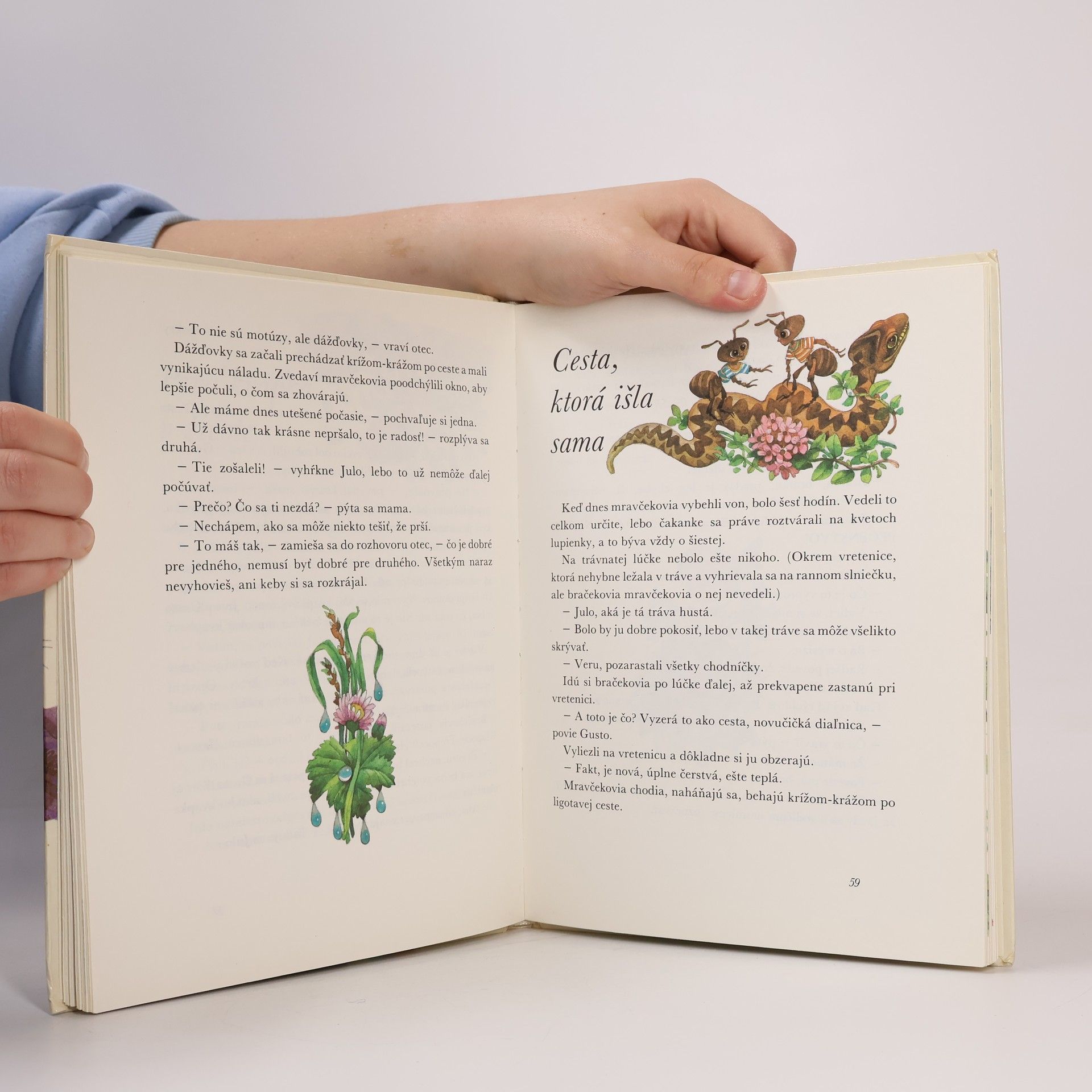 Rozprávky a básničky pre deti. Obsah: Čo sú moje očká ?-Čo mám po kom ?, Hralo sa štvoro mačiatok, Prvá pomoc, Poď, bábika, Pre mamičku, Náušnice, Broskyne, Vlci, Kvet, Pipky, Čo vraveli kuriatka, Šušušu, Počtár, Nôžky, Slzy, Odvezte sa, Čaj, Auto, Vlak, Panelový dom, Parašutista, Námornícka, Mesiac, Kvapi-kvapi. Kde sa voda točí-Veľká hádka, Kačka, Rybári, Píšťalôčka zelená, Išlo húsatko. Kam sa skryli púpavy-Snežienka, Nezábudka, Fialka, Konvalinky, Stračia nôžka, Nevädze, Kúkoľ, Vlčí mak, Margarétka, Padaj, dáždik. Letný deň-Tralala, Kuriatko a obláčik, Húsky, Ako sa húsatkám nechcelo na svet, Platňa, Gramofón, Ach, ach, ach, Ako si maco pral kožuch. Prečo chodia žriebätká bosé-Ujo našiel, Žriebätko, Ide psíček, Ako psíček nakupoval, Srdce, Myšiačik Miško, Teliatko Vladko a Katka, Biele kúzlo, Zahrajme sa s Vladkom a Katkou, Ďalekohľad, ktorému chýba sklíčko. Bračekovia mravčekovia-Bola teplá noc, Prvé skúsenosti, Prvá kvapka v živote, Cesta, ktorá išla sama, Čmeliak Gorazd, Ako sa Julo s Gustom opaľovali, Letecký deň. Lienka Anulienka-Basa tvrdí muziku, Lienkin dom, Baterkový vysávač, Klobúk. Ježko Jožko a krtko Rudko-O prvom jarnom dni, O ceste do sveta, O ceste do hory. Prekvapenie na dne košíka-Cirkus Afrika. Prvé vydanie. Cena knihy v čase vydania: 25.- Kčs.