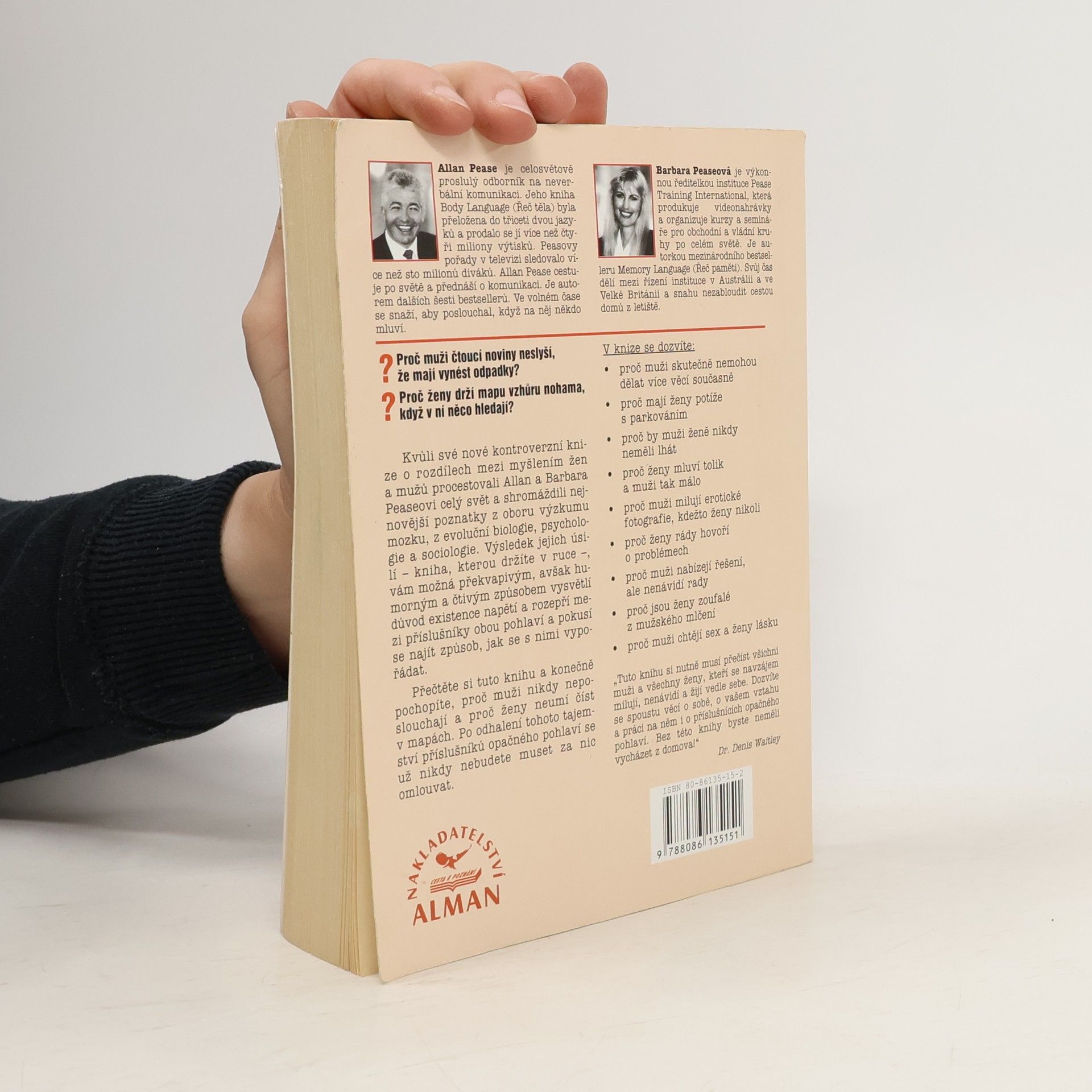 Kvůli své kontroverzní knize o rozdílech mezi myšlením žen a mužů procestovali Allan a Barbara Peaseovi celý svět a shromáždili nejnovější poznatky z oboru výzkumu mozku, z evoluční biologie, psychologie a sociologie. Výsledek jejich úsilí, vám možná překvapivým, avšak humorným a čtivým způsobem vysvětlí důvod existence napětí rozepří mezi příslušníky obou pohlaví a pokusí se najít způsob, jak se s nimi vypořádat. Přečtěte si tuto knihu a konečně pochopíte, proč muži nikdy neposlouchají a proč ženy neumí číst v mapách. Po odhalení tohoto tajemství příslušníků opačného pohlaví se už nikdy nebudete muset za nic omlouvat.