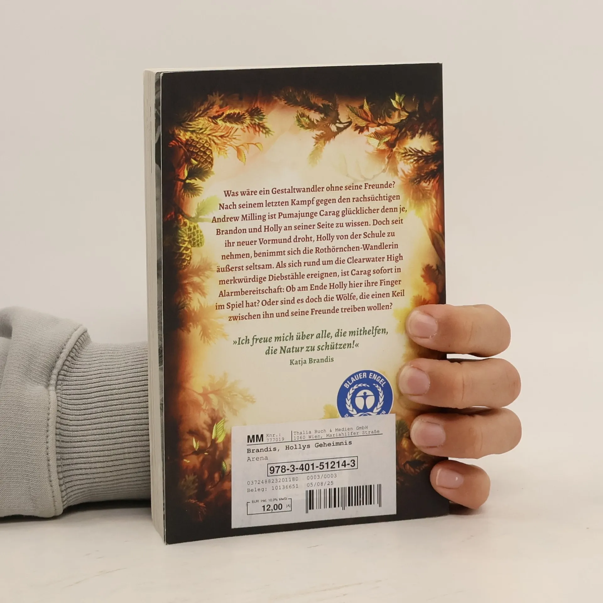 Die Bestsellerreihe „Woodwalkers“ der Erfolgsautorin Katja Brandis jetzt auch im umweltbewussten Taschenbuch. Was wäre ein Gestaltwandler ohne seine Freunde? Nach seinem letzten Kampf gegen den rachsüchtigen Andrew Milling ist Carag glücklicher denn je, Brandon und Holly an seiner Seite zu wissen. Doch irgendwie benimmt sich Holly in letzter Zeit äußerst seltsam. Als sich rund um die Clearwater High plötzlich merkwürdige Diebstähle ereignen, ist Carag sofort in Alarmbereitschaft: Ob am Ende Holly hier ihre Finger im Spiel hat? Oder sind es doch die Wölfe, die einen Keil zwischen ihn und seine Freundin treiben wollen? Vielleicht weiß ja der neue Lehrer für Tiersprachen, Mr Goodfellow Rat … Ausgezeichnet mit dem Blauen Engel. Alle Bände der Reihe „Woodwalkers“: Woodwalkers (1) Carags Verwandlung Woodwalkers (2) Gefährliche Freundschaft Woodwalkers (3) Hollys Geheimnis Woodwalkers (4) Fremde Wildnis Woodwalkers (5) Feindliche Spuren Woodwalkers (6) Tag der Rache In der Reihe „Seawalkers“ sind beim Arena Verlag bisher erschienen: Seawalkers (1) Gefährliche Gestalten Seawalkers (2) Rettung für Shari Seawalkers (3) Wilde Wellen Seawalkers (4) Ein Riese des Meeres Weitere Bücher sind in Vorbereitung.