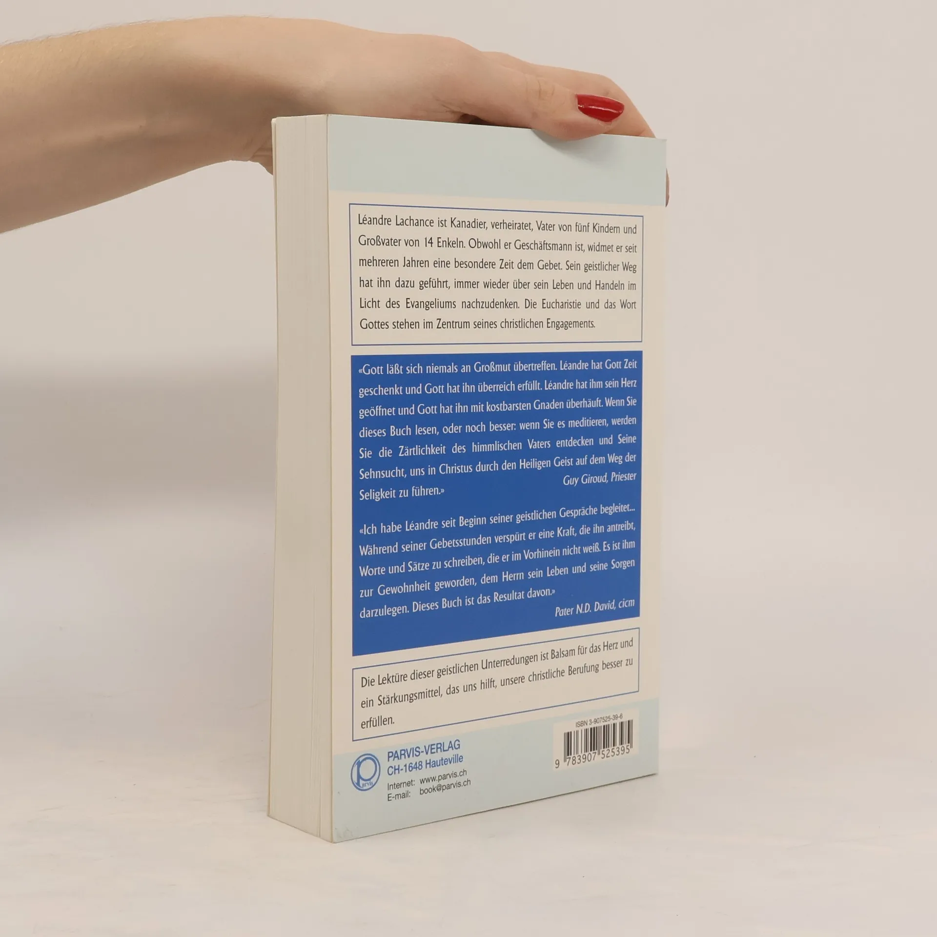 Léandre Lachance ist Kanadier, verheiratet, Vater von fünf Kindern und Großvater von 14 Enkeln. Obwohl er Geschäftsmann ist, widmet er seit mehreren Jahren eine besondere Zeit dem Gebet. Sein geistlicher Weg hat ihn dazu geführt, immer wieder über sein Leben und Handeln im Licht des Evangeliums nachzudenken. 'Gott läßt sich niemals an Großmut übertreffen. Léandre hat Gott Zeit geschenkt und Gott hat ihn überreich erfüllt. Léandre hat ihm sein Herz geöffnet und Gott hat ihn mit kostbarsten Gnaden überhäuft. Wenn Sie dieses Buch lesen, oder noch besser: wenn Sie es meditieren, werden Sie die Zärtlichkeit des himmlischen Vaters entdecken und Seine Sehnsucht, uns in Christus durch den Heiligen Geist auf dem Weg der Seligkeit zu führen.' (Guy Giroud, Priester) Die Lektüre dieser geistlichen Unterredungen ist Balsam für das Herz und ein Stärkungsmittel, das uns hilft, unsere christliche Berufung besser zu erfüllen.