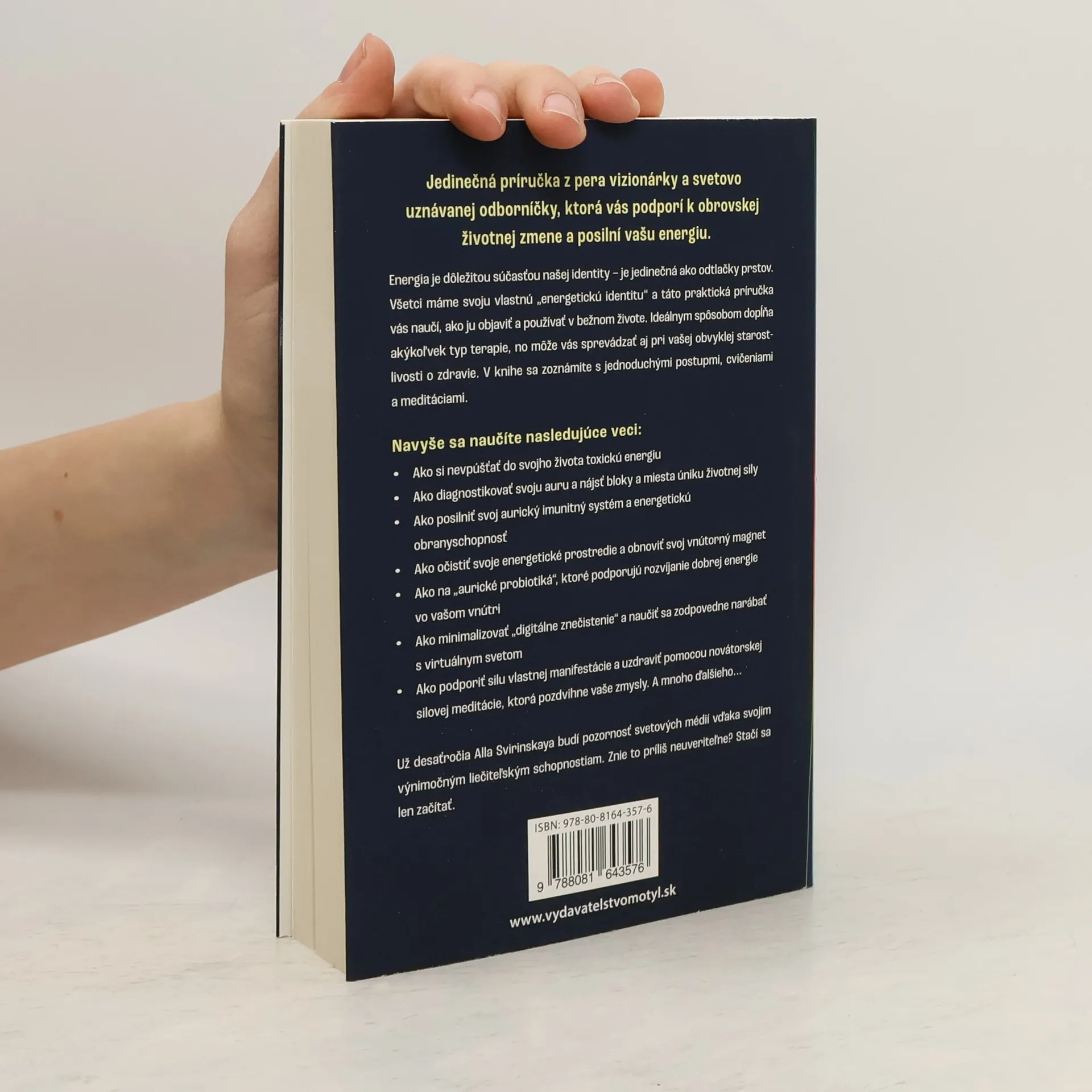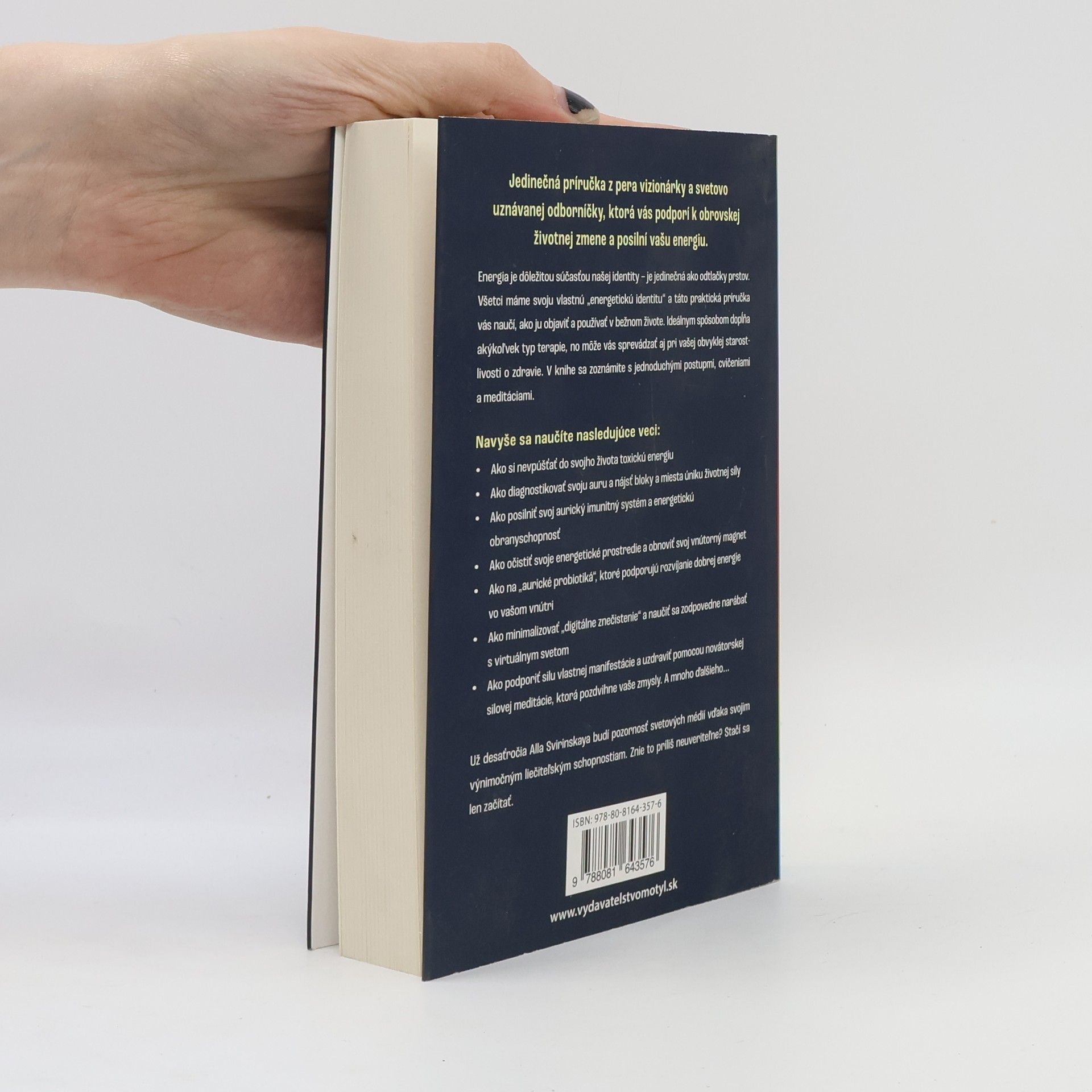 Jedinečná príručka z pera vizionárky a svetovo uznávanej odborníčky na wellness, ktorá vás podporí k obrovskej životnej zmene a posilní vašu energiu. Energia je dôležitou súčasťou našej identity – je jedinečná ako odtlačky prstov. Všetci máme svoju vlastnú „energetickú identitu“a táto praktická príručka vás naučí, ako ju objaviť a používať v bežnom živote. Ideálnym spôsobom dopĺňa akýkoľvek typ terapie, no môže vás sprevádzať pri vašej obvyklej starostlivosti o zdravie. V knihe sa zoznámite s jednoduchými postupmi, cvičeniami a meditáciami. Navyše sa naučíte aj tieto nasledujúce veci: Ako si nevpúšťať do svojho života toxickú energiu Ako diagnostikovať svoju auru a nájsť bloky a miesta úniku životnej sily Ako posilniť svoj aurický imunitný systém a energetickú obranyschopnosť Ako očistiť svoje energetické prostredie a obnoviť svoj vnútorný magnet Ako na „aurické probiotiká“, ktoré podporujú rozvíjanie dobrej energie vo vašom vnútri Ako minimalizovať „digitálne znečistenie“ a naučiť sa zodpovedne narábať s virtuálnym svetom Ako podporiť silu vlastnej manifestácie a uzdraviť pomocou novátorskej silovej meditácie, ktorá pozdvihne vaše zmysly. A mnoho ďalšieho... Už desaťročia Alla Svirinskaya budí pozornosť svetových médií vďaka svojím výnimočným liečiteľským schopnostiam. Znie to príliš neuveriteľne? Stačí sa len začítať.