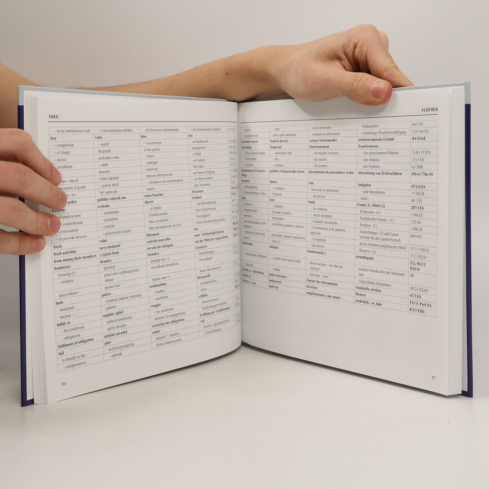 Anglicko-česko-francouzsko-německý slovník právní terminologie Evropských společenství má sloužit jako praktická pomůcka pro právníky a další odborníky, kteří se zabývají legislativou ES v hlavních pracovních jazycích Evropského společenství i v češtině. Slovník zahrnuje širokou škálu obecných i specifických právních termínů používaných v primárním právu ES. Výrazy v angličtině, francouzštině, němčině a češtině jsou přiřazeny podle svého významu a umístění v originálních textech bez ohledu na to, že z hlediska obecně etymologické¬ho by odpovídaly někdy výrazy adekvátnější. Překlad pomůže nejen pochopit význam výrazu, ale i vnitrostátní kontext, ve kterém lze daný výraz použít. V mnoha ohledech je struktura slovníku odrazem pracovního prostředí v EU. Přesné odkazy na články smluv rovněž zpřesňují a ilustrují přeložené termíny. Publikaci doplňuje věcný rejstřík českých, německých a francouzských hesel. --------------------------------------------------------------------------------