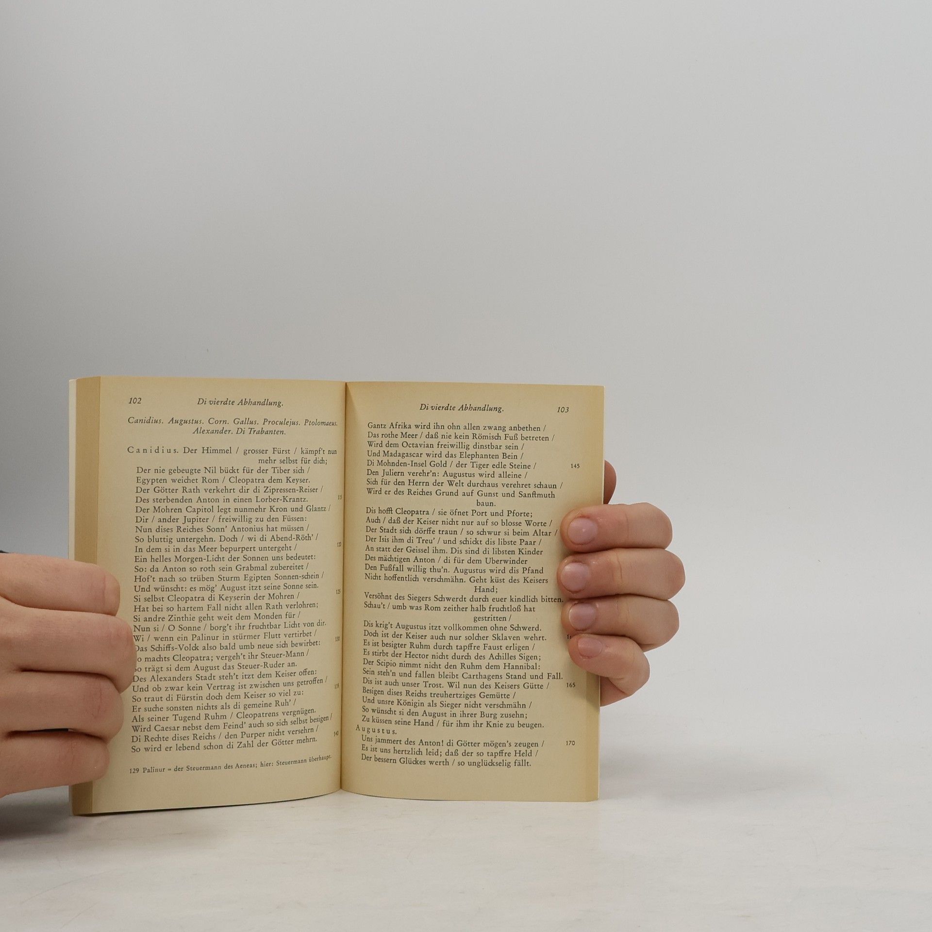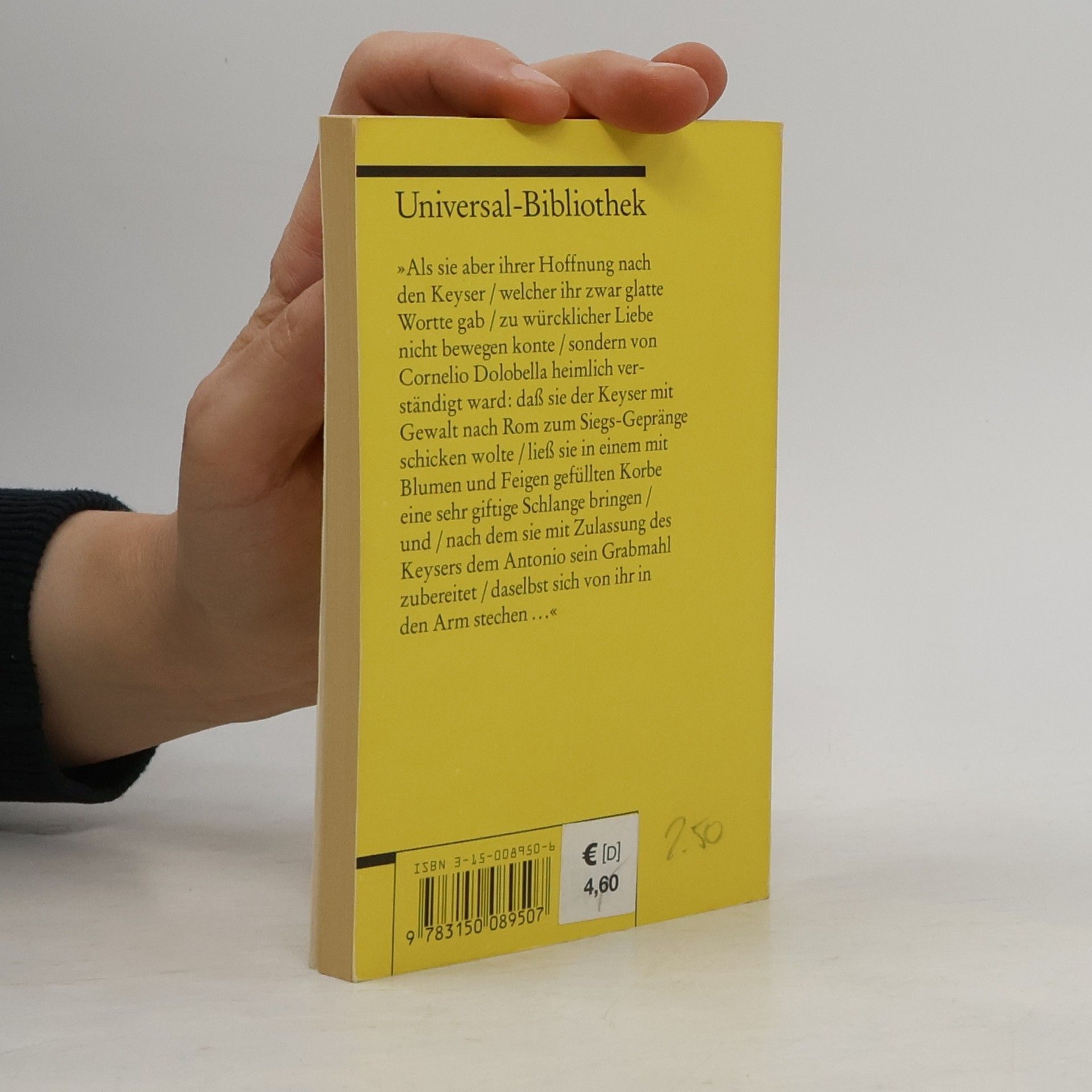 Daniel Casper von Cleopatra. Trauerspiel Nach Caesars Ermordung macht Cleopatra Marcus Antonius zur ihrem Geliebten um ihre Macht im Ptolemäerreichs zu erhalten. Als der jedoch die Seeschlacht bei Actium verliert und die römischen Truppen des Octavius unaufhaltsam vordrängen verleitet sie Antonius zum Selbstmord. Entstanden um 1655-1660, umgearbeitet um 1680. Erstdruck der ersten Breslau (Esaja Fellgibel), 1661. Erstdruck der zweiten Breslau (Jesaiae Fellgibel), 1680. Uraufführung 1661, Elisabethanum, Breslau. Hier in der zweiten Fassung von 1680. Neuausgabe mit einer Biographie des Autors. Herausgegeben von Karl-Maria Guth. Berlin 2016. Textgrundlage ist die Daniel Casper von Afrikanische Trauerspiele. Herausgegeben von Klaus Günther Just, Anton Hiersemann, 1957. Die Paginierung obiger Ausgabe wird in dieser Neuausgabe als Marginalie zeilengenau mitgeführt. Umschlaggestaltung von Thomas Schultz-Overhage unter Verwendung des Jakob Jordaens, Das Bankett der Kleopatra, 1653. Gesetzt aus der Minion Pro, 11 pt. Über den 1635 als ältester Sohn eines Beamten in Nimptsch in Schlesien geboren, schreibt Daniel Casper von Lohenstein bereits während der Schulzeit sein erstes Drama Ibrahim. Nach seinem Jurastudium und ausgedehnten Reisen kehrt er 1657 nach Breslau zurück, heiratet und läßt sich als Anwalt nieder. In dieser Zeit entstehen seine großen Dramen. 1670 wird er Syndikus der Stadt Breslau und bewährt sich in politischen Verhandlungen in Wien, woraufhin Kaiser Leopold ihn zum Kaiserlichen Rat ernennt. 1683 stirbt der Barockdichter Daniel Casper von Lohenstein in Breslau.