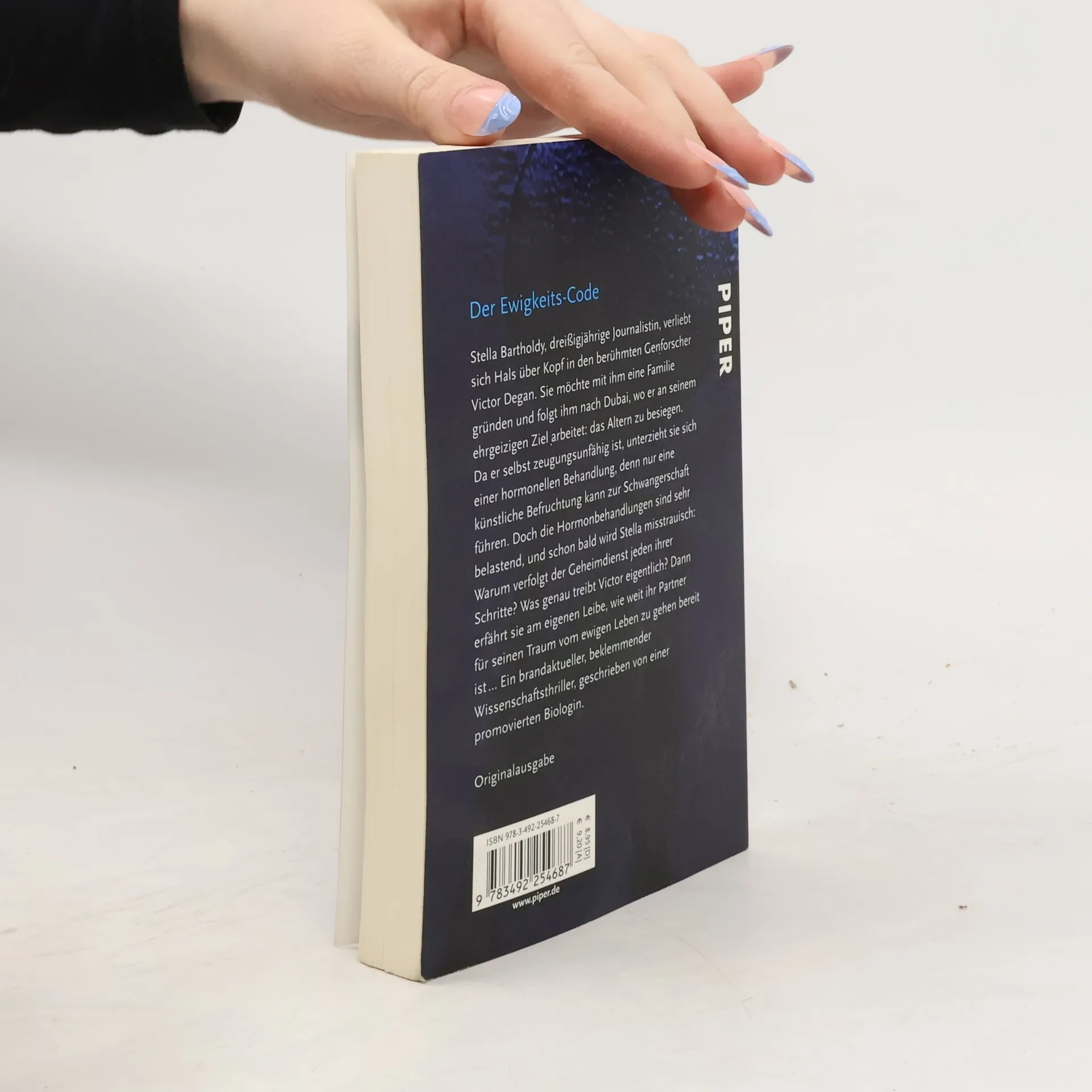 „Victor war ehrlich zu ihr. Und das war das Wichtigste.“ Wie falsch sie mit dieser Annahme liegt, merkt Stella erst, als es beinahe zu spät ist. Die dreißigjährige Journalistin Stella Bartholdy verliebt sich in den berühmten Genforscher Victor Degan. Hals über Kopf heiraten die beiden, und sie folgt ihm nach Dubai, wo er seine Forschungen betreibt. Victor arbeitet an einem ehrgeizigen Projekt: Er will das Alter besiegen. Zunächst ist Stella ungemein fasziniert von ihrem charismatischen Mann, doch dann beginnt die Fassade zu bröckeln. Schon bald ist sich Stella nicht mehr sicher, ob sie Victor vertrauen kann. Schließlich erfährt sie am eigenen Leibe, wie weit ihr Partner für seinen Traum vom ewigen Leben zu gehen bereit ist … Mitreißend und erschütternd: Ein Thriller, der Sie bis in Ihre Träume verfolgen wird!