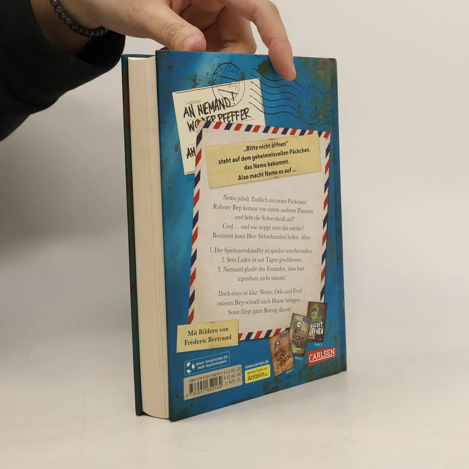 Was hat rote Augen und eine rostige Rüstung aus Blech? Nemos neue Monsterpost! Endlich ein neues Päckchen! Nemo wäre fast gestorben vor Langeweile. Aber damit ist es jetzt vorbei: Kaum ist der kleine Roboter Biep ausgepackt, beginnt alles zu schweben. Die Freunde müssen blitzschnell rauskriegen, wem Biep gehört, bevor die ganze Kleinstadt davonfliegt. Da kann nur noch Herr Siebzehnrübel helfen. Doch wo steckt der Spielzeughändler? In seinem Laden ist er jedenfalls nicht. Wenn Spielzeug plötzlich lebendig wird Nemo und seine Freunde Oda und Fred bekommen immer wieder seltsame Pakete zugeschickt. Eigentlich dürfen sie die Päckchen gar nicht öffnen, aber sie machen es trotzdem – mit katastrophalen Folgen! Denn aus jedem Paket springt ein Wesen, das nach Hause will. Quicklebendig, riesengroß und selten hilfreich. Die Buchreihe „Bitte nicht öffnen“: Geheimnisvolle Pakete, urkomische Figuren und spannende Abenteuer: Für Fans von mysteriösen Detektivgeschichten und lustiger Fantasy Yeti, Drache oder Vampir – hinter jedem Band versteckt sich ein anderes Monster Große Schrift und viele Bilder – ideal für Leseanfänger*innen und Zweitklässler*innen ab 8 Jahren Ein verlorenes Wesen, das nach Hause will, drei mutige Freunde und viele Überraschungen - für abenteuerlustige Mädchen und Jungen zum Vor- oder Selberlesen.