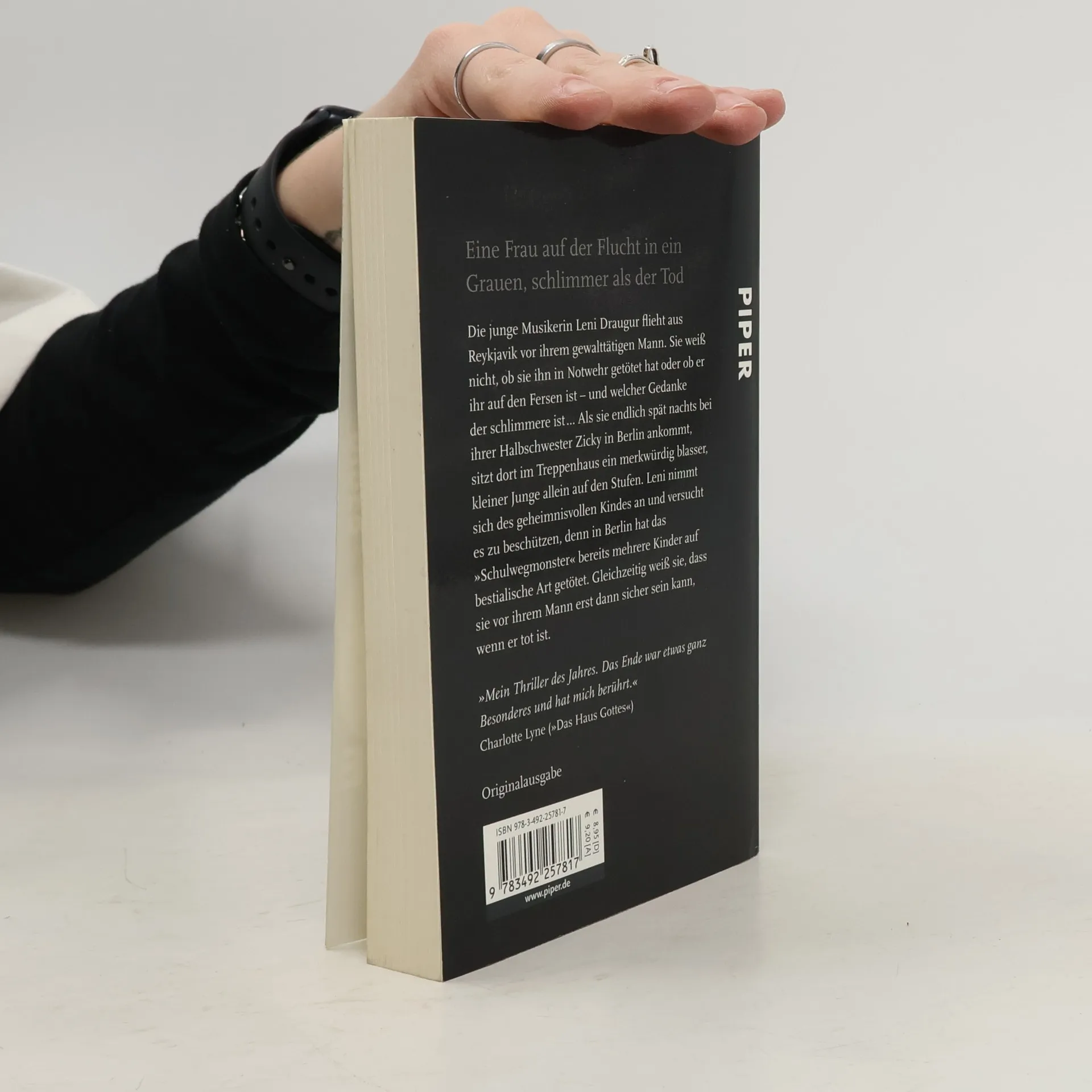 Die junge Musikerin Leni Draugur flieht aus Reykjavik vor ihrem gewalttätigen Mann. Sie weiß nicht, ob sie ihn in Notwehr getötet hat oder ob er ihr auf den Fersen ist – und sie weiß nicht, welcher Gedanke der schlimmere ist … Als Leni endlich spätnachts bei ihrer Halbschwester Zicky in Berlin ankommt, sitzt dort im Treppenhaus ein merkwürdig blasser kleiner Junge allein auf den Stufen. Leni nimmt sich des geheimnisvollen Jungen an, versucht ihn zu beschützen, denn in Berlin hat das 'Schulwegmonster' bereits mehrere Kinder auf bestialische Art getötet. Gleichzeitig weiß sie, dass sie vor ihrem Mann erst dann sicher sein kann, wenn er tot ist. Leni gerät in den Strudel der Ereignisse, und bald weiß sie selbst nicht mehr, ist sie Täterin oder Opfer? – Ein packender Psychothriller, in dem nichts so ist, wie es scheint!