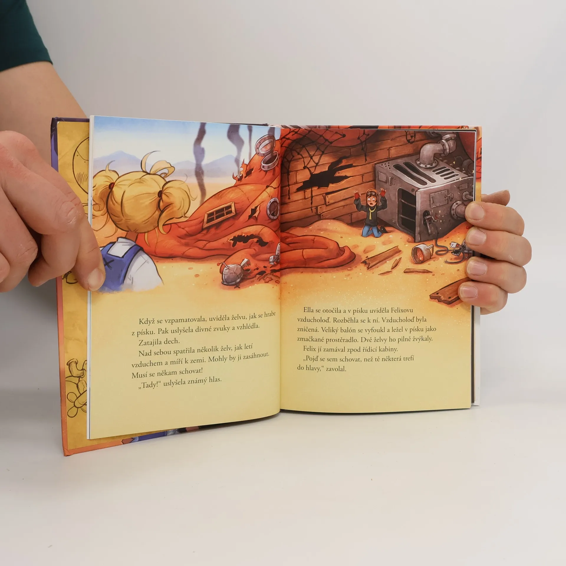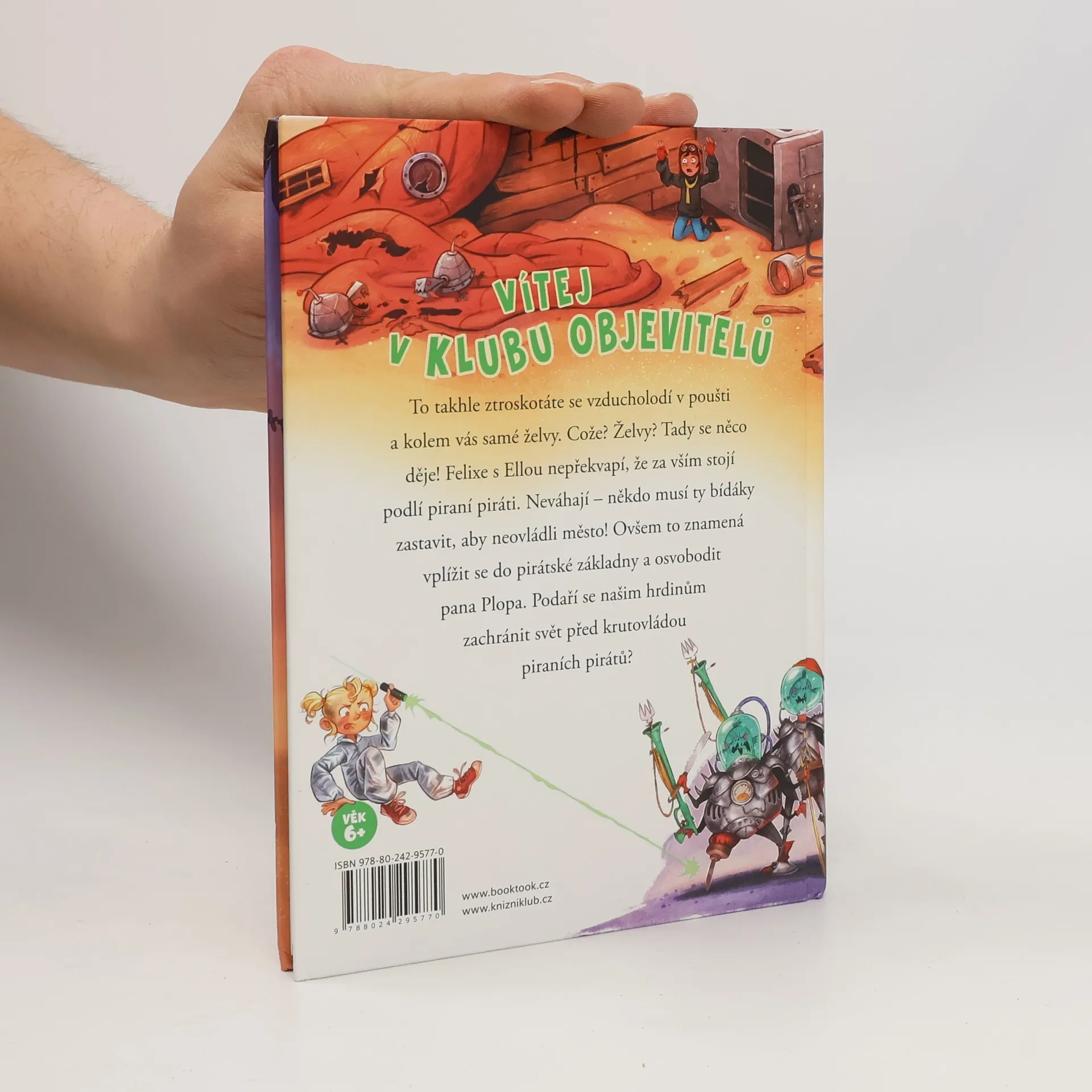 Felix a Ella přistanou se svou vzducholodí v poušti. Na tom není nic až tak zvláštního. Jenomže všude, kam se podívají, jsou jen samé želvy. Želvy v poušti? Tady se něco děje! Nepřekvapí je, že za vším stojí podlí piraní piráti. Felix s Ellou neváhají – někdo musí ty bídáky zastavit, aby neovládli město! Ovšem to znamená vplížit se do pirátské základny a osvobodit pana Plopa. Podaří se našim hrdinům zachránit svět před krutovládou piraních pirátů?