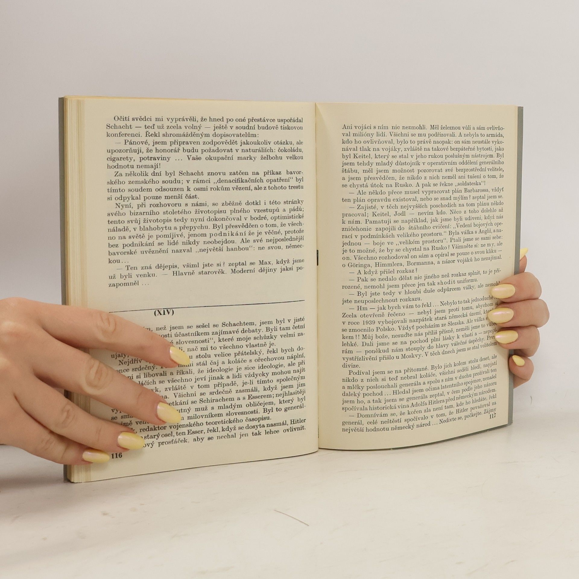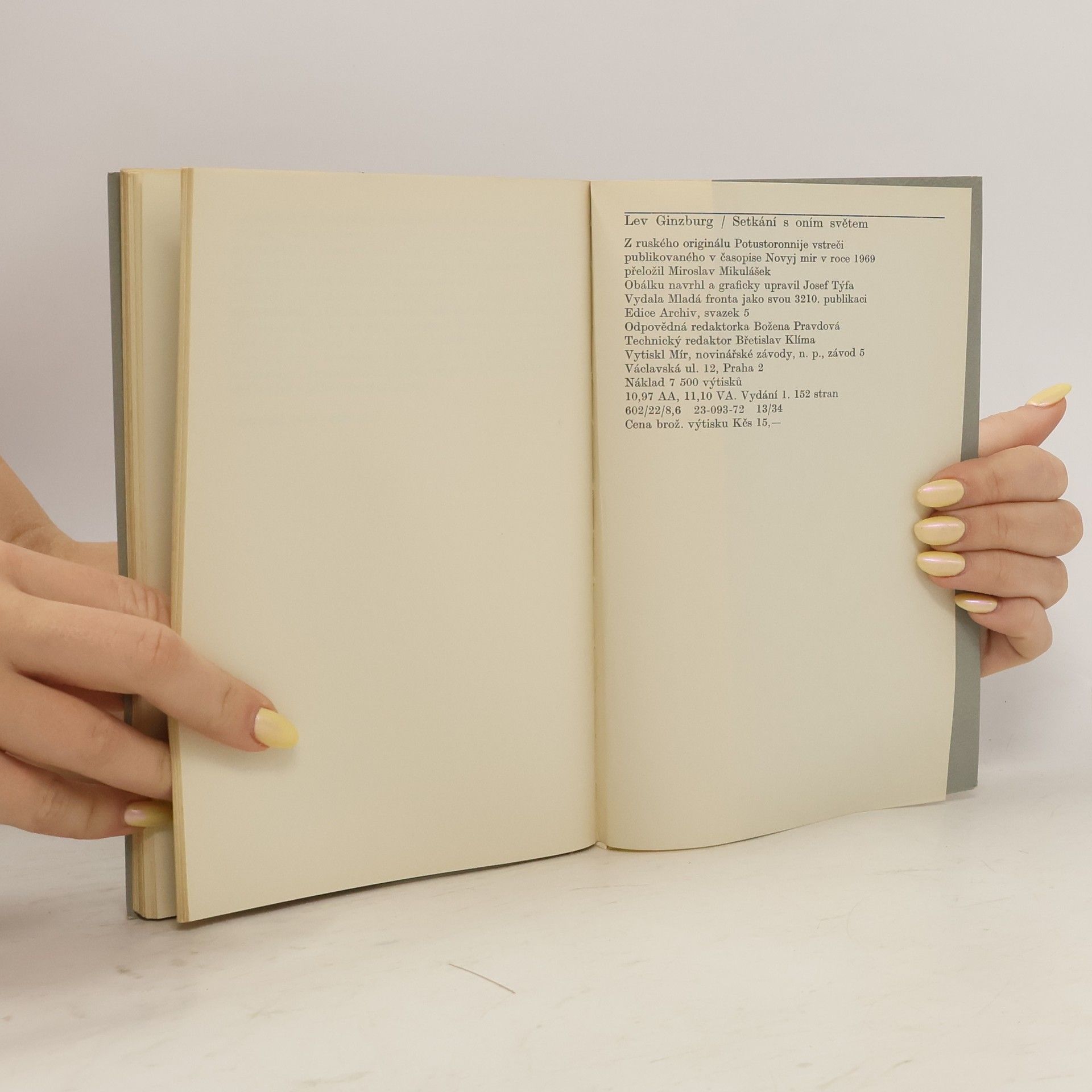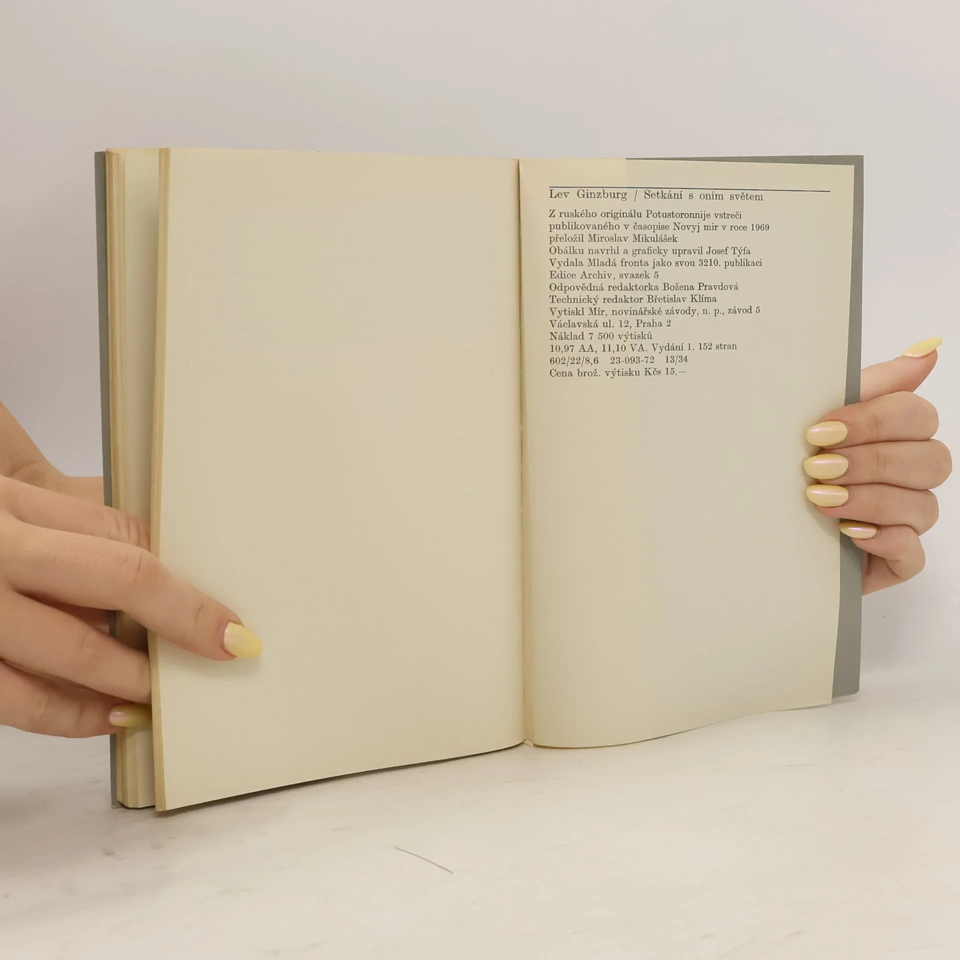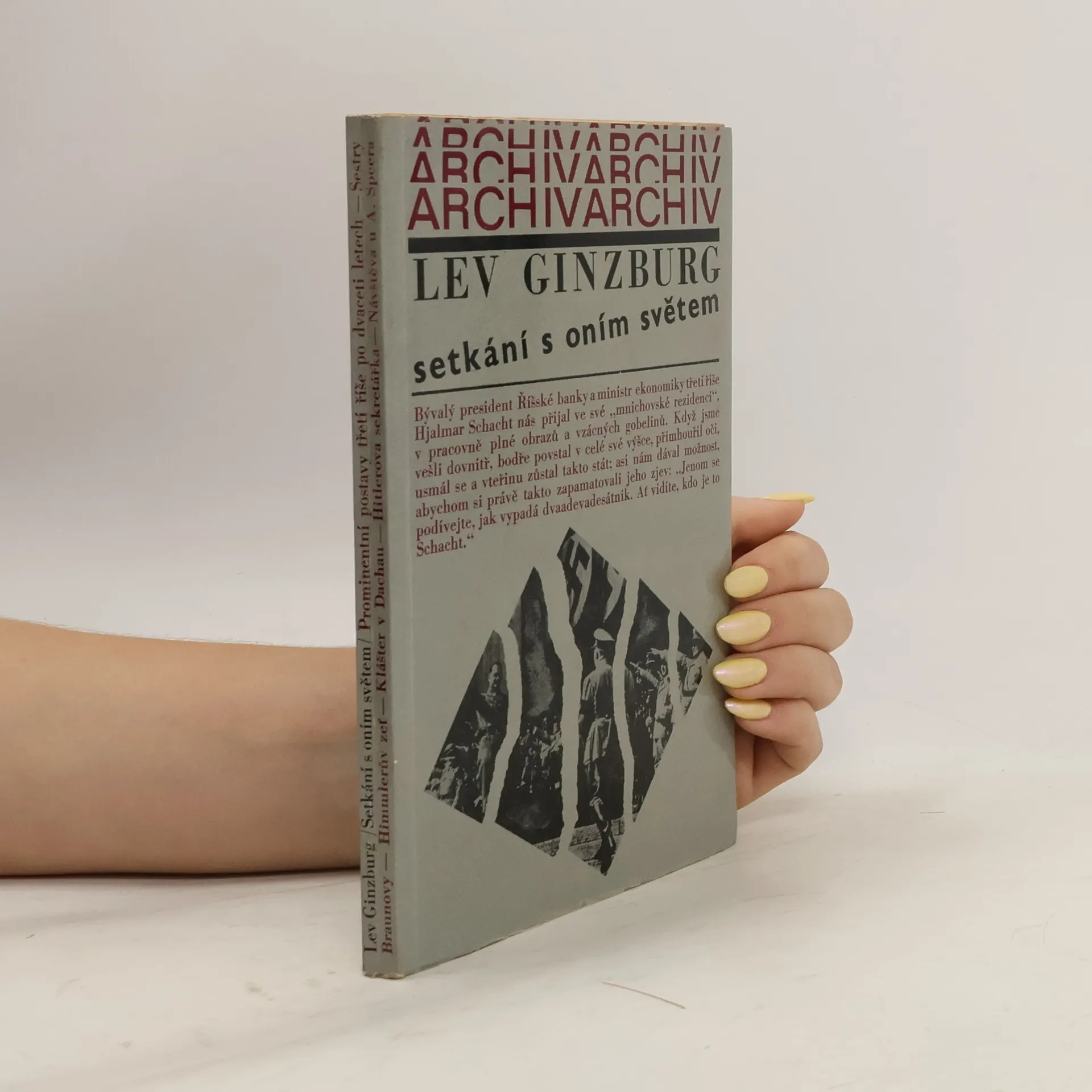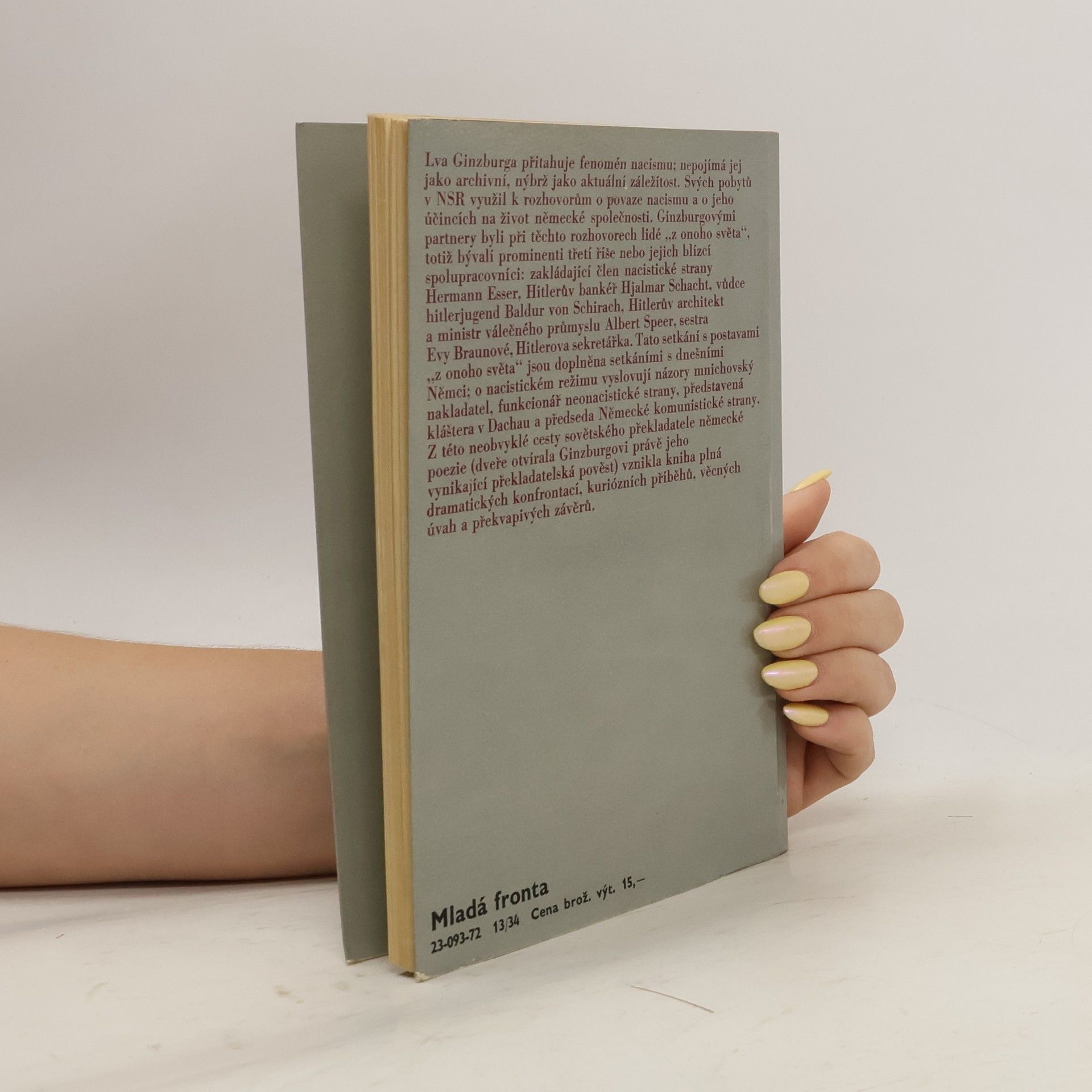 "Oním světem" jsou myšleny významné osoby hitlerovského Německa, s nimiž se při své návštěvě Německé spolkové republiky setkal autor, sovětský germanista a překladatel. Téměř pětadvacet let po vojenské porážce nacismu vyhledal Ginzburg Hitlerova ministra válečného průmyslu Alberta Speera, bývalého presidenta Říšské banky Hjalmara Schachta, vůdce Hitlerjugend Baldura von Schiracha, sestru Evy Braunové a další, aby se jich zeptal, jak se dívají na nacismus dnes i na svou účast v něm. Autor zachycuje také rozhovory s dnešními Němci a působivě konfrontuje jejich názory a postoje s hodnocením bývalých prominentů. Z ruského originálu Potustoronnije vstreči publikovaného v časopise Novyj mir v roce 1969 přeložil Miroslav Mikulášek. Vydání 1.
