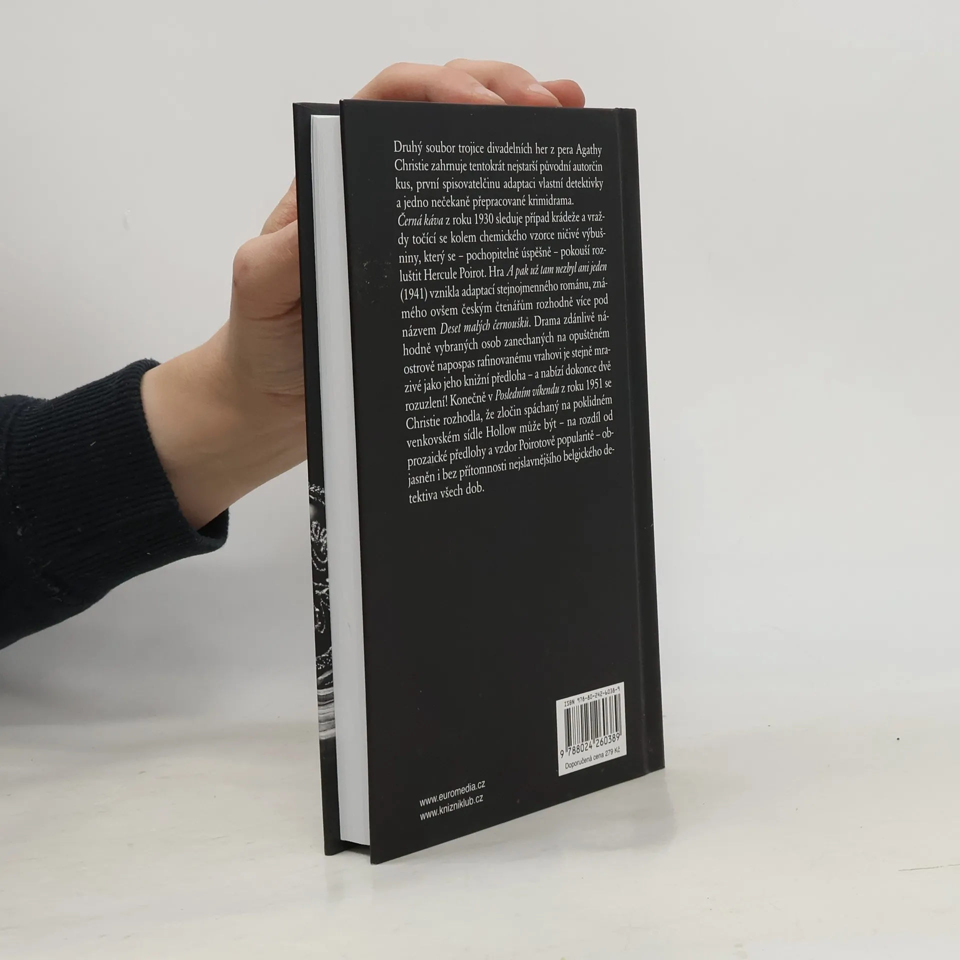 Druhý soubor trojice divadelních her z pera Agathy Christie zahrnuje tentokrát nejstarší původní autorčin kus, první spisovatelčinu adaptaci vlastní detektivky a jedno velice překvapivě přepracované krimidrama. Černá káva z roku 1930 sleduje případ krádeže a vraždy točící se kolem chemického vzorce ničivé výbušniny, který se – pochopitelně úspěšně – pokouší rozluštit Hercule Poirot. Hra A pak už tam nezbyl ani jeden (1941) vznikla adaptací stejnojmenného románu, známého ovšem rozhodně více pod názvem Deset malých černoušků – drama zdánlivě náhodně vybraných osob zanechaných na opuštěném ostrově napospas rafinovanému vrahovi je stejně mrazivé jako jeho knižní předloha. A v Posledním víkendu z roku 1951 se Christie rozhodla, že zločin spáchaný na poklidném venkovském sídle Hollow, může být – na rozdíl od prozaické předlohy – objasněn i bez přítomnosti nejslavnějšího belgického detektiva všech dob.