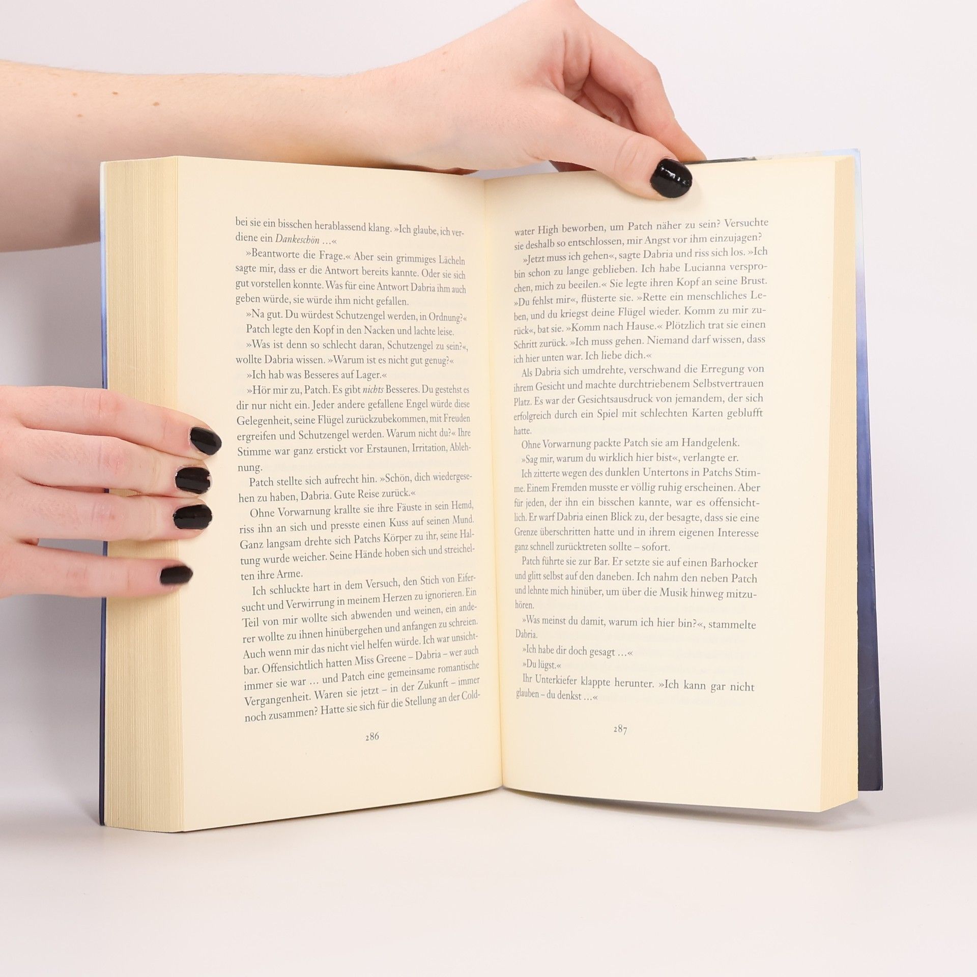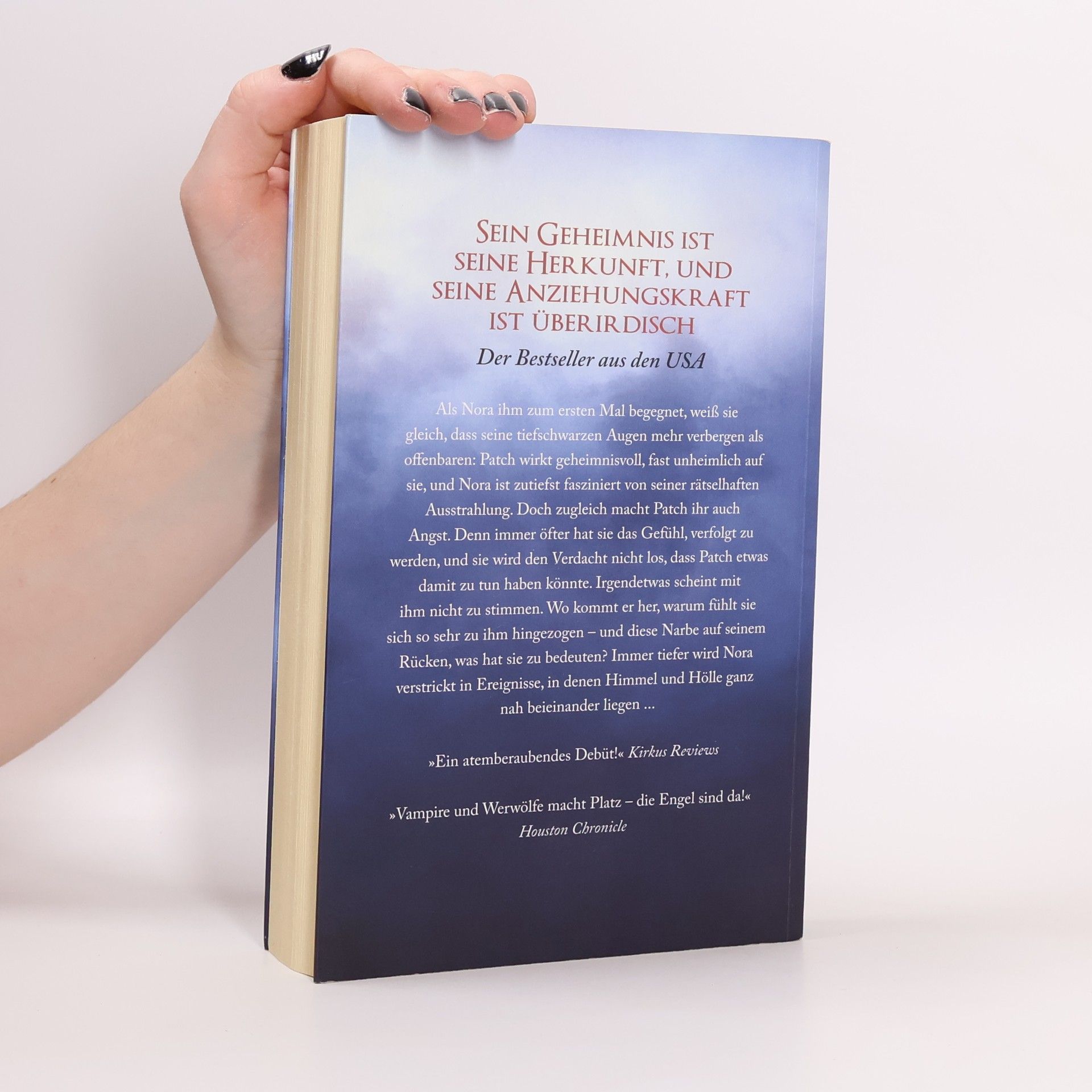 Der Himmel muss warten. Als Nora ihm zum ersten Mal begegnet, weiß sie gleich, dass seine tiefschwarzen Augen mehr verbergen als offenbaren: Patch wirkt geheimnisvoll, fast unheimlich auf sie, und Nora ist zutiefst fasziniert von seiner rätselhaften Ausstrahlung. Doch zugleich macht Patch ihr auch Angst. Denn immer öfter hat sie das Gefühl, verfolgt zu werden, und sie wird den Verdacht nicht los, dass Patch etwas damit zu tun haben könnte. Irgendetwas scheint mit ihm nicht zu stimmen. Wo kommt er her, warum fühlt sie sich so sehr zu ihm hingezogen - und diese Narbe auf seinem Rücken, was hat sie zu bedeuten? Immer tiefer wird Nora verstrickt in Ereignisse, in denen Himmel und Hölle ganz nah beieinander liegen.