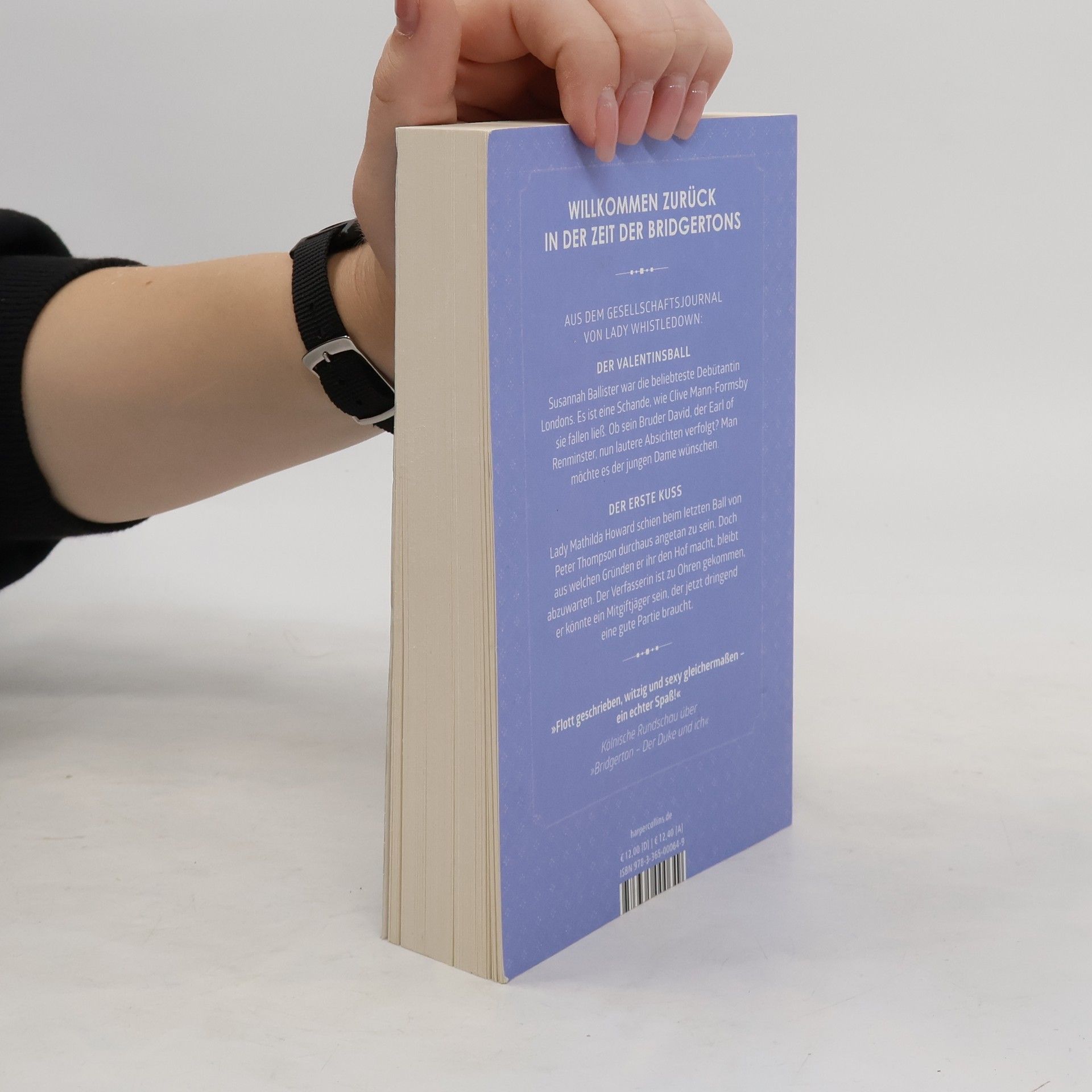 Der Valentinsball Susannah Ballister war die beliebteste Debütantin Londons. Es ist eine Schande, wie Clive Mann-Formsby sie fallen ließ. Ob sein Bruder David, der Earl of Renminster, nun lautere Absichten verfolgt? Man möchte es der jungen Dame wünschen. Der erste Kuss Lady Mathilda Howard schien beim letzten Ball von Peter Thompson durchaus angetan zu sein. Doch aus welchen Gründen er ihr den Hof macht, bleibt abzuwarten. Der Verfasserin ist zu Ohren gekommen, er könnte ein Mitgiftjäger sein, der jetzt dringend eine gute Partie braucht. Ihre Lady Whistledown, die wie immer verspricht, über die neusten Ereignisse zu berichten.