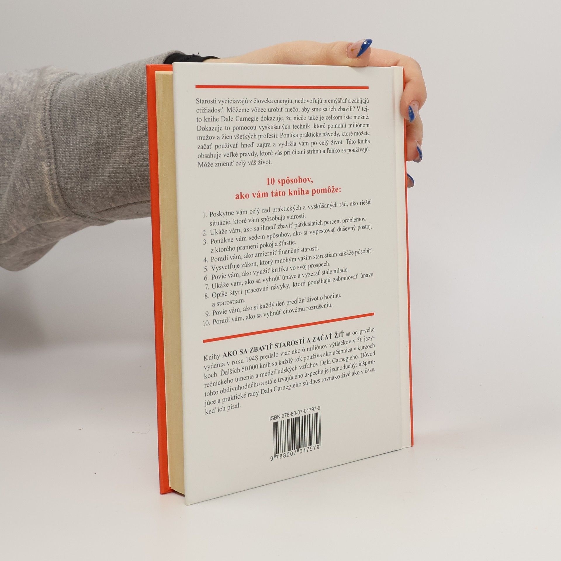 Starosti vyciciavajú z človeka energiu a nedovoľujú mu premýšľať. Môžeme urobiť niečo, aby sme sa ich zbavili? Dale Carnegie v tejto knihe dokazuje, že je to možné. Ponúka overené techniky, ktoré už miliónom ľudí na celom svete pomohli zmeniť ich život. Pomocou praktických návodov sa aj vy naučíte riešiť problematické situácie, využiť kritiku vo svoj prospech či vyhnúť sa citovému rozrušeniu. Autor vám poradí, ako si vypestovať duševný postoj, z ktorého pramení pokoj a šťastie, ale aj pracovné návyky, ktoré pomáhajú zabraňovať únave.... celý text