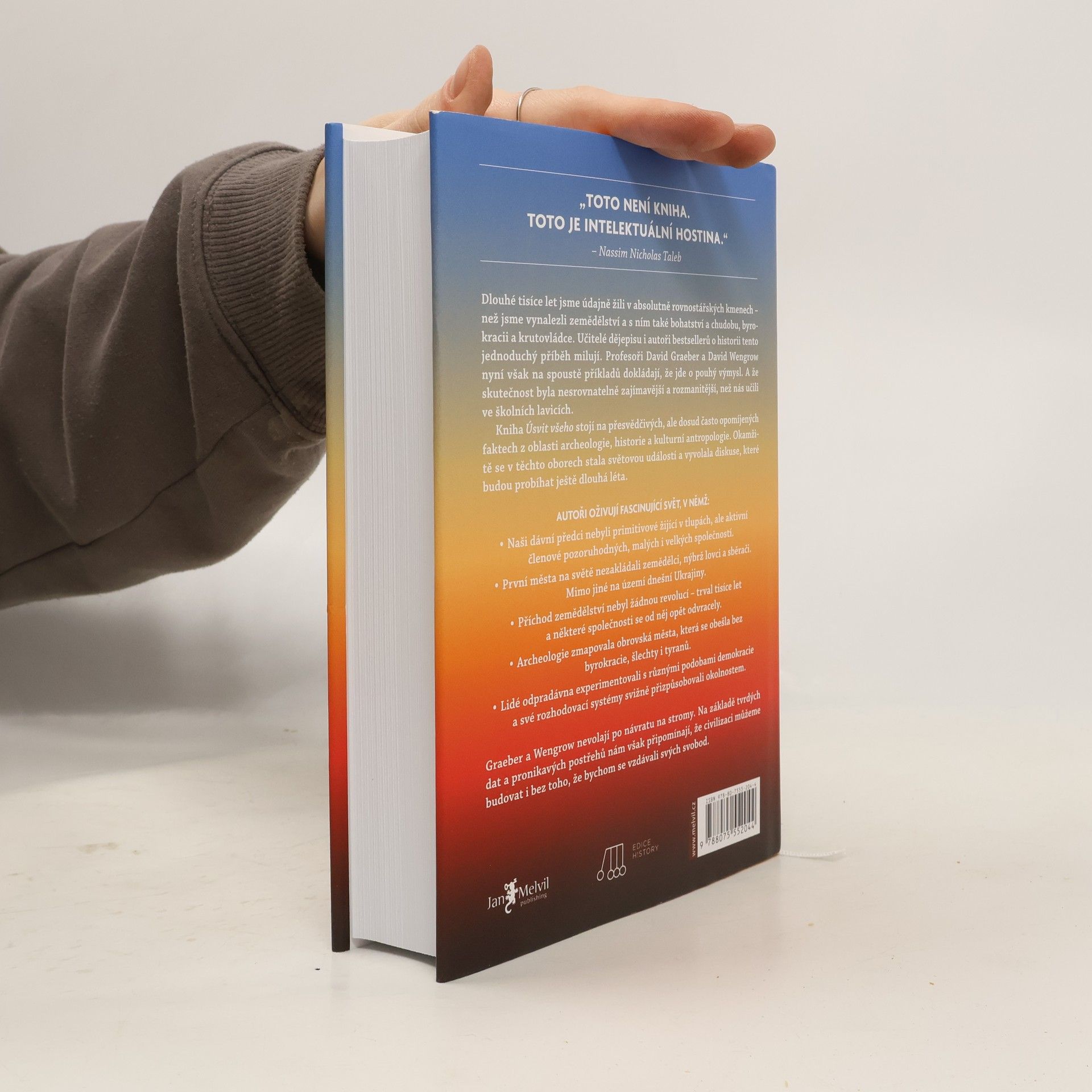 Jestliže lidé nestrávili 95 % své evoluční minulosti v malých skupinách lovců a sběračů, co celou tu dobu dělali?! Dlouhé tisíce let jsme údajně žili v absolutně rovnostářských kmenech – než jsme vynalezli zemědělství a s ním také bohatství a chudobu, byrokracii a krutovládce. Učitelé dějepisu i autoři bestsellerů o historii tento jednoduchý příběh milují. Profesoři David Graeber a David Wengrow nyní však na spoustě příkladů dokládají, že jde o pouhý výmysl. A že skutečnost byla nesrovnatelně zajímavější a rozmanitější, než nás učili ve školních lavicích. Kniha Úsvit všeho stojí na přesvědčivých, ale dosud často opomíjených faktech z oblasti archeologie, historie a kulturní antropologie. Okamžitě se v těchto oborech stala světovou událostí a vyvolala diskuse, které budou probíhat ještě dlouhá léta.