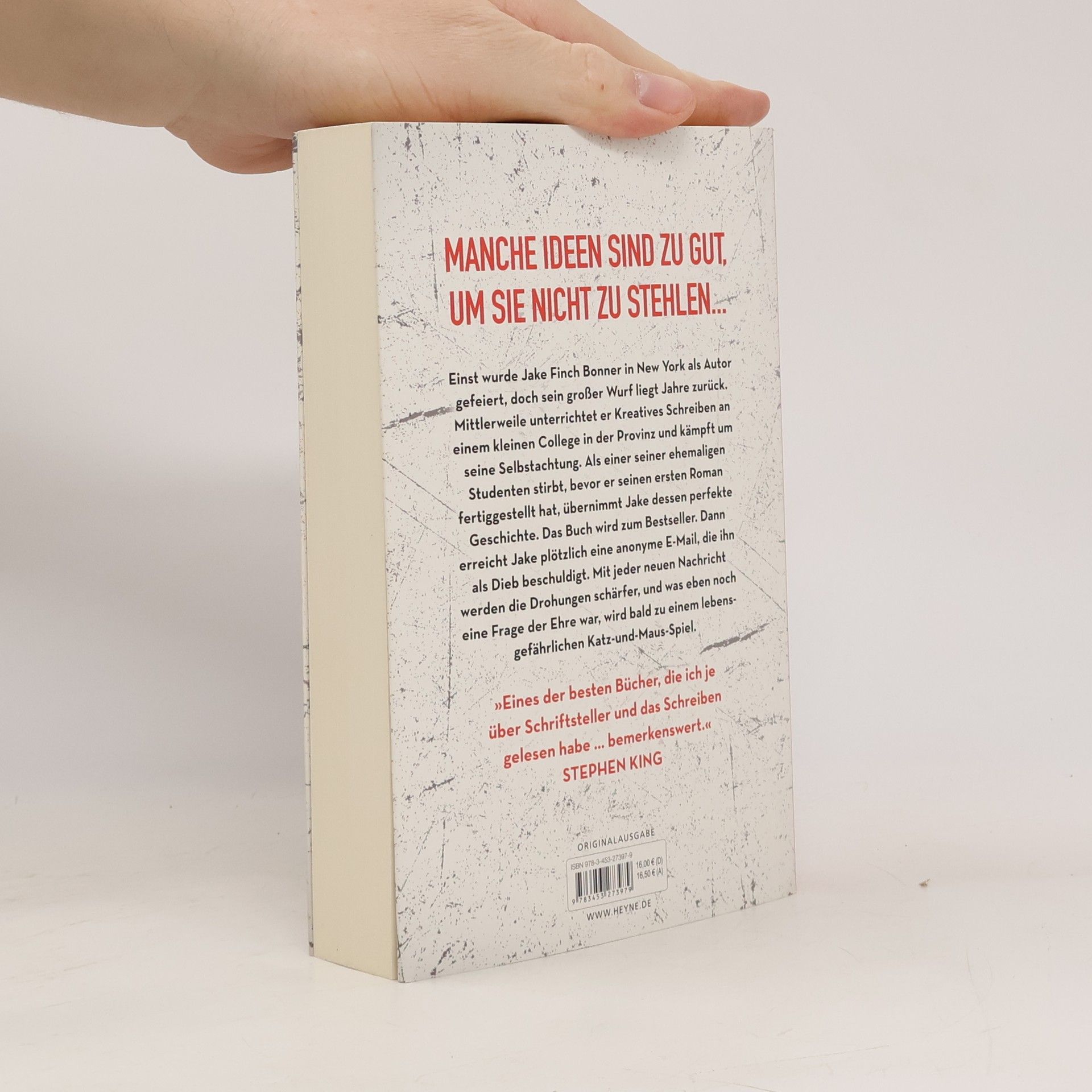 Der New-York-Times-Bestseller: klug, überraschend, nervenaufreibend spannend Einst wurde Jake Finch Bonner in New York als Autor gefeiert. Doch sein großer Wurf liegt Jahre zurück und mittlerweile unterrichtet er Kreatives Schreiben an einem kleinen College in der Provinz. Als einer seiner ehemaligen Studenten stirbt, bevor er seinen ersten Roman fertiggestellt hat, übernimmt Jake dessen perfekte Geschichte. Das Buch wird über Nacht zum Bestseller. Dann erreicht Jake plötzlich eine anonyme E-Mail, die nur einen Satz enthält: „Du bist ein Dieb“. Mit jeder neuen Nachricht werden die Drohungen schärfer, und was eben noch eine Frage der Ehre und Karriere war, wird bald zu einem lebensgefährlichen Katz-und-Maus-Spiel. „Wahnsinnig lesenswert“ Stephen King Manche Ideen sind zu gut, um sie nicht zu stehlen... „Wenn Sie Bücher mögen, in denen eine einzige falsche Entscheidung einen unkontrollierbaren Schneeballeffekt auslöst, dann ist das hier genau das Richtige. Was für eine spektakuläre Lawine.“ New York Times Für Fans von Donna Tartt und Joël Dicker Serienverfilmung mit Oscarpreisträger Mahershala Ali in Planung Der New-York-Times-Bestseller: klug, überraschend, nervenaufreibend spannend