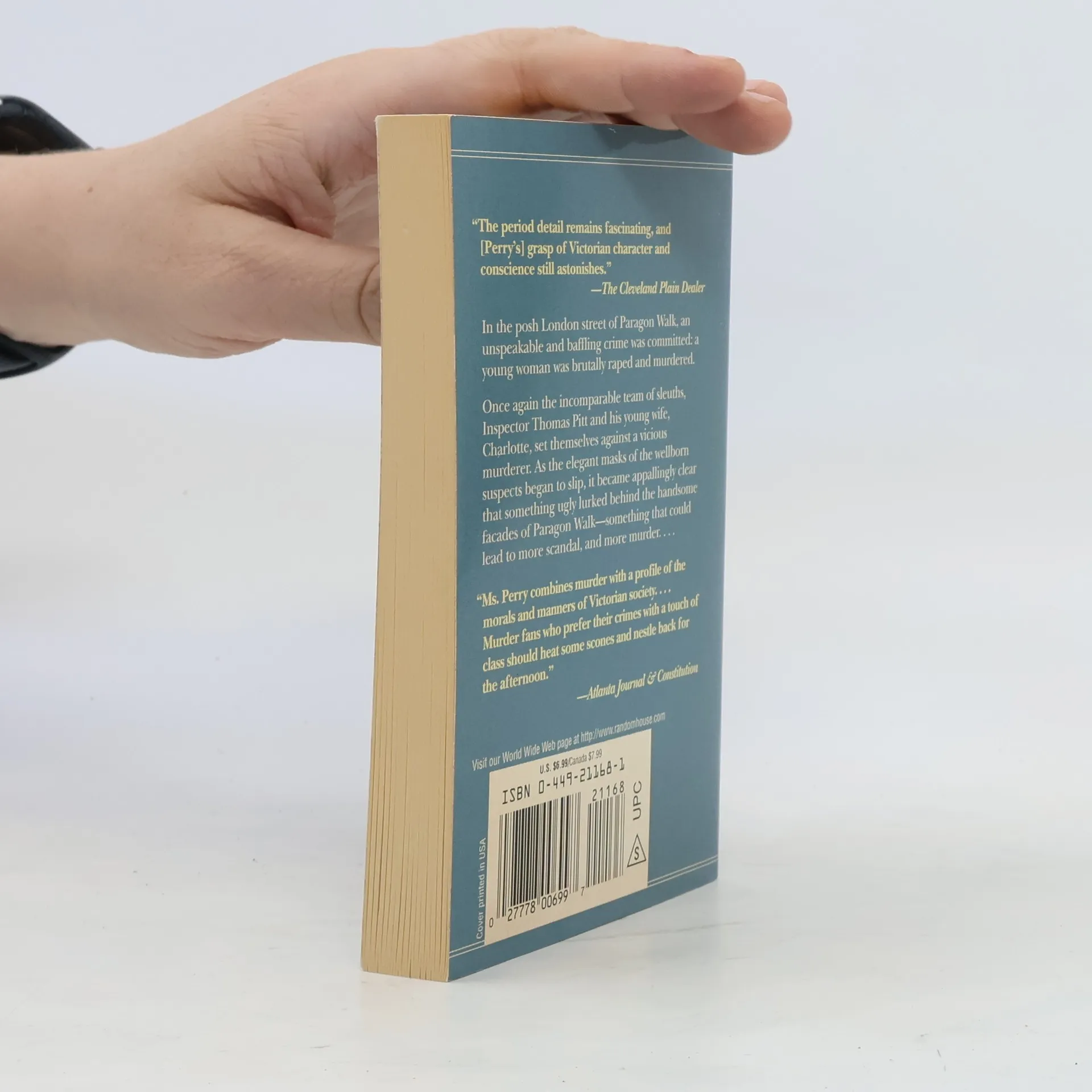 In the posh London street of Paragon Walk, a young woman is brutally raped and murdered. Once again the incomparable team of sleuths, Inspector Thomas Pitt and his young wife, Charlotte, peer beneath the elegant masks of the well-born suspects and reveal that something ugly lurks behind the handsome facades of Paragon Walk--something that could lead to more scandal, and more murder....