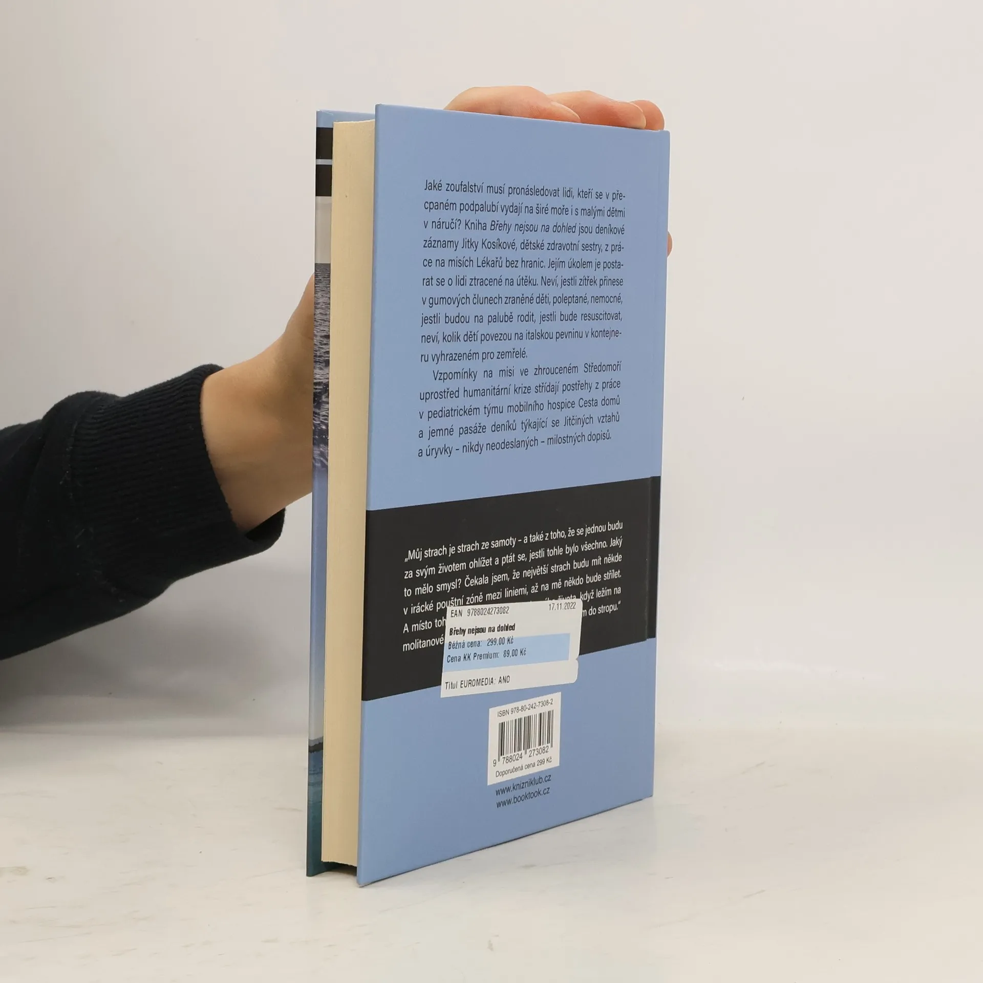 Říká se, že kdo jednou viděl zblízka smrt, dívá se už vždy na život jinak. Jitka Kosíková viděla smrt, bídu a krutost mnohokrát, v rozličných podobách. Její práce dětské sestry obnáší dělat pod časovým tlakem a ve stresujících podmínkách rozhodnutí s dlouhodobými a nevratnými následky, je na to zvyklá a přiznává, že ji to baví. Kniha Břehy nejsou na dohled jsou deníkové záznamy z práce na misích Lékařů bez hranic a v pediatrickém týmu mobilního hospice Cesta domů. Dějová linie, odehrávající se na misi ve zhrouceném Středomoří uprostřed humanitární krize, předestírá obrázek Jitky jako silné, samostatné ženy s autoritou nutnou pro práci v hostilním prostředí. Tento obrázek obrušují jemné pasáže deníků týkající se Jitčiných vztahů a úryvky – nikdy neodeslaných – dopisů. Deníkové záznamy pro vydání uspořádal a doplnil Marek Uhlíř, který funguje také jako překladatel mezi světem medicíny a čtenářem. Marek vystudoval žurnalistiku a management ve zdravotnictví, pracuje na zdravotnickém operačním středisku záchranné služby a vede výzkumný projekt na problematiku výjezdů záchranky k terminálně nemocným pacientům. V letech 2012-2018 vedl Cestu domů, kde se s Jitkou potkali.